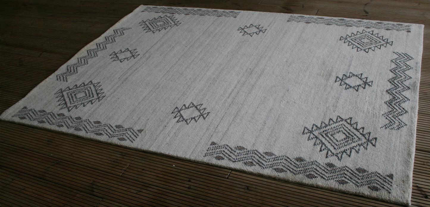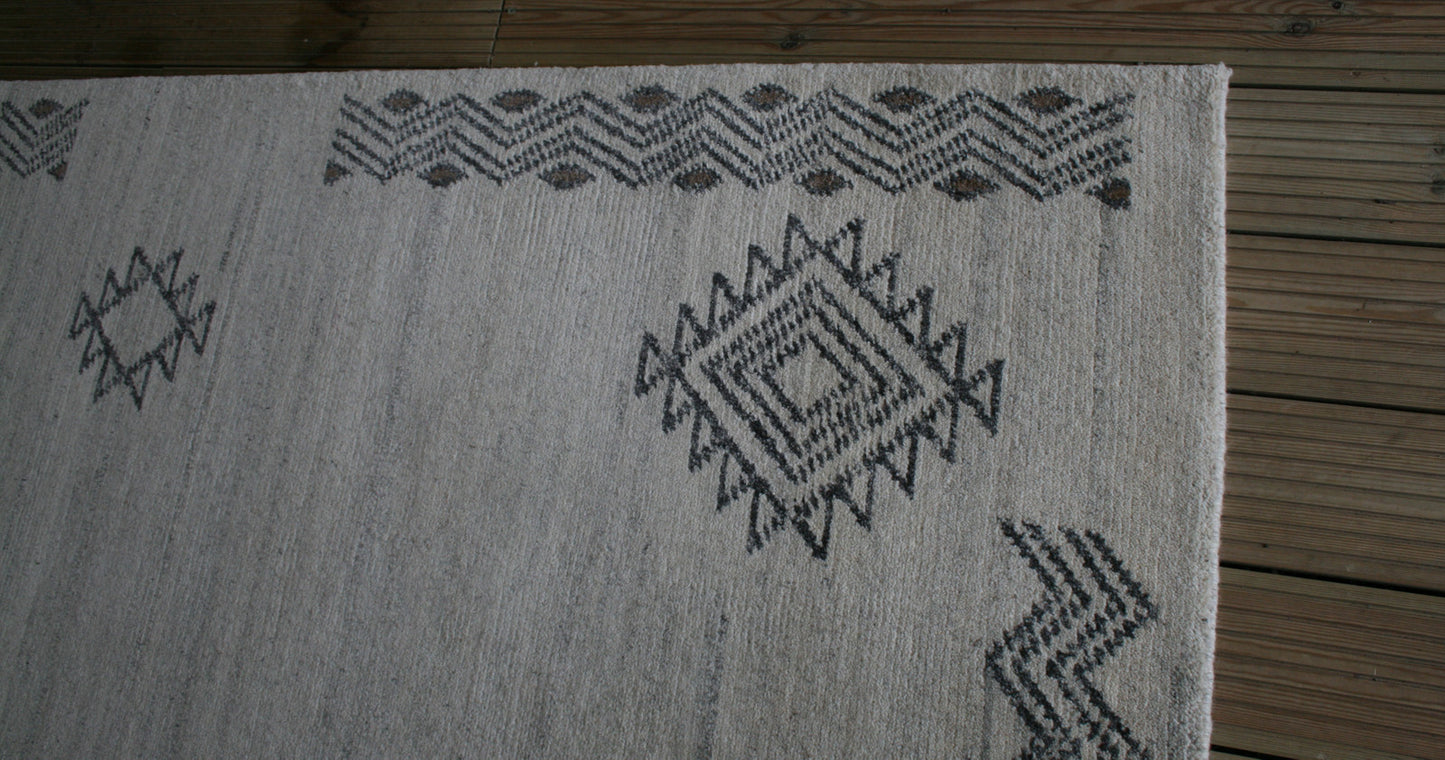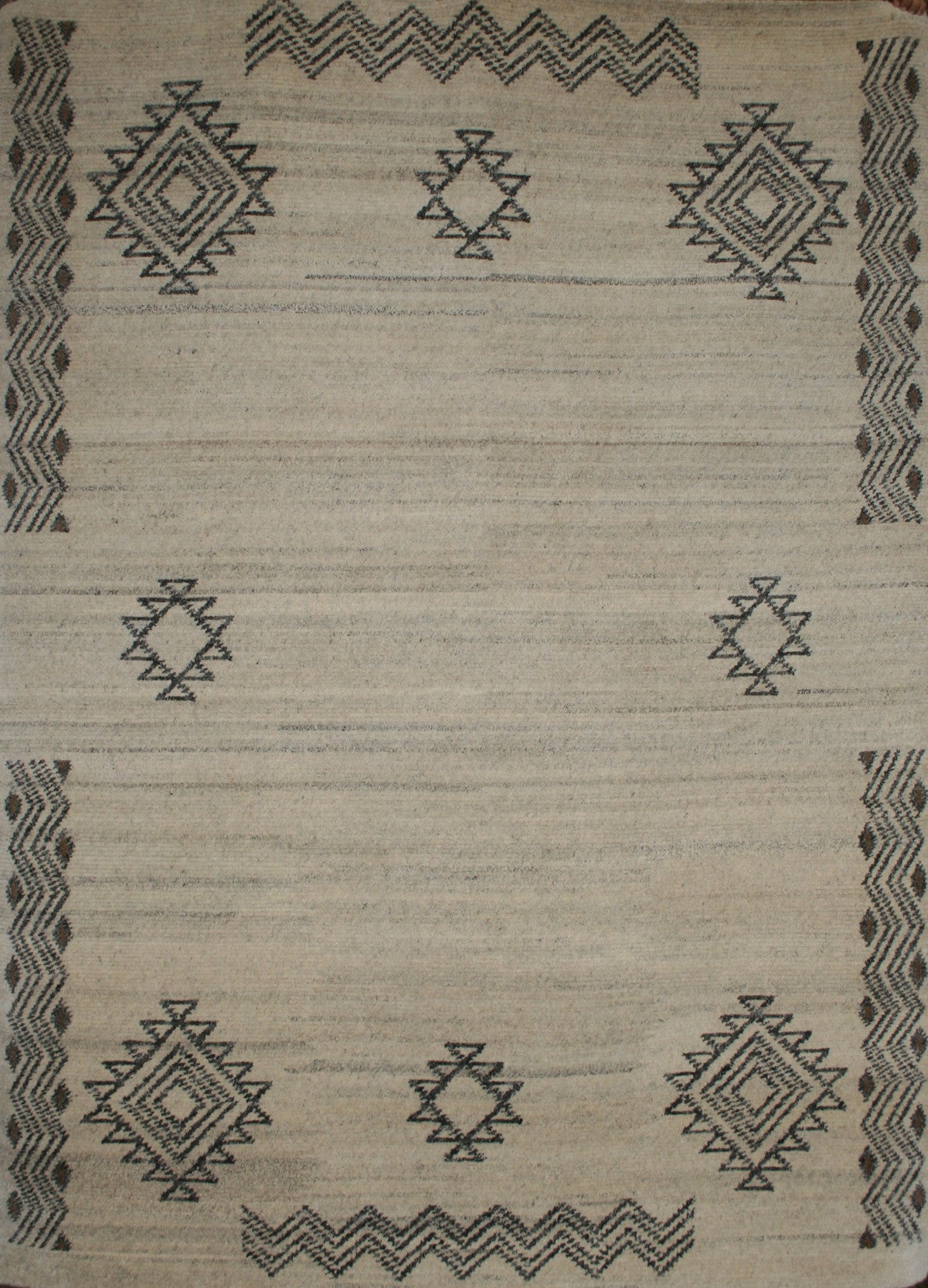 Hand-knotted in India, this Gabbeh rug captures the raw elegance of tribal design through its bold geometry and muted palette. Diamond motifs with serrated edges form an asymmetrical, open layout across a soft beige field, framed by zigzag lines that add rhythm and structure without the formality of a border.