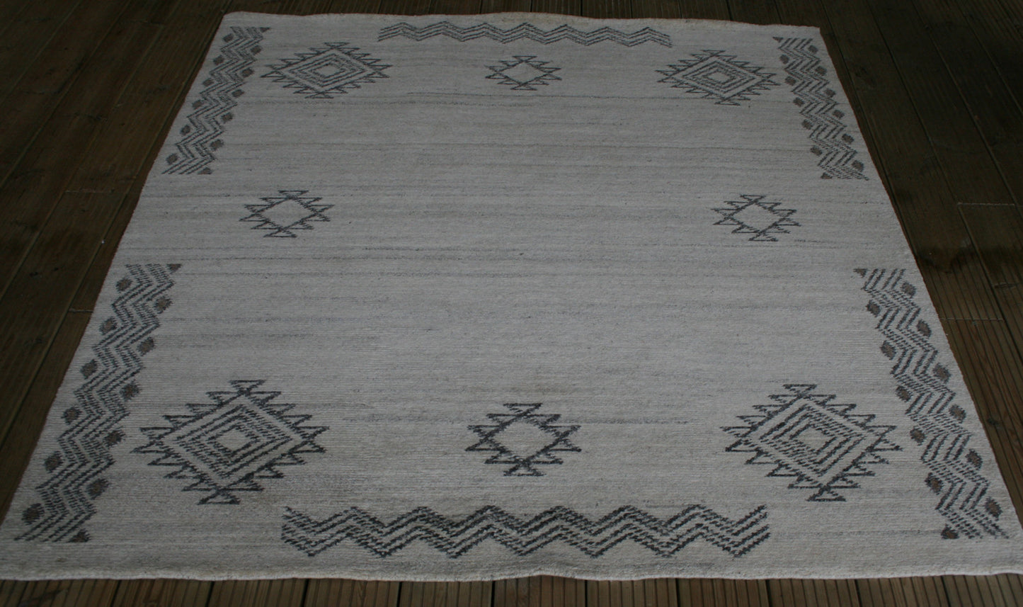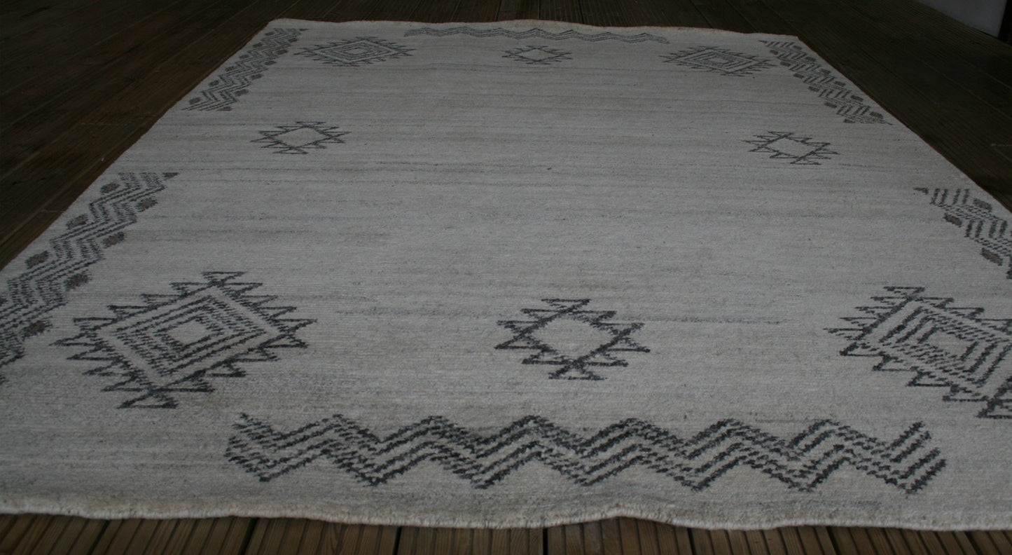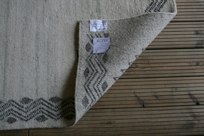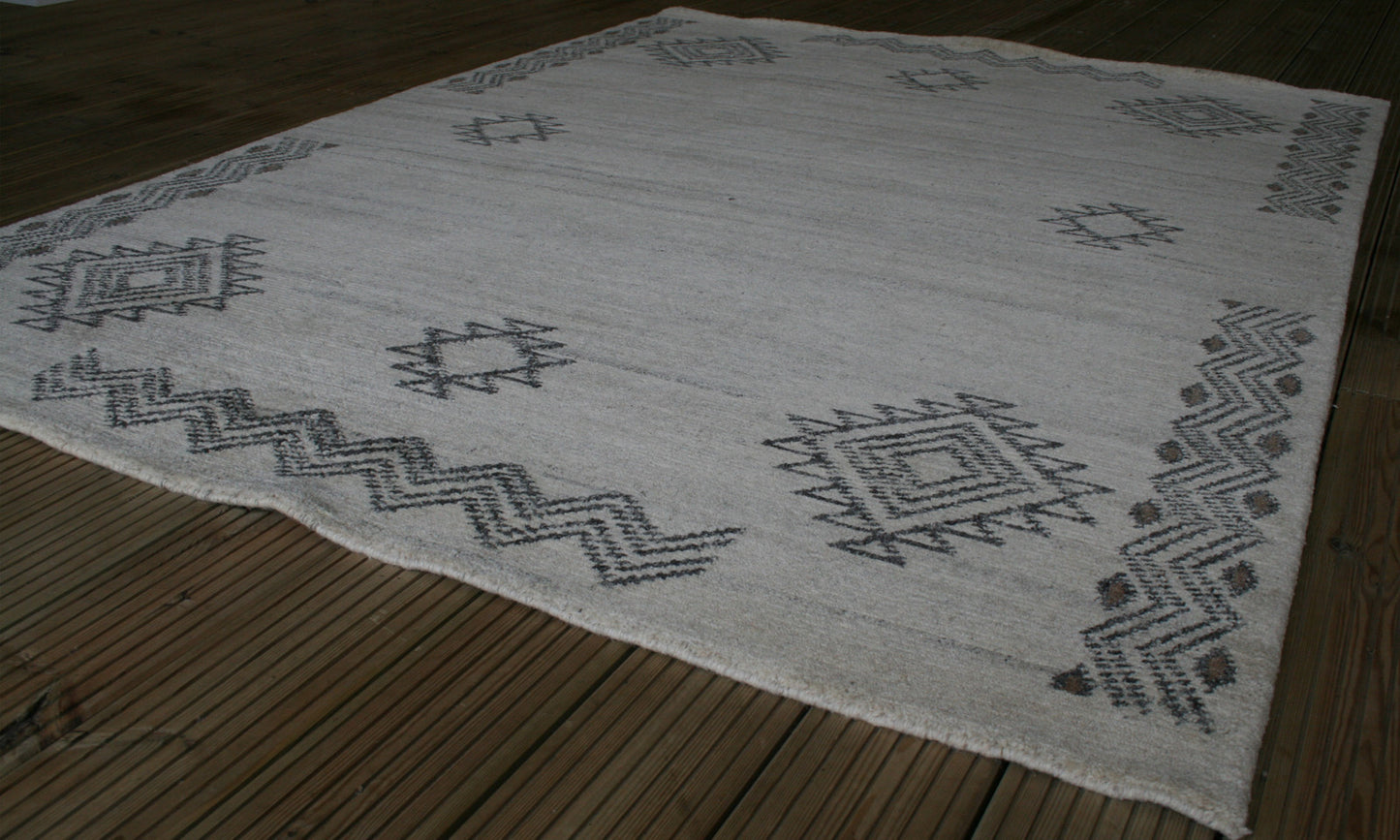 Hand-knotted in India, this Gabbeh rug captures the raw elegance of tribal design through its bold geometry and muted palette. Diamond motifs with serrated edges form an asymmetrical, open layout across a soft beige field, framed by zigzag lines that add rhythm and structure without the formality of a border.