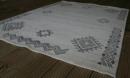 The charcoal grey motifs offer gentle contrast against the neutral ground, creating a look that is both striking and understated. Woven from wool on a cotton foundation, this piece reflects the Gabbeh tradition of simplicity and character, reimagined for contemporary interiors.