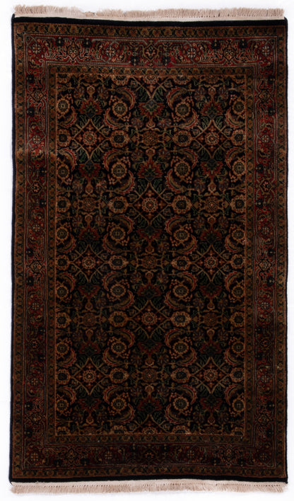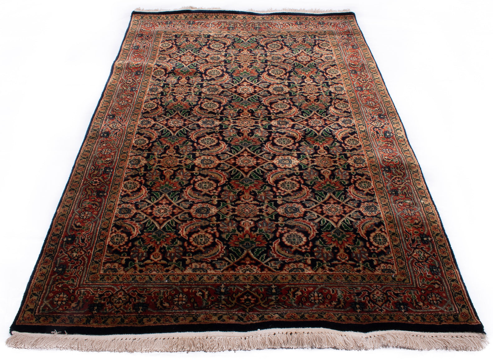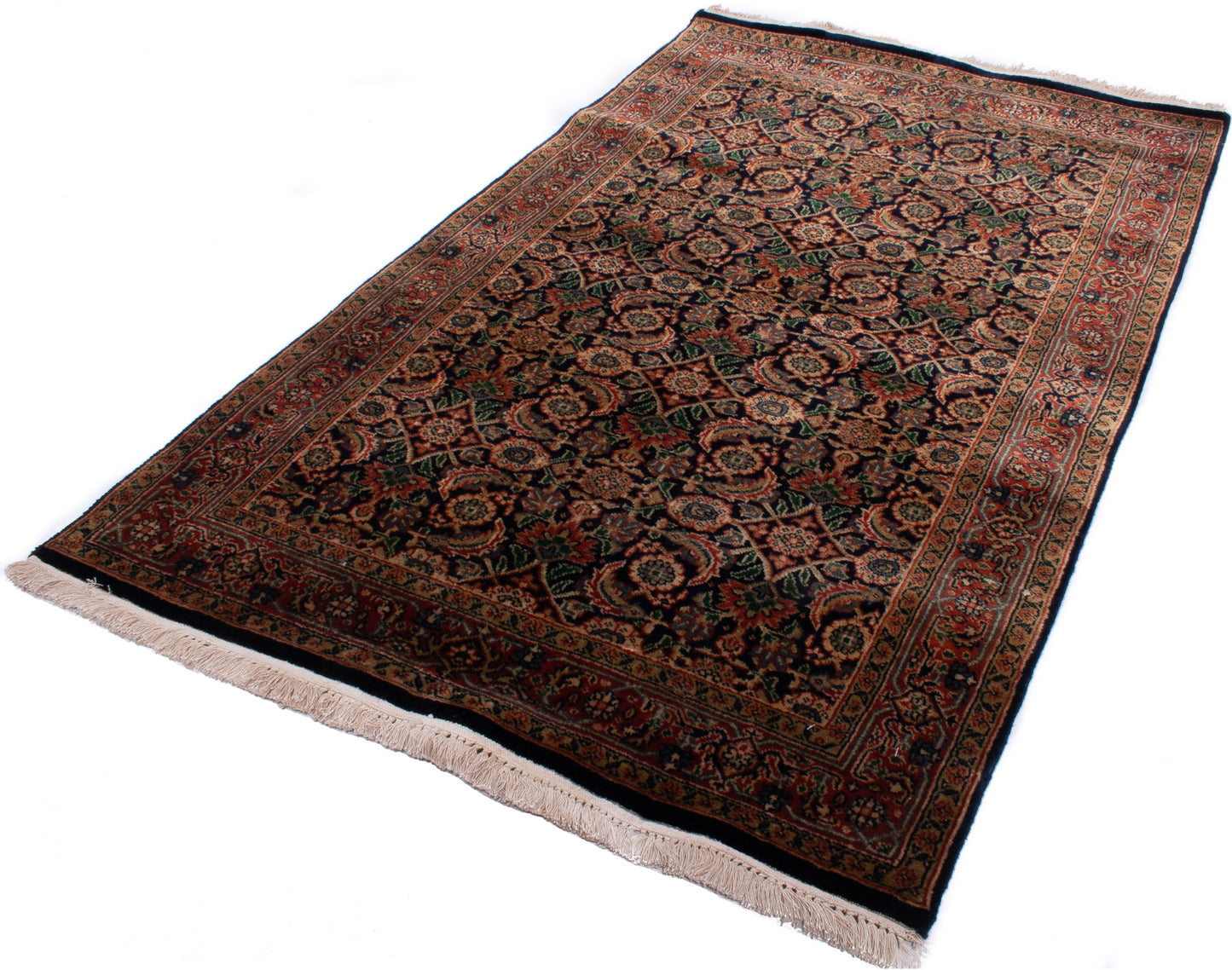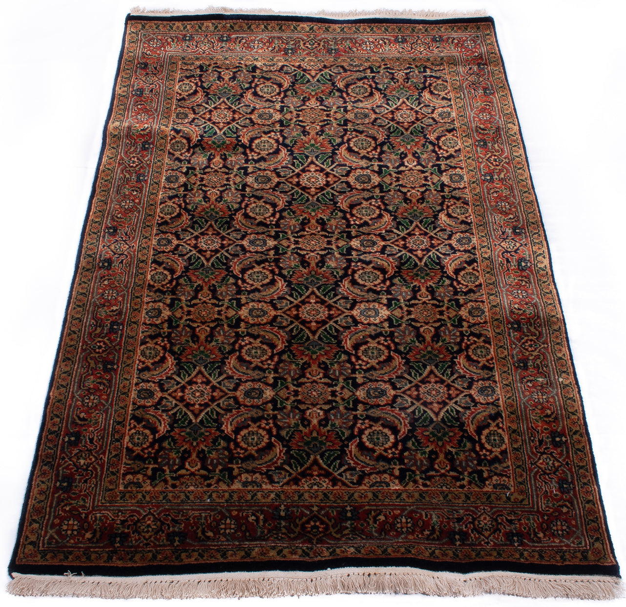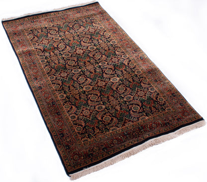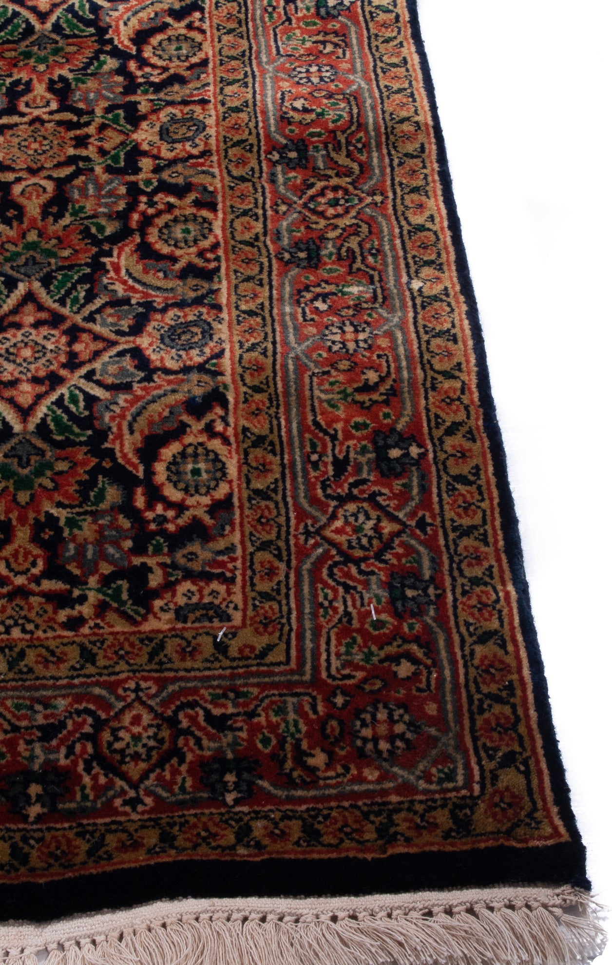 This hand-knotted Indian rug draws on the Herati design tradition, weaving floral motifs, stylised palmettes, and scrolling vines into a symmetrical, lattice-like structure. Its navy blue field is enriched with mahogany, forest green, and burnt orange accents, softened by touches of ivory and dusty rose.