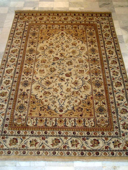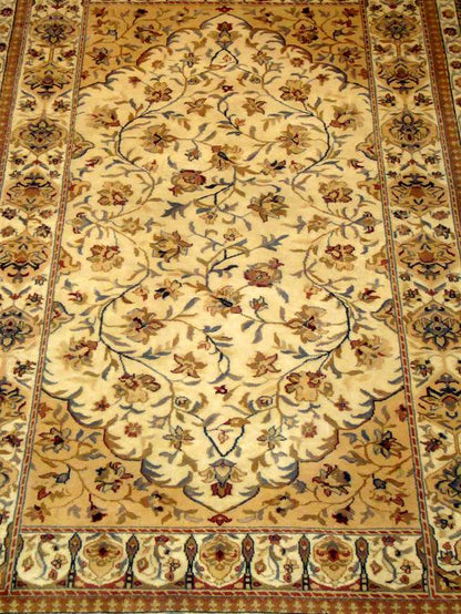 This hand-knotted Indian Kashan rug offers a gentle interplay of floral motifs and earthy tones, making it a versatile choice for traditional and transitional interiors. Its all-over design, free from a central medallion, creates a sense of balance and continuity, with scrolling vines and stylised blossoms flowing seamlessly across the field.