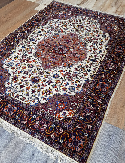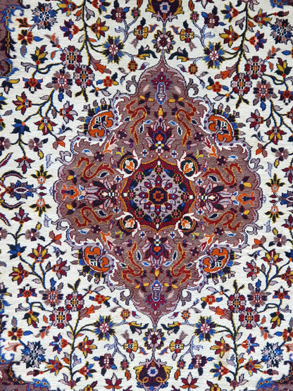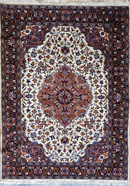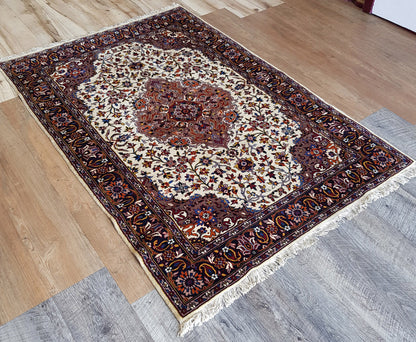The rug's intricate design features a central medallion pattern, surrounded by a harmonious array of floral motifs that are emblematic of the Kashmir style. The palette is a sophisticated blend of deep burgundy, ivory, and subtle hints of blue and orange, creating a visually captivating tapestry. The border is adorned with a series of floral and vine motifs, providing a frame that enhances the rug's central artistry. The high knot density allows for a detailed and vibrant representation of these traditional patterns, contributing to the rug's overall elegance.