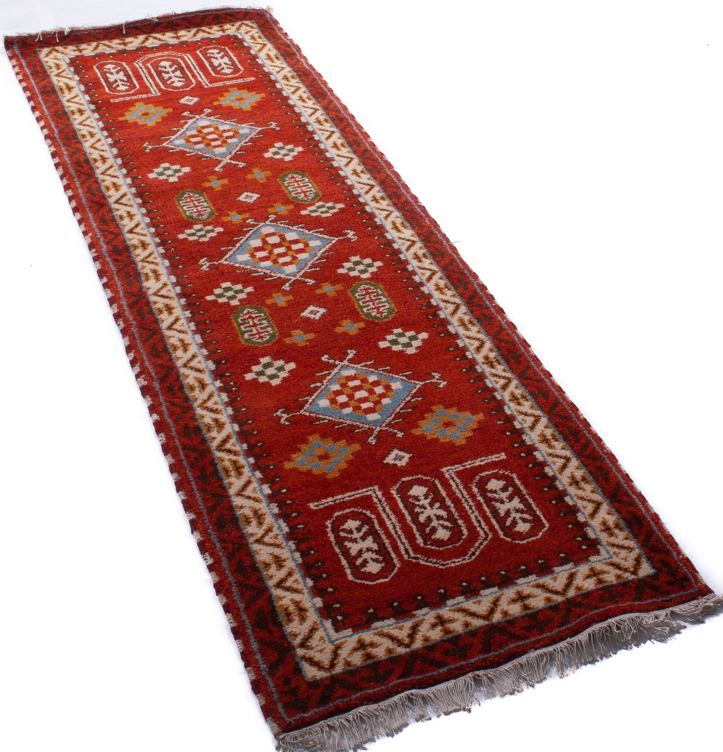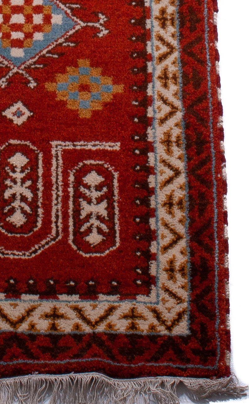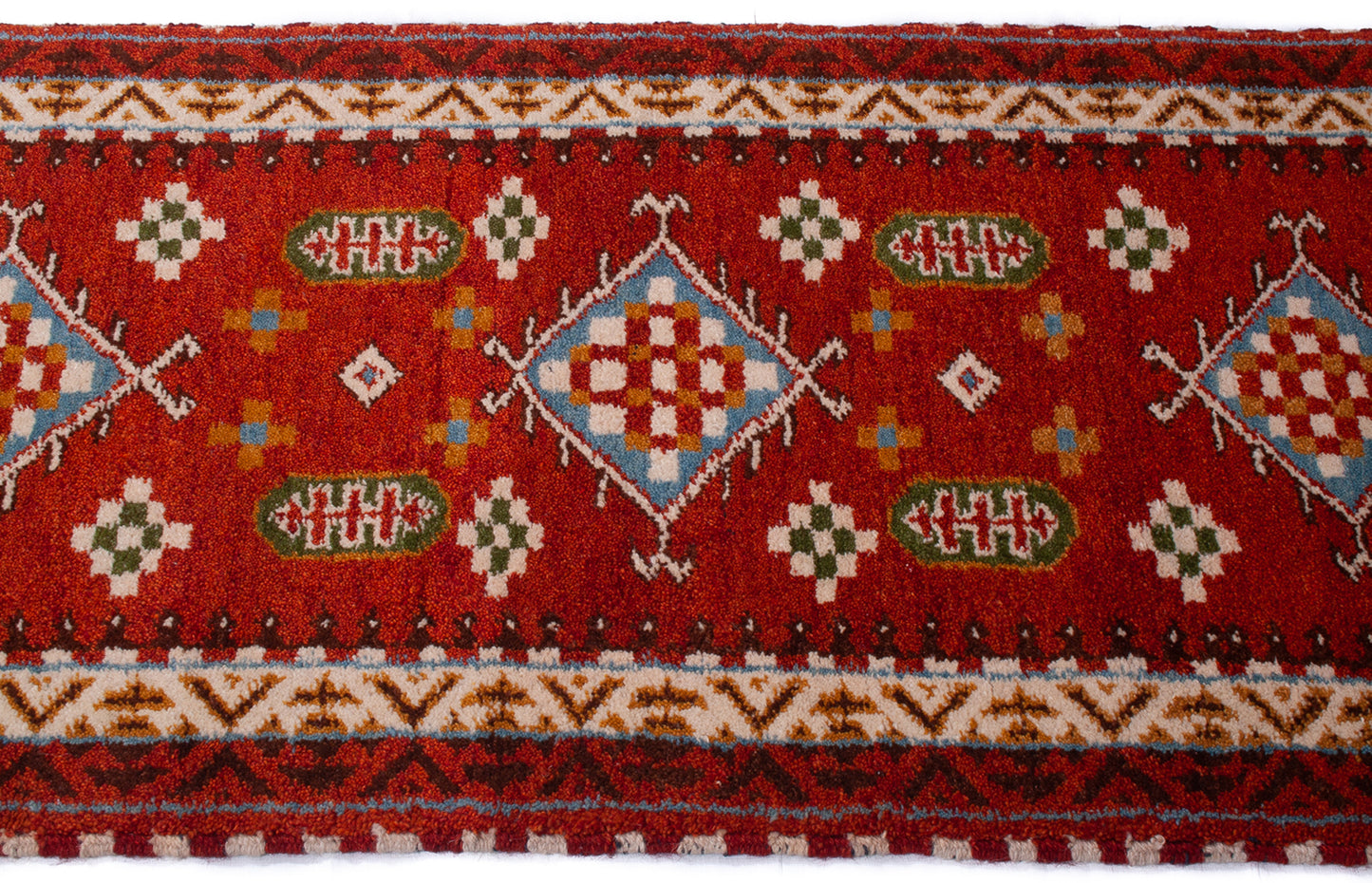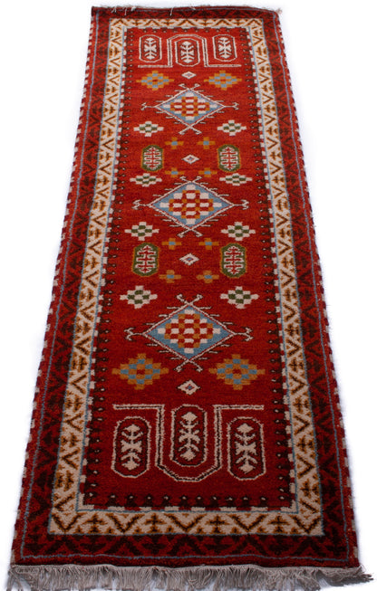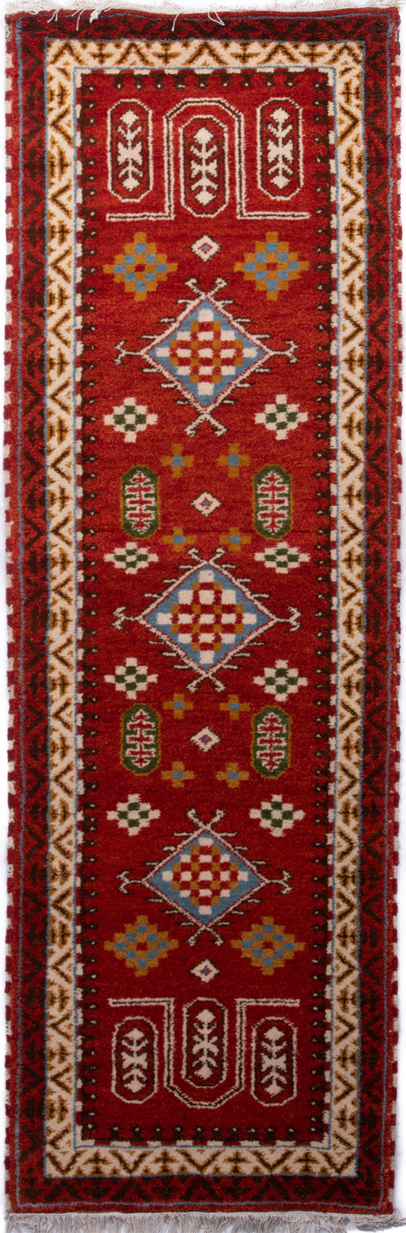 Echoing the bold tribal aesthetics of Caucasian weaving, this Indian Kazak runner brings symmetry and strength to hallways and transitional spaces. Its repeat medallion layout features diamond-shaped motifs with checkerboard interiors, flanked by stylised leaves and angular forms that enhance its geometric clarity.