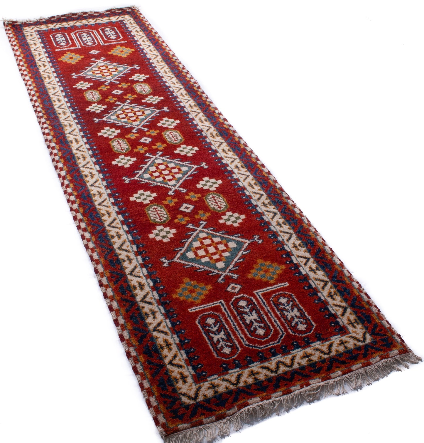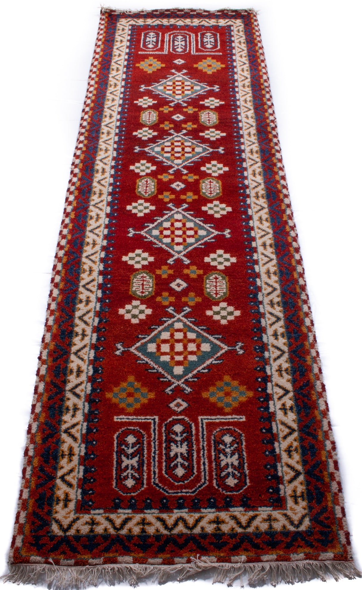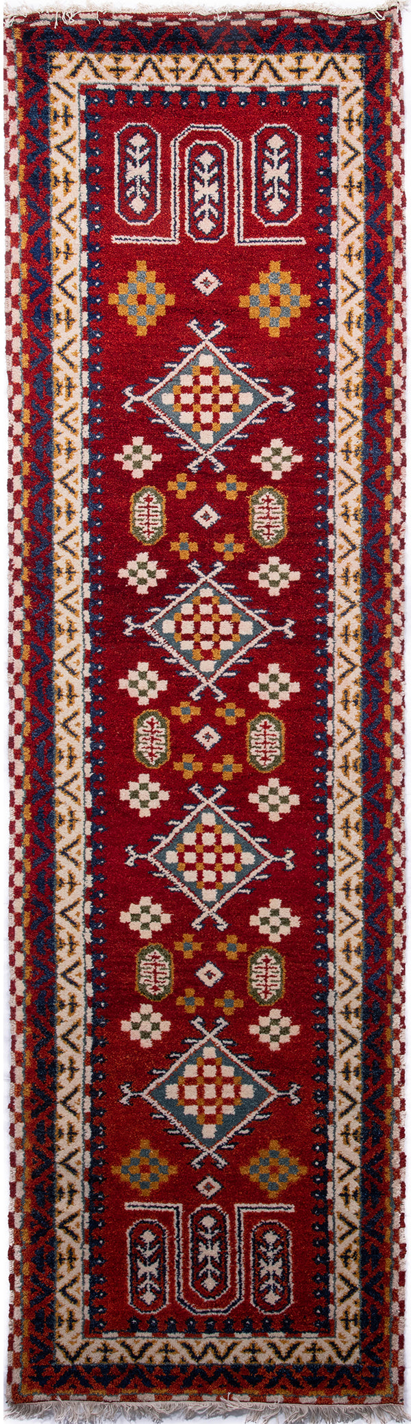 Hand-knotted in India, this Kazak runner channels the bold geometry and tribal spirit of Caucasian rug design into a practical, character-rich format. Its repeat medallion layout features diamond-shaped motifs adorned with serrated leaves, cross forms, and stylised floral elements, arranged in a mirrored, orderly sequence that speaks to tradition and symmetry.