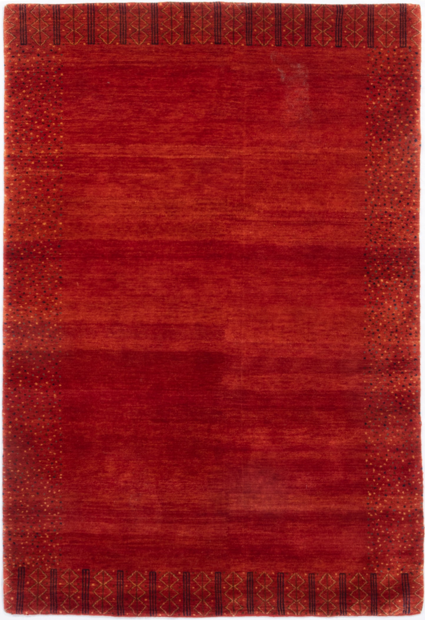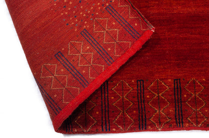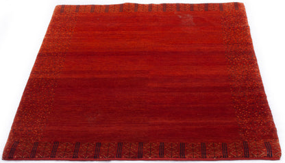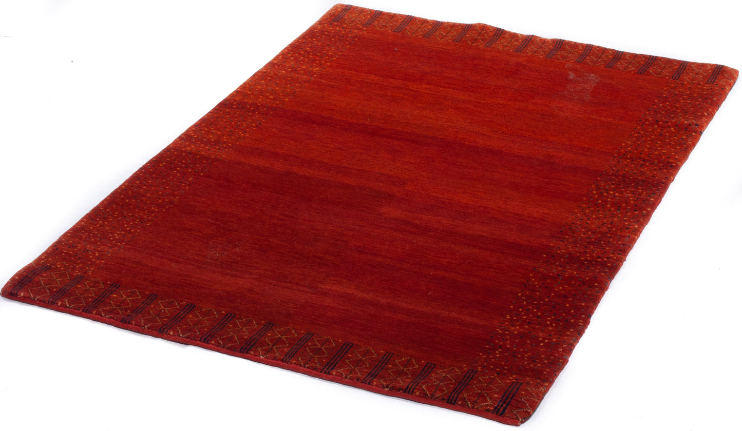 The deep red field creates a bold yet understated presence, softened by the tonal border and subtle geometric accents in dark brown and black. Guard bands add structure, guiding the eye inward without disrupting the rug’s quiet balance.