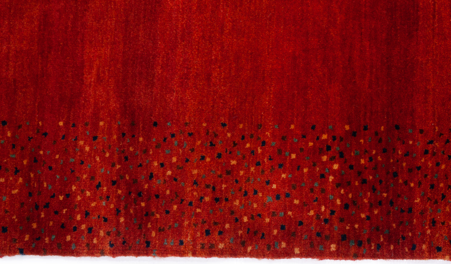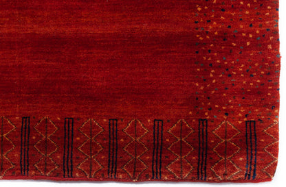 Hand-knotted in India, this Lori Baft Gabbeh rug embraces the beauty of simplicity. Its open field design, framed by zigzag lines and dotted motifs, reflects the tribal roots of Gabbeh weaving—where form follows instinct and every detail serves a purpose.