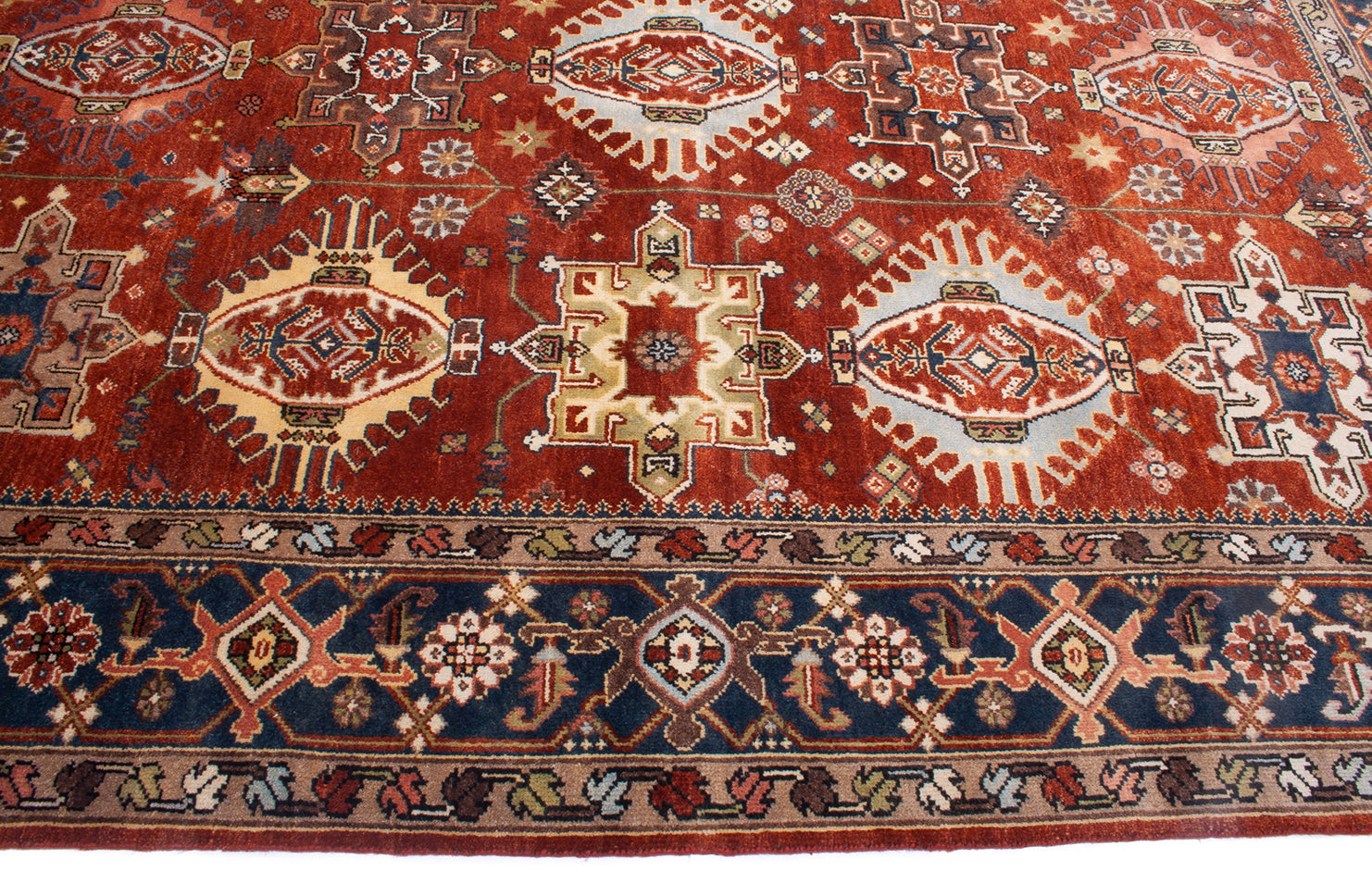 Hand-knotted in India, this Serapi rug channels the bold geometry and tribal character of Persian Heriz weaving into a striking repeat medallion design. A series of octagram stars, serrated leaves, and stylised floral elements are arranged symmetrically across the rust red field, creating a rhythmic, mirrored composition that blends strength with decorative detail.