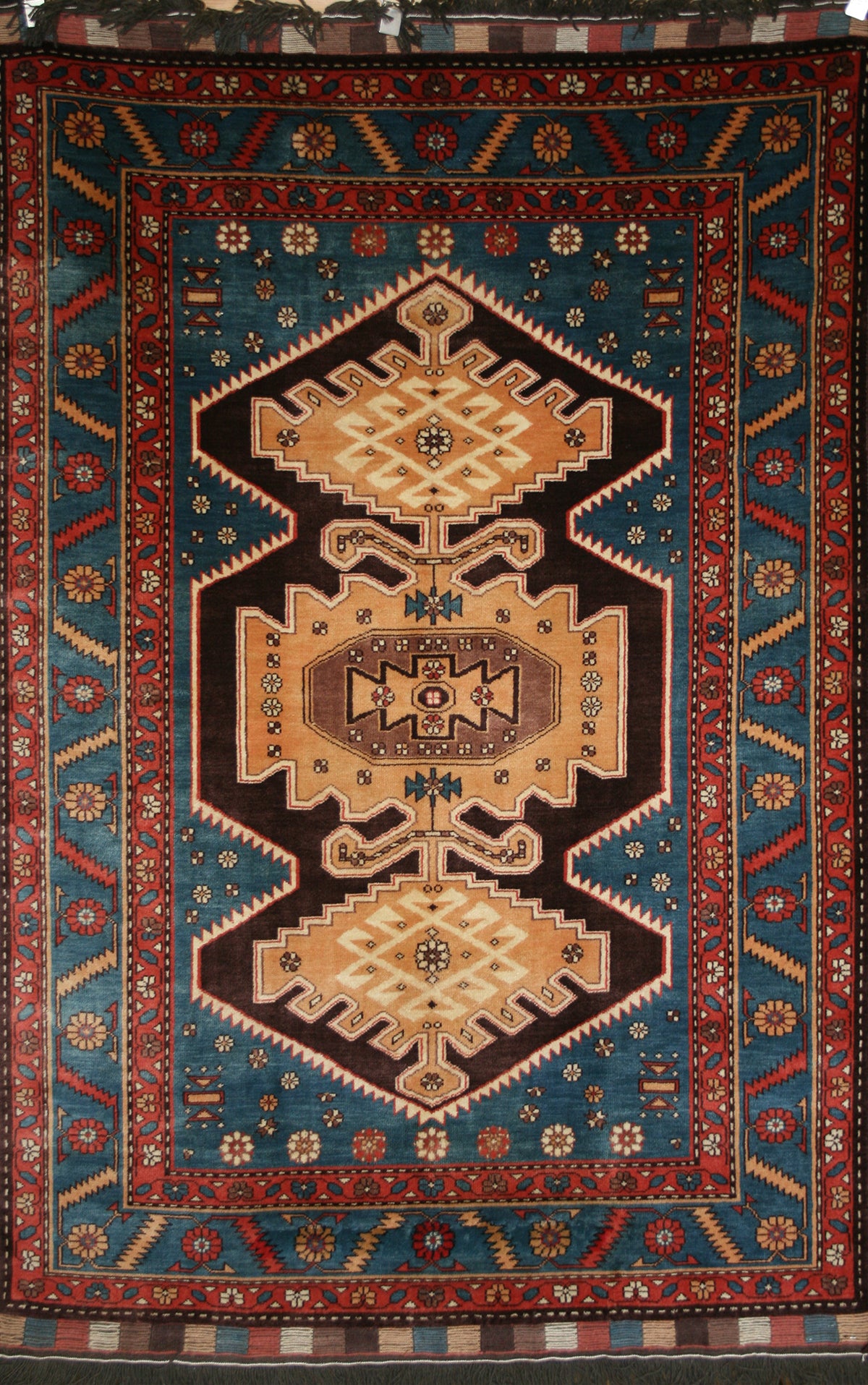 Hand-knotted in India, this rug draws inspiration from the tribal aesthetics of Shiraz, reimagined through bold geometry and earthy tones. Three stepped medallions anchor the teal field, framed by stylised rosettes and angular floral forms that create a sense of rhythm and symmetry. The palette of teal, chocolate brown, and camel is enriched by accents of brick red, ivory, and mustard yellow, offering strong contrast and visual depth. A brick red border adorned with rosettes and angular vine motifs provides a structured frame, softened by zigzag guard bands that transition into the field. The wool-on-wool construction enhances its durability and authenticity, while the repeat medallion layout lends a timeless, grounded quality. Perfect for traditional and eclectic interiors, this rug makes a striking centrepiece in living rooms, studies, or hallways—spaces where bold design and character are most at home. Enquire now to explore its character up close or arrange a viewing.