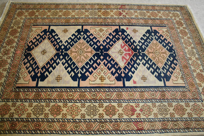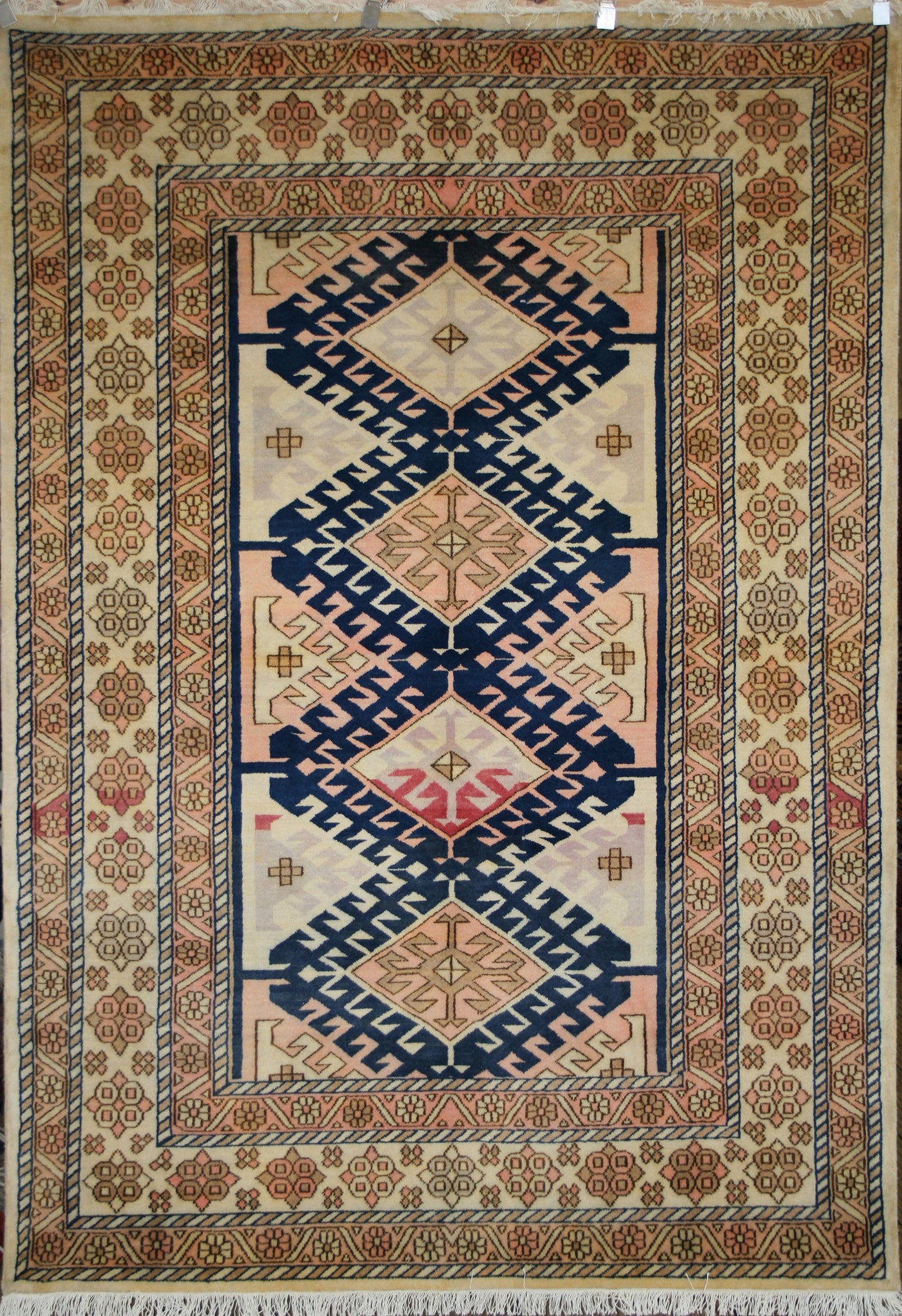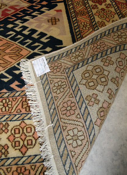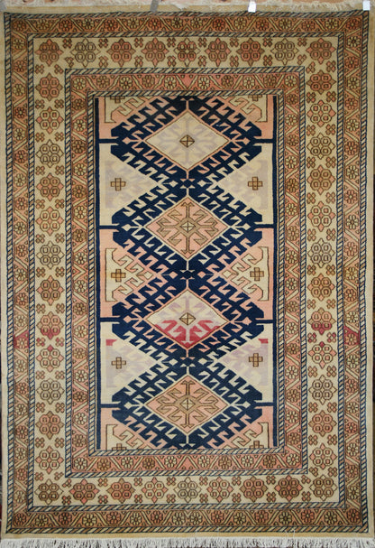 The ivory field sets a calm foundation for the navy and peach medallions, accented by tones of light brown and soft ivory. A hexagonal rosette border, framed by diagonal stripe guard bands, adds structure and reinforces the rug’s tribal character.