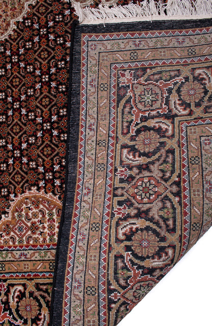 Hand-knotted in India, this rug draws inspiration from the masterful designs of Tabriz, one of Persia’s most celebrated weaving centres. Its central medallion rests within a field of Herati motifs – a diamond lattice interwoven with rosettes and stylised leaves – framed by a border of palmettes and scrolling vines.