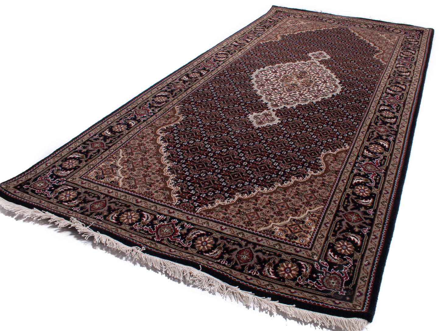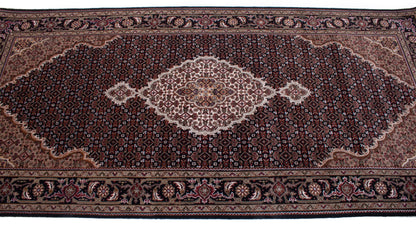 Inspired by the grand weaving traditions of Tabriz, this Indian hand-knotted rug brings Persian artistry into an accessible form. Its design is anchored by a striking central medallion, set against a black field that enhances the intricate floral detailing. Symmetrical palmettes, scrolling vines, and rosettes flow across the surface, creating a structured yet organic composition.