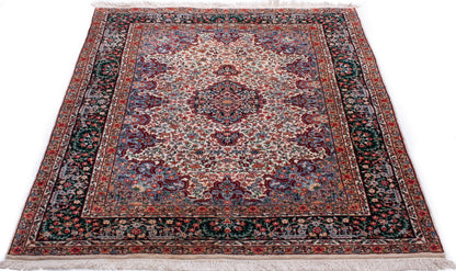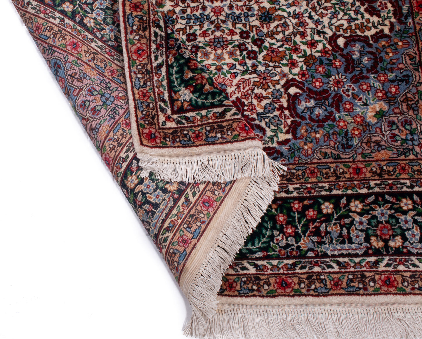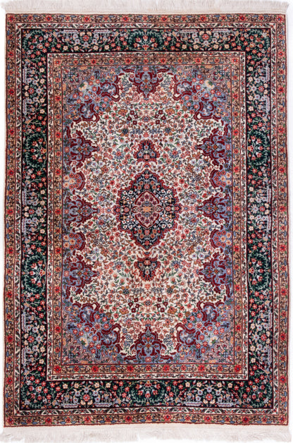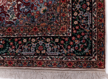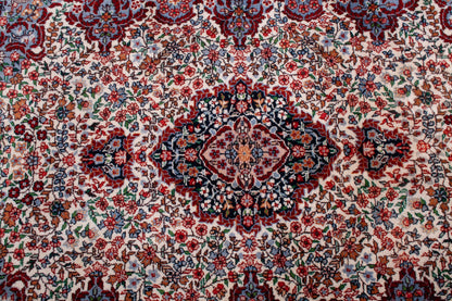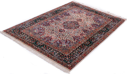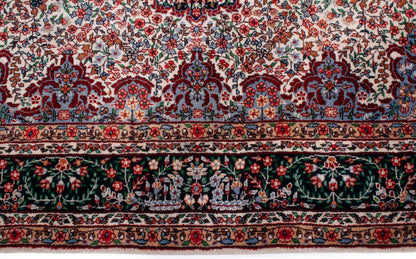 This hand-knotted Indian Tabriz rug draws inspiration from the classical Persian weaving tradition, offering a refined blend of symmetry, colour, and floral elegance. At its heart lies a lobed medallion set against an ivory field, surrounded by Shah Abbasi motifs, palmettes, and flowing vinework that echo the splendour of Safavid-era design.