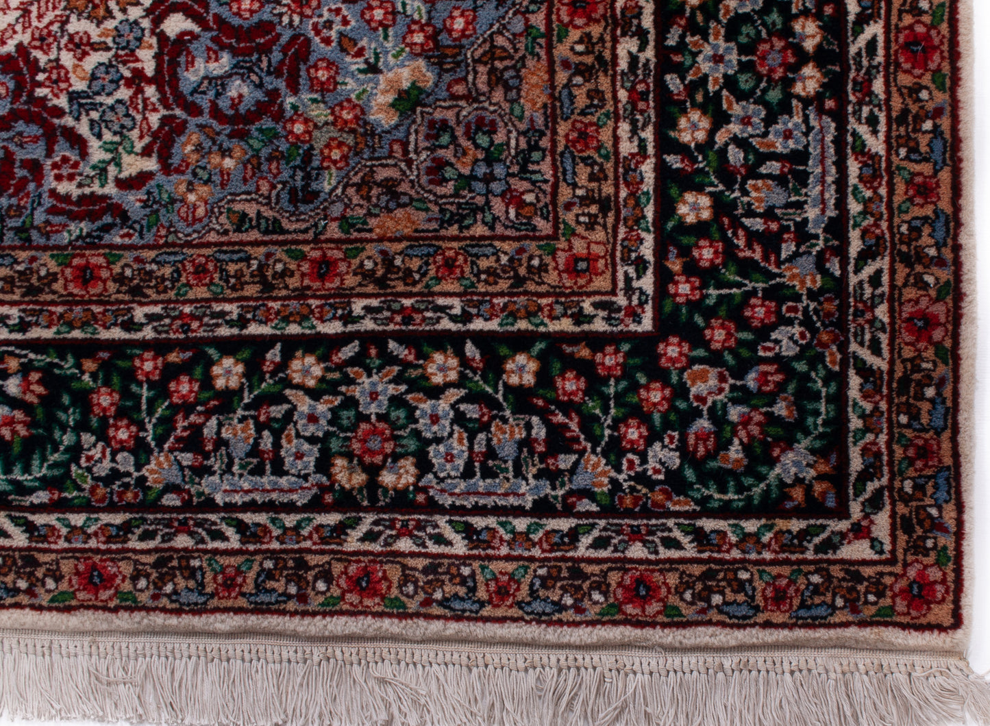 The burgundy and sky blue medallion sits within a field softened by tones of sage green and coral, framed by spandrels that mirror its floral rhythm. A dark green border, adorned with floral and vine motifs, provides structure and contrast, flanked by delicately rendered guard bands that enhance the rug’s balance.
