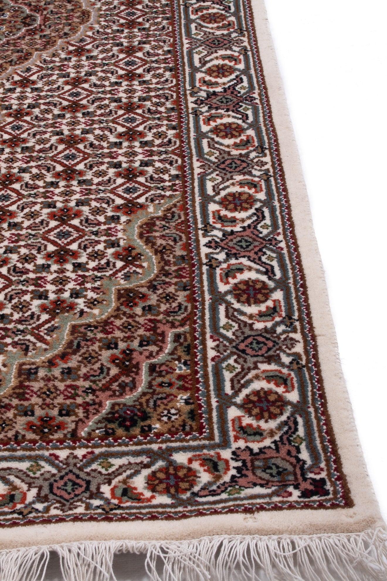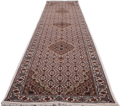 This hand-knotted Indian Tabriz runner draws inspiration from the classical weaving traditions of Persia, reimagined through Indian craftsmanship. Its repeat medallion layout, featuring diamond-shaped centres adorned with floral detailing, creates a rhythmic, symmetrical flow along the ivory field, enriched by the Herati motif’s interplay of diamonds, floral elements, and curving leaves.
