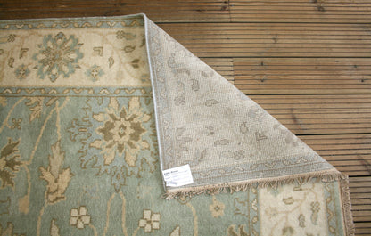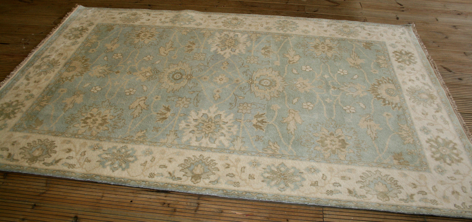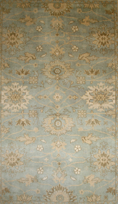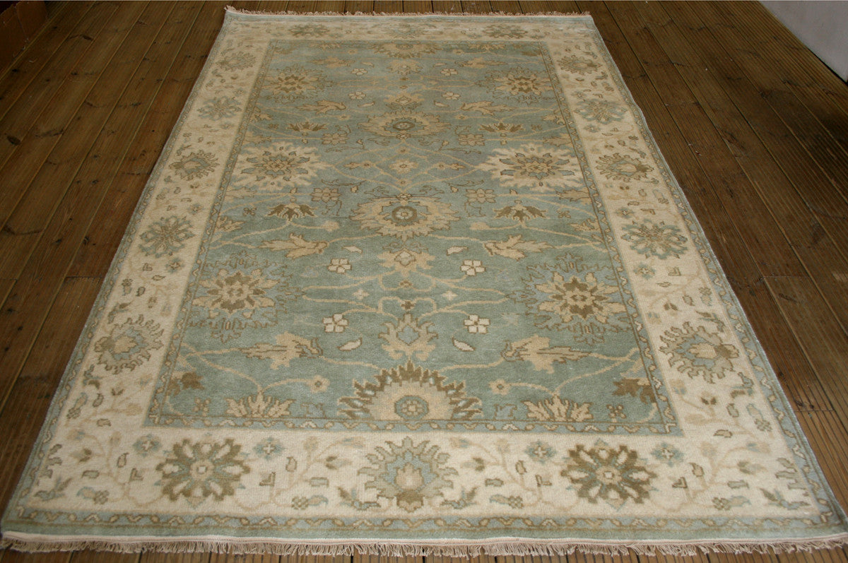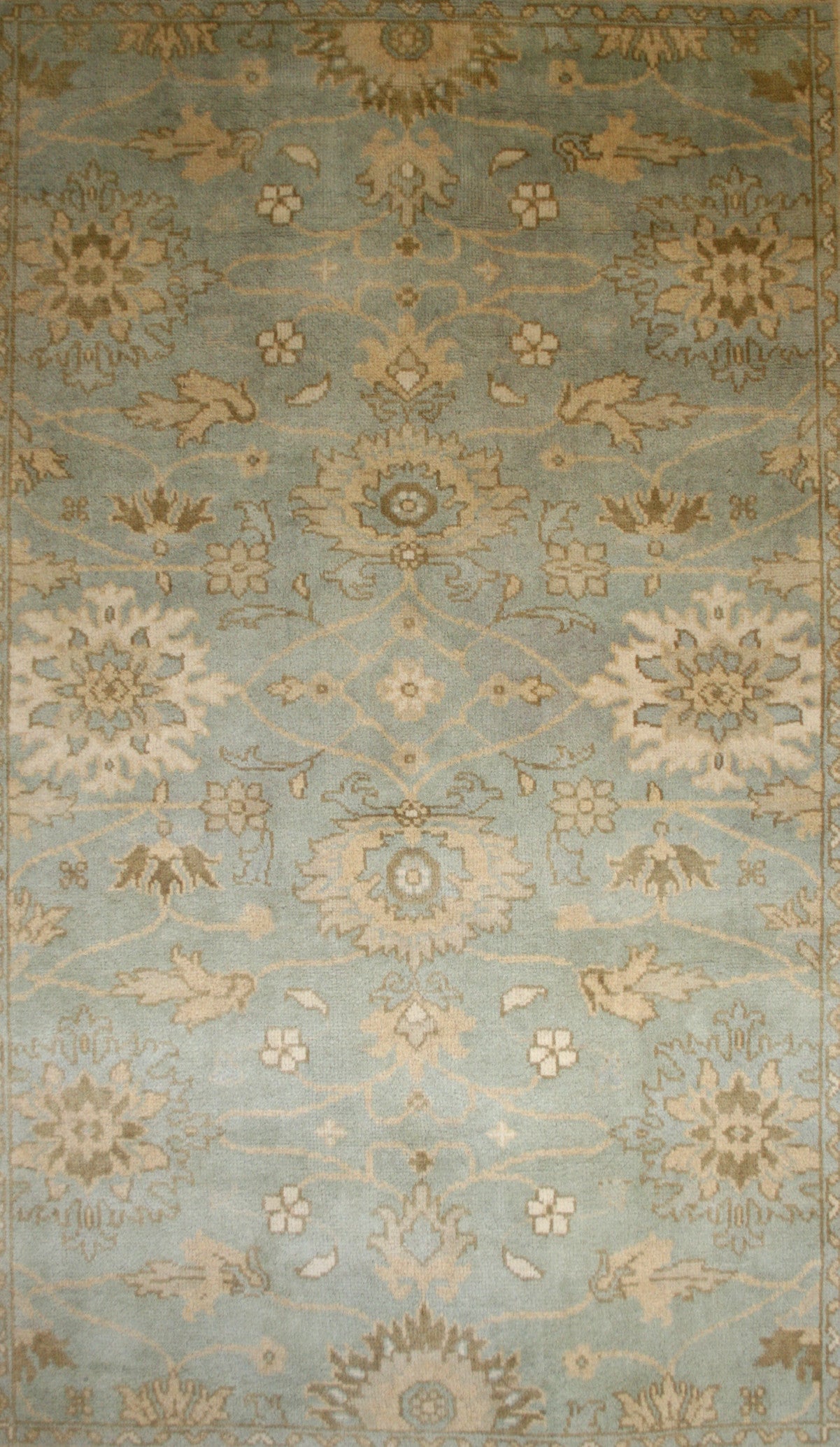 This Indian Ushak rug brings the elegance of Ottoman-inspired design into a contemporary form, offering a refined blend of symmetry and softness. Its all-over floral layout, featuring palmettes and rosettes, flows across a duck egg blue field, framed by a cream border that mirrors the field’s motifs in soft taupe and blue.