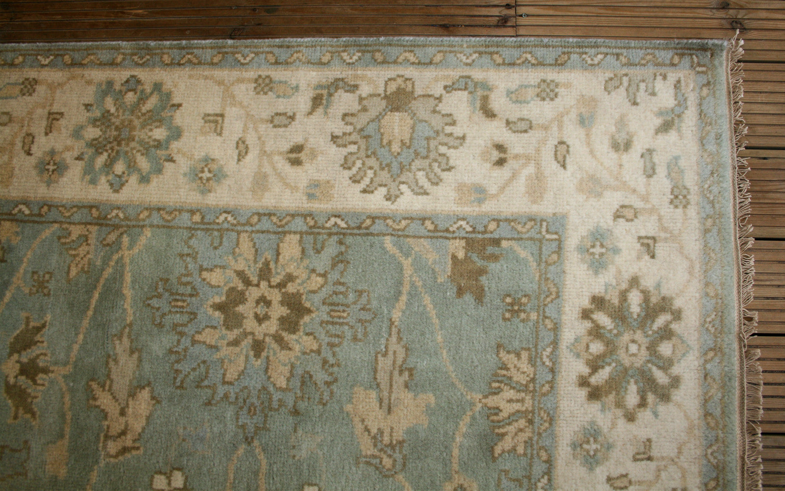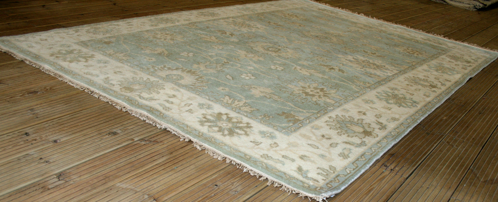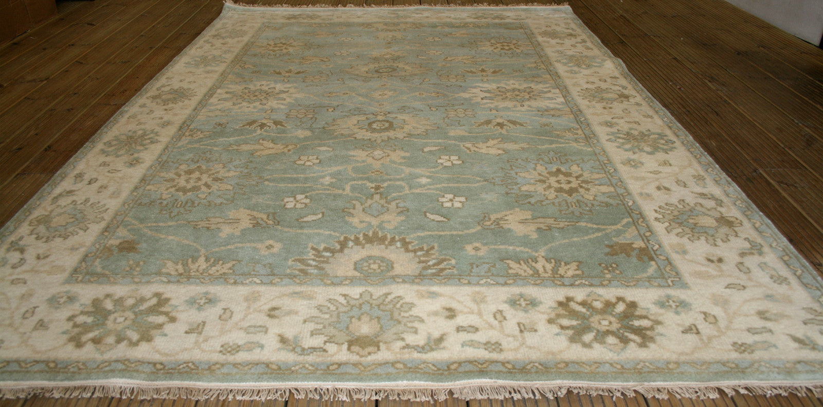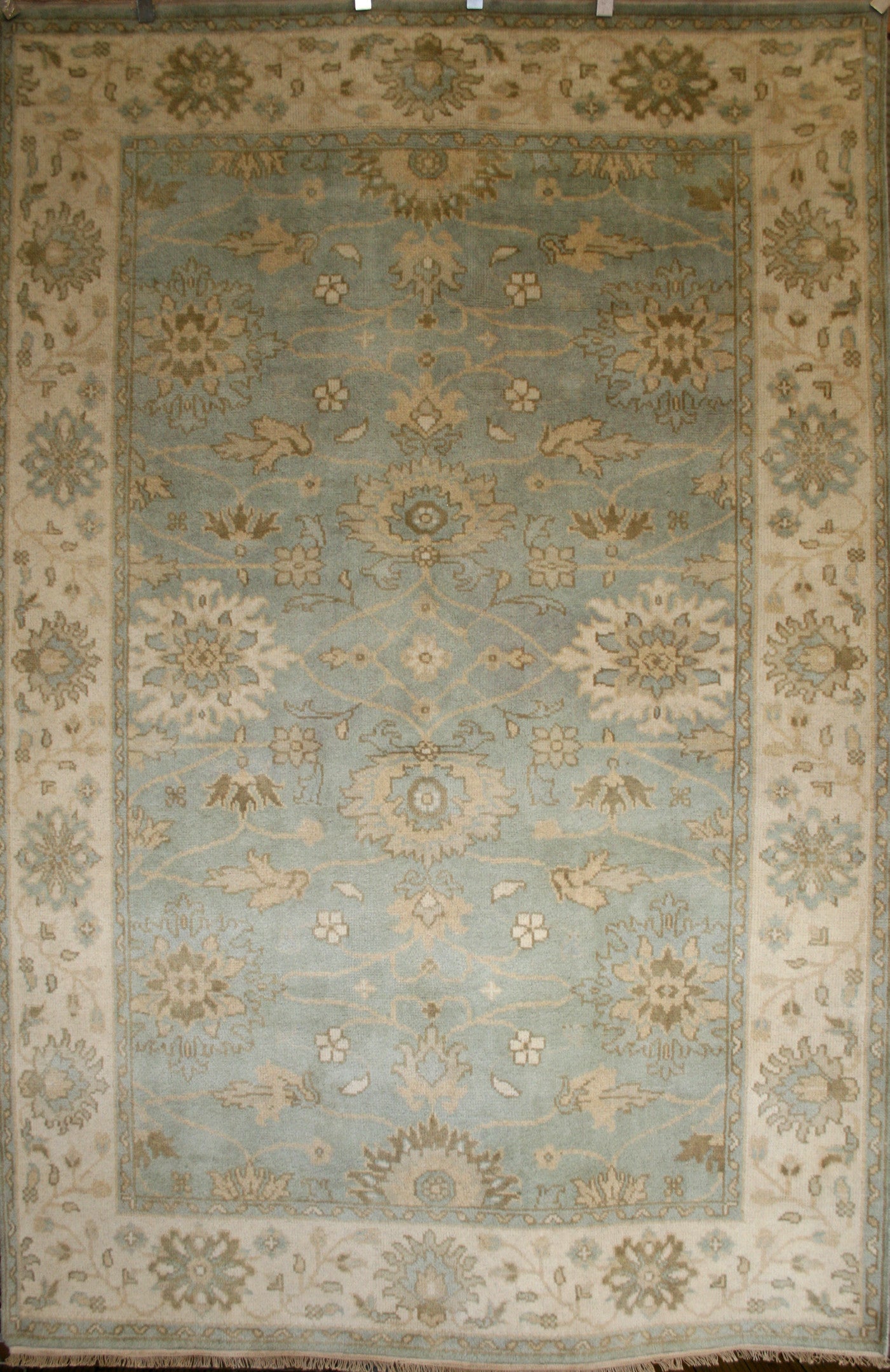 This Indian Ushak rug brings the elegance of Ottoman-inspired design into a contemporary form, offering a refined blend of symmetry and softness. Its all-over floral layout, featuring palmettes and rosettes, flows across a duck egg blue field, framed by a cream border that mirrors the field’s motifs in soft taupe and blue.