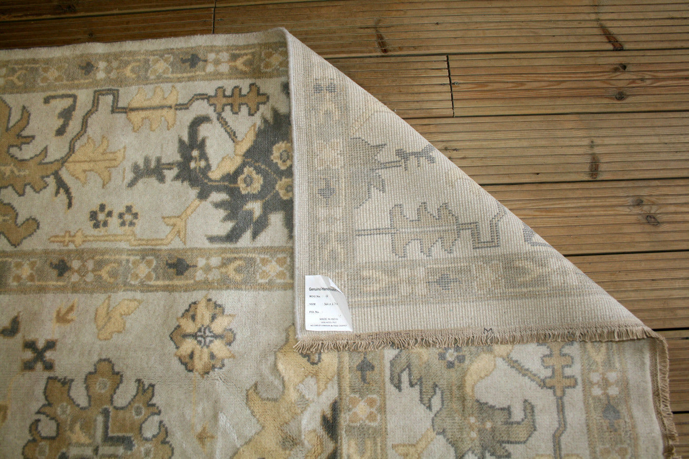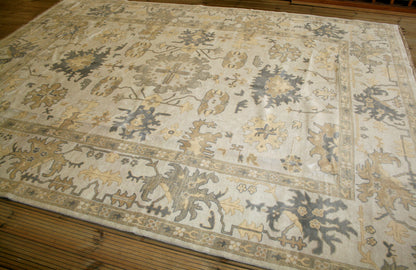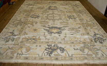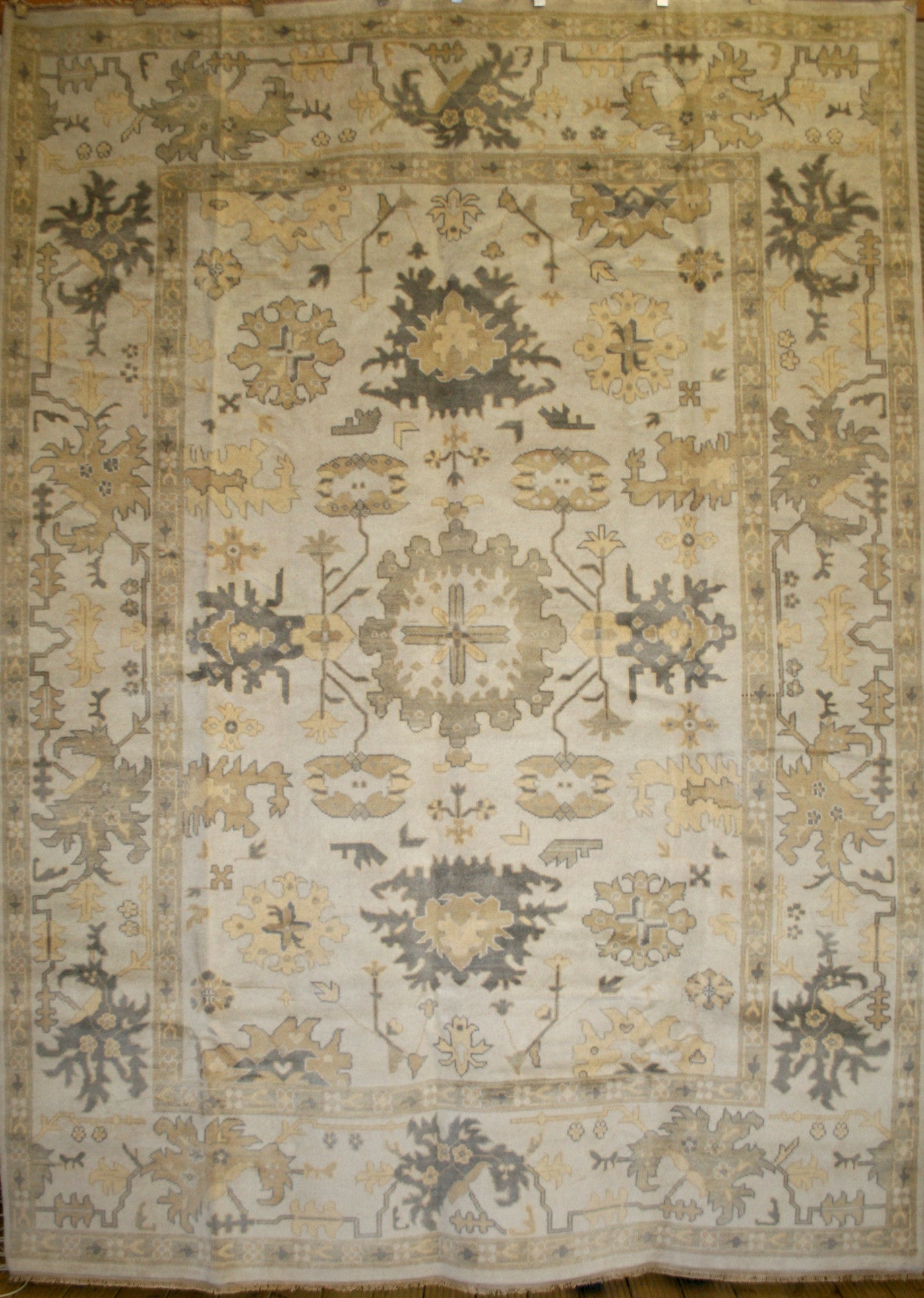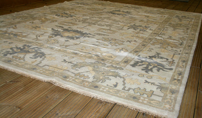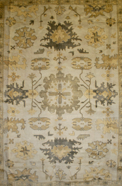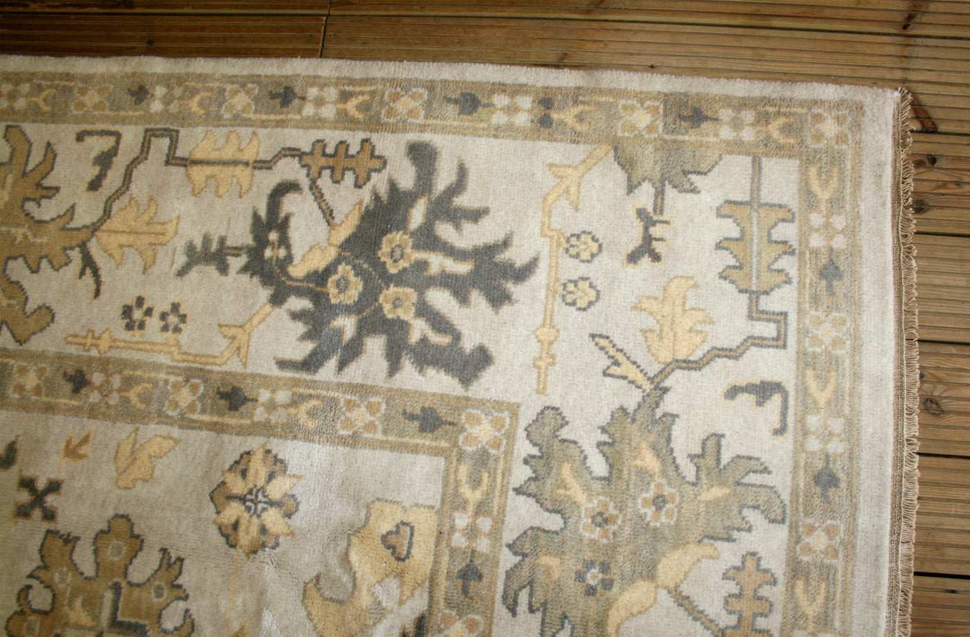 This hand-knotted Indian Ushak rug draws on the spirit of Ottoman-era Ushak weaving, reinterpreting its grand medallion layouts and stylised motifs through a softer, more understated lens. A central medallion anchors the design, surrounded by palmettes, rosettes, and angular vinework arranged in a mirrored, geometric-floral composition.