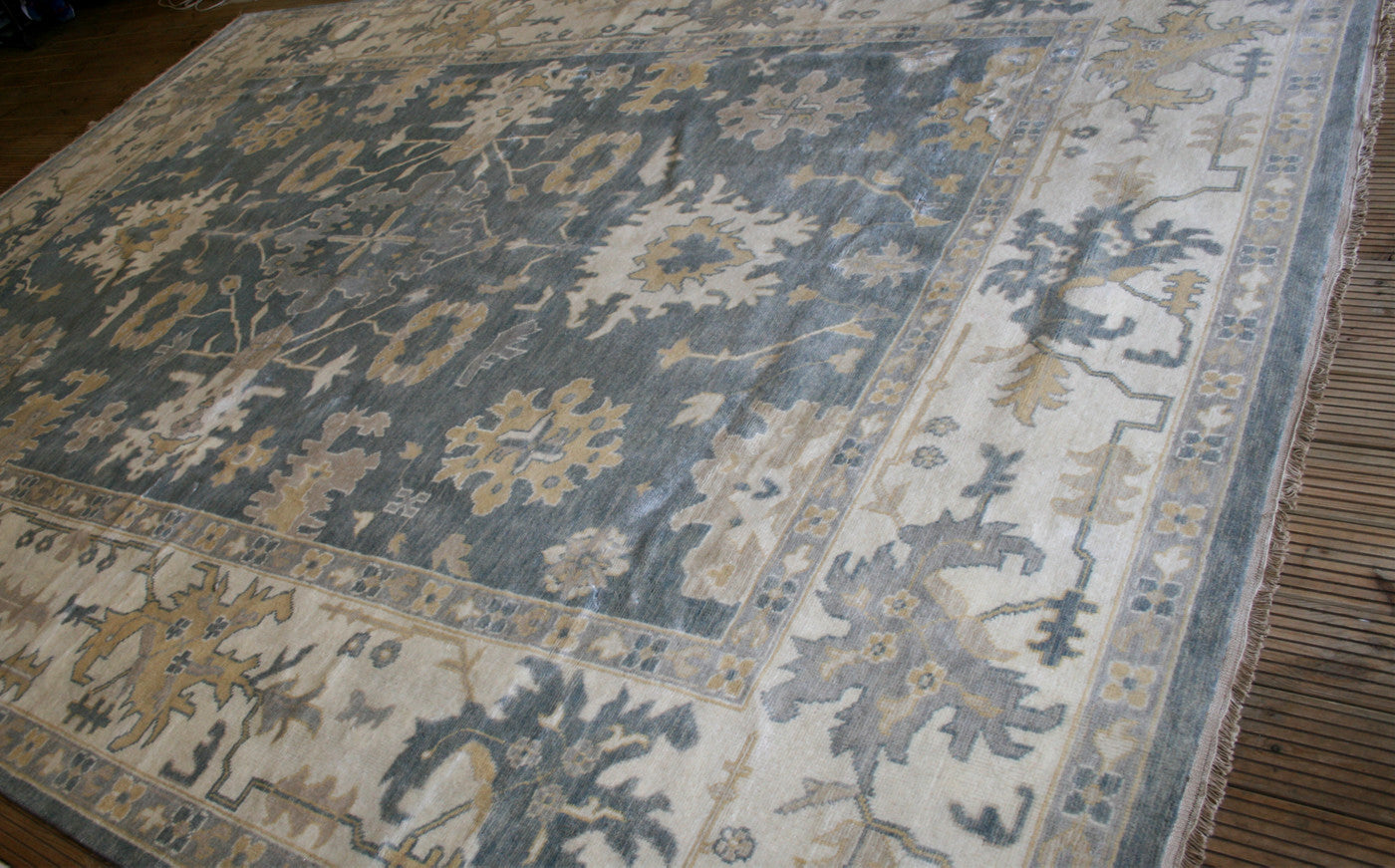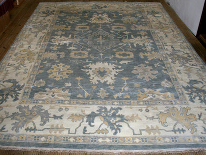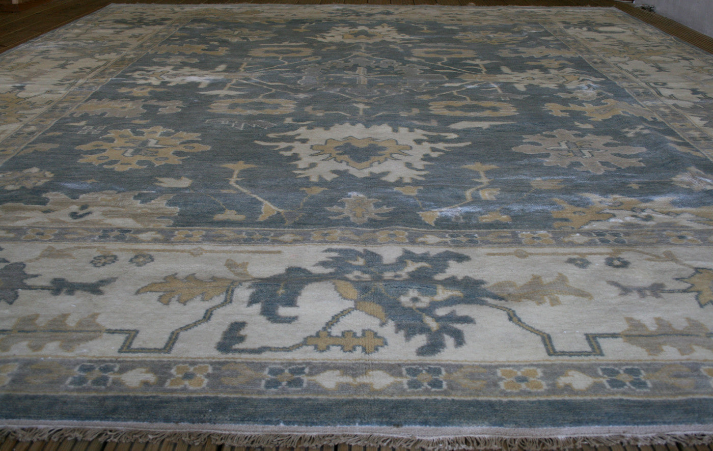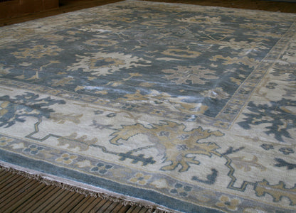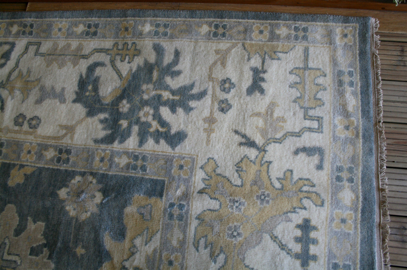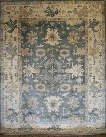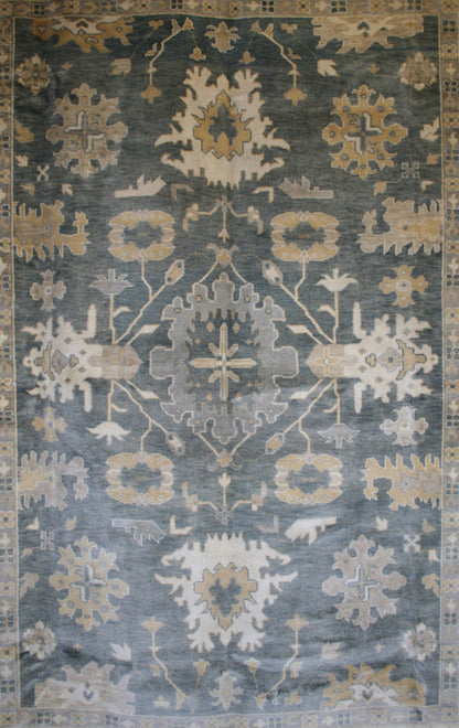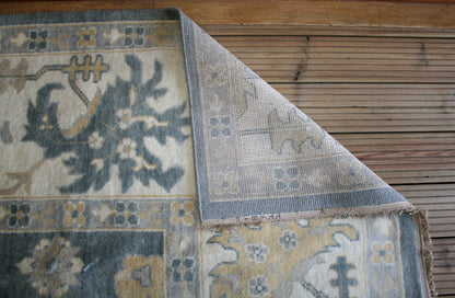 This hand-knotted Indian Ushak rug draws inspiration from the classical Anatolian designs of Uşak, reinterpreted with a soft, earthy palette and a refined sense of symmetry. A floral medallion anchors the slate blue field, surrounded by stylised palmettes, rosettes, and sweeping vine motifs that echo the elegance of Ottoman rug traditions.