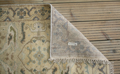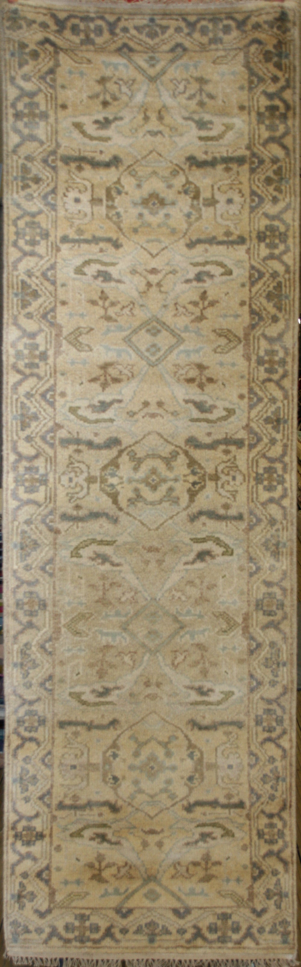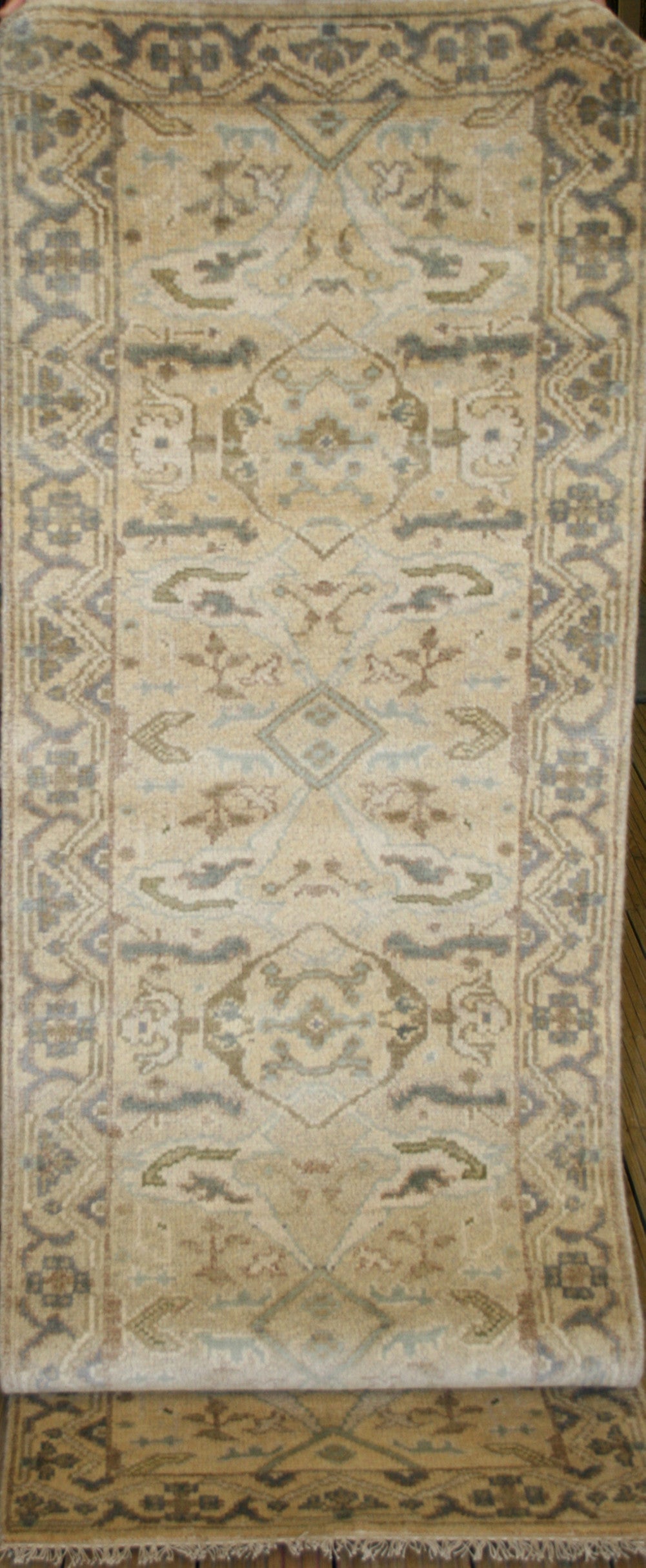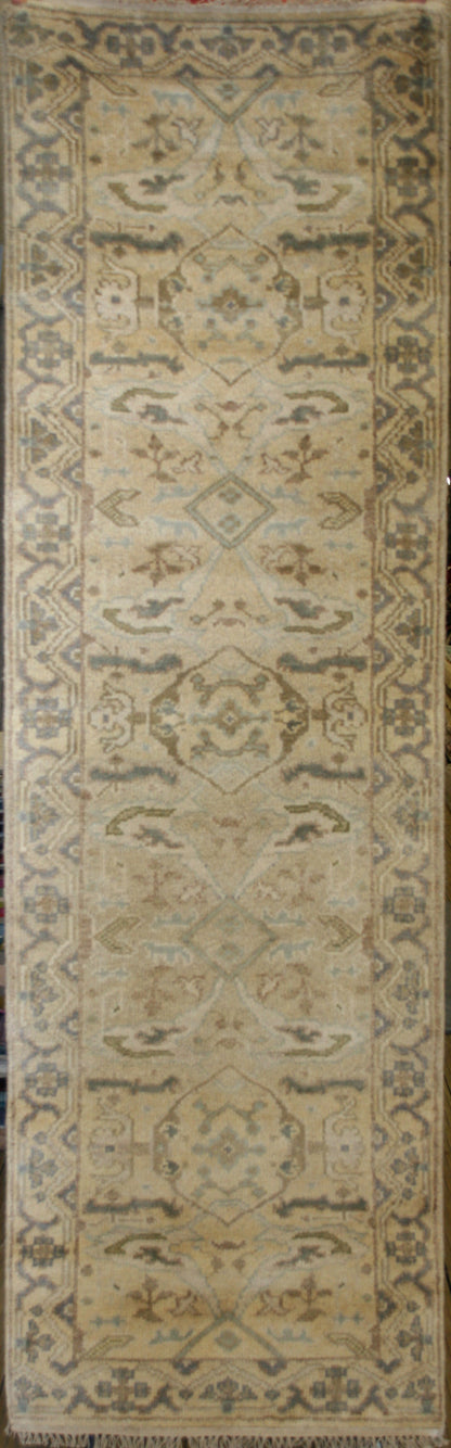This Indian Ushak runner draws inspiration from the storied weaving traditions of Ushak, reinterpreted through a soft, earthy palette and a timeless geometric-floral design. A series of diamond medallions, adorned with stylised floral elements, form the central axis of the rug, creating a sense of rhythm and balance. The muted tones of beige, light brown, sage green, and soft blue lend a gentle harmony to the composition, making it versatile for a range of interiors.