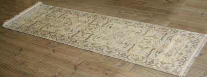 The beige border, decorated with repeating rosettes and palmettes, provides a structured frame for the central field, while subtle guard bands offer a refined transition between elements. Hand-knotted from wool on a cotton foundation, this runner is well-suited for hallways, entryways, or layered interiors seeking quiet character.
