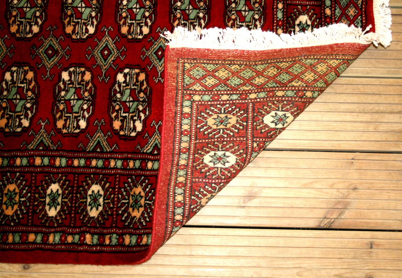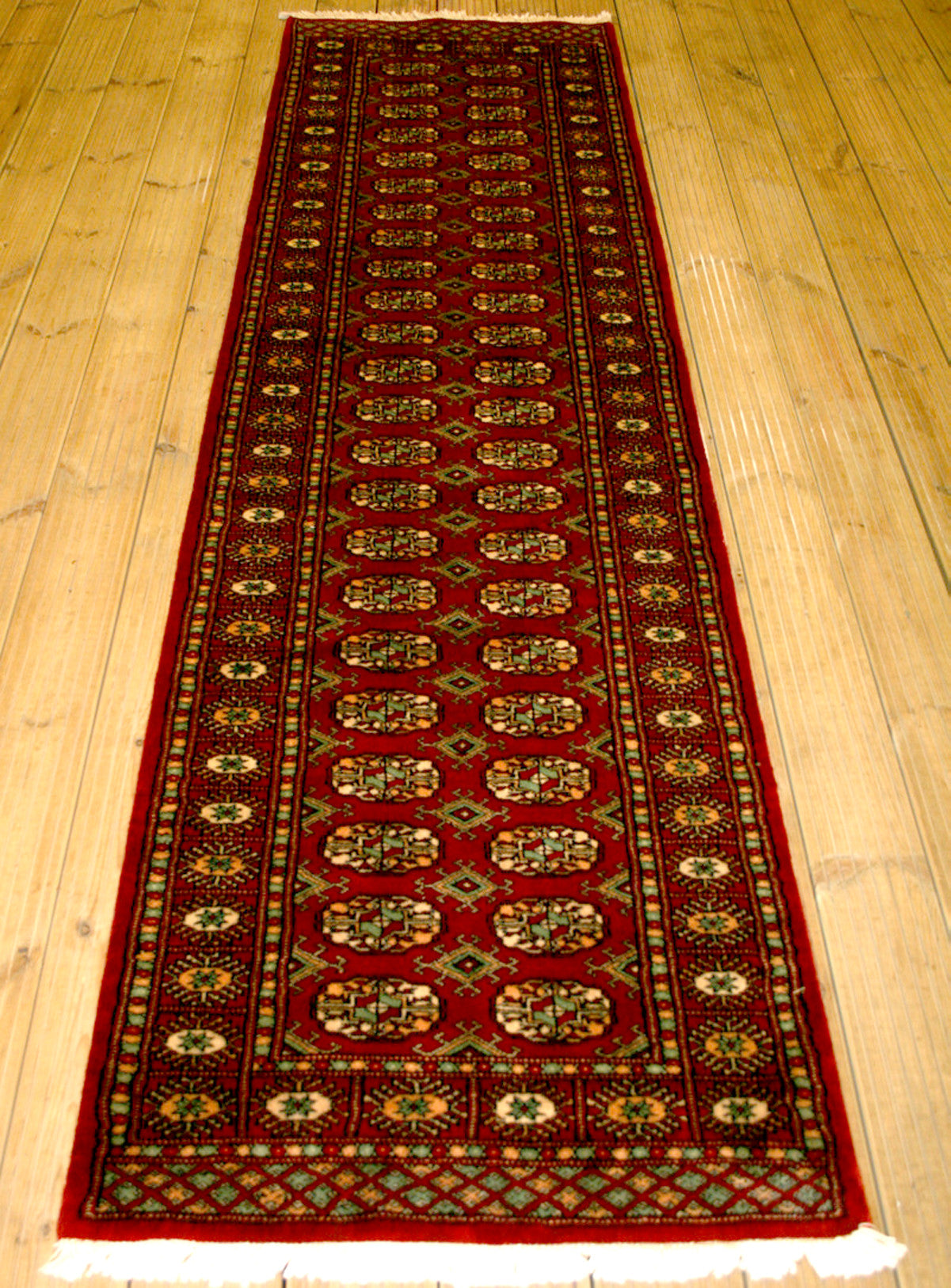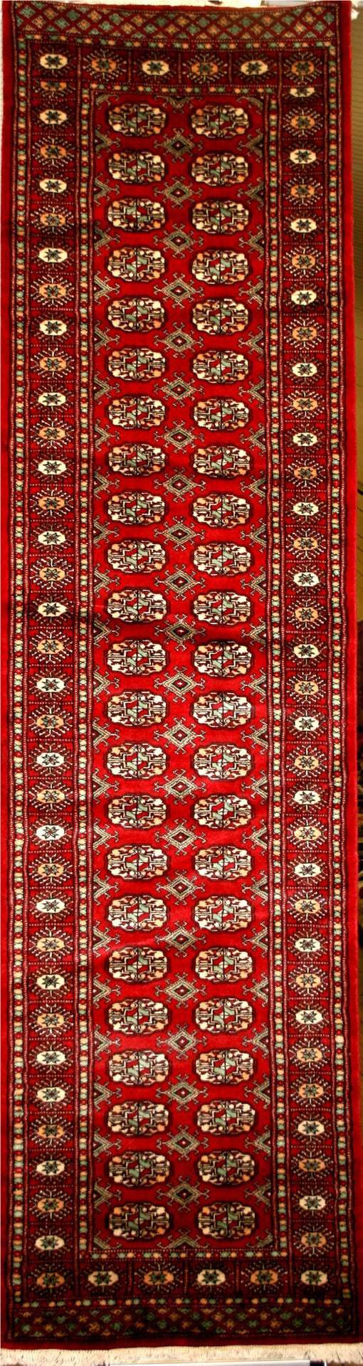 This hand-knotted Pak-Persian Bokhara runner draws on the tribal aesthetics of Tekke weaving, featuring rows of elongated octagonal guls (tribal emblems) arranged in a disciplined, symmetrical layout. Smaller diamond motifs punctuate the field, adding subtle intricacy to the bold, geometric repetition.