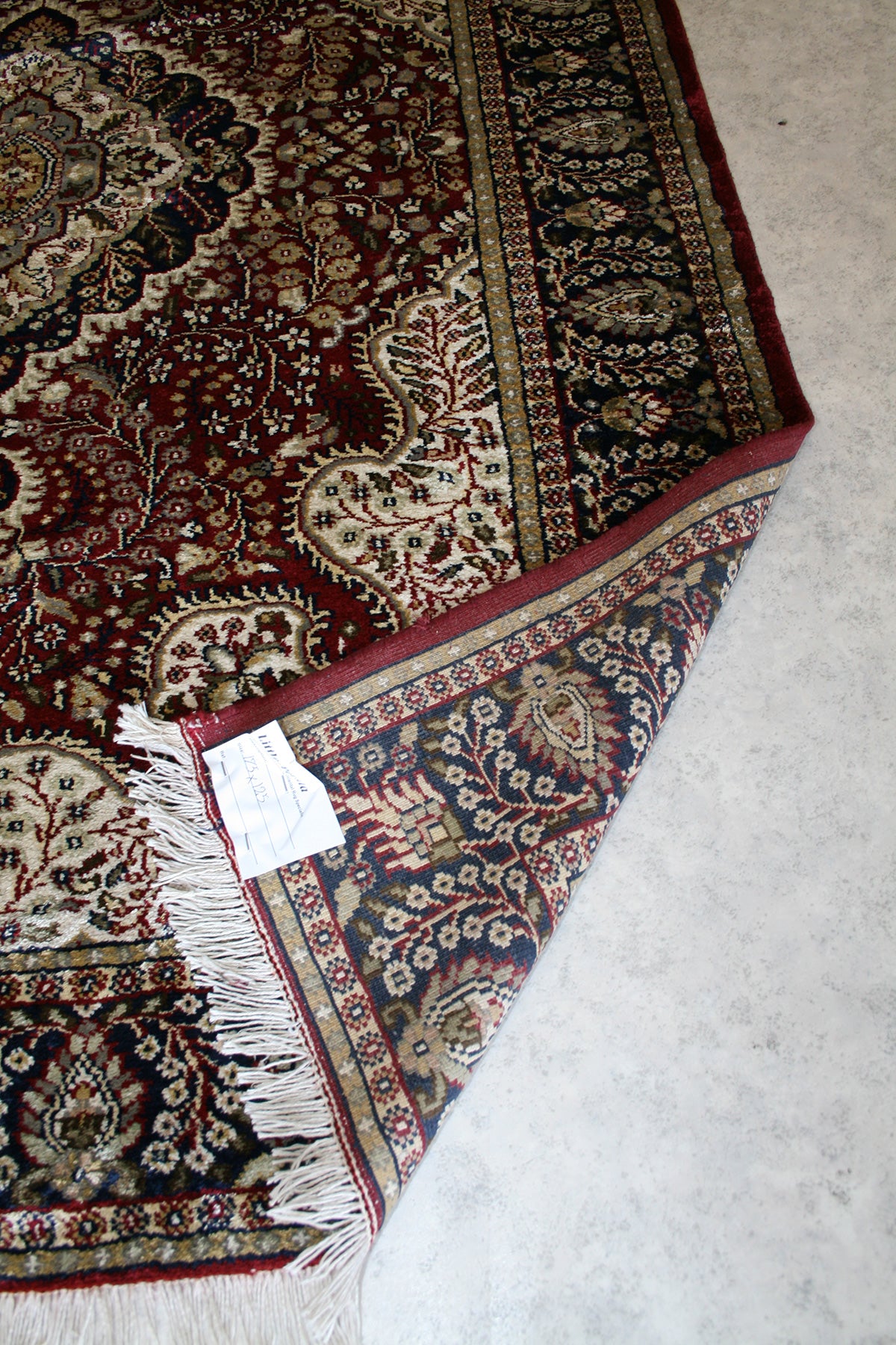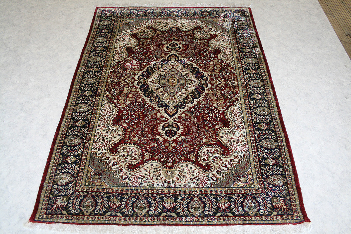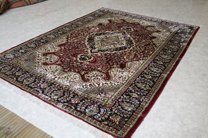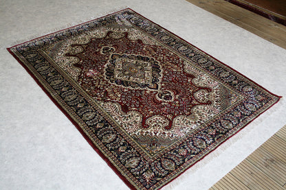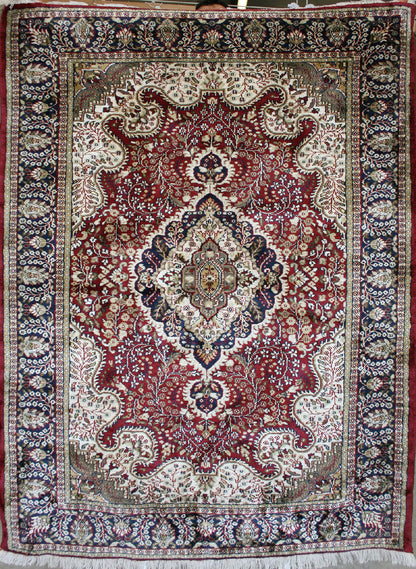 Hand-knotted in Kashmir Pakistan, this Pak-Persian Qom design Kashmir rug with silk touch draws inspiration from the classical weaving traditions of Qom, reinterpreted with a bold aesthetic and meticulous craftsmanship. At its heart lies a lobed medallion set against a rich burgundy field, surrounded by palmettes, rosettes, and scrolling vines that flow symmetrically across the surface. Ivory spandrels and a midnight blue border enhance the contrast, while olive green and beige accents add depth to the composition.