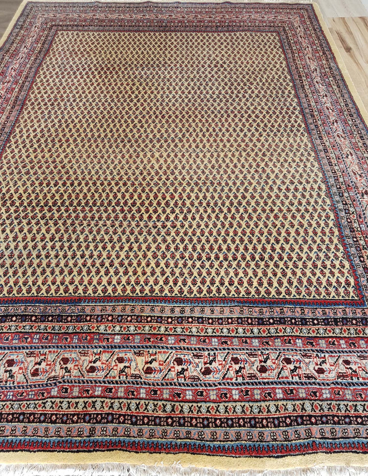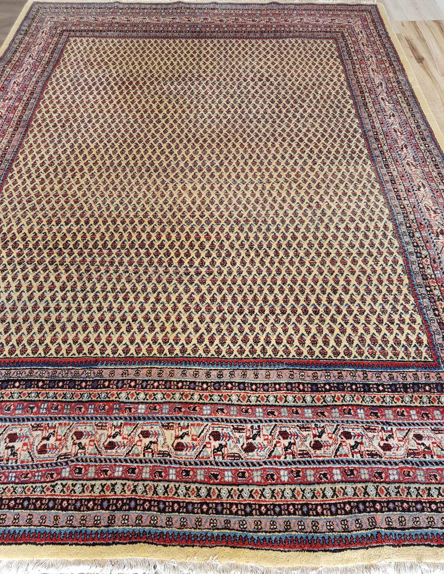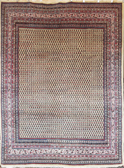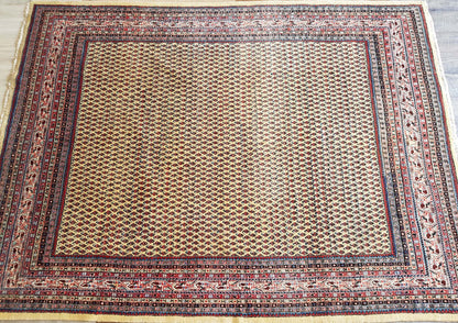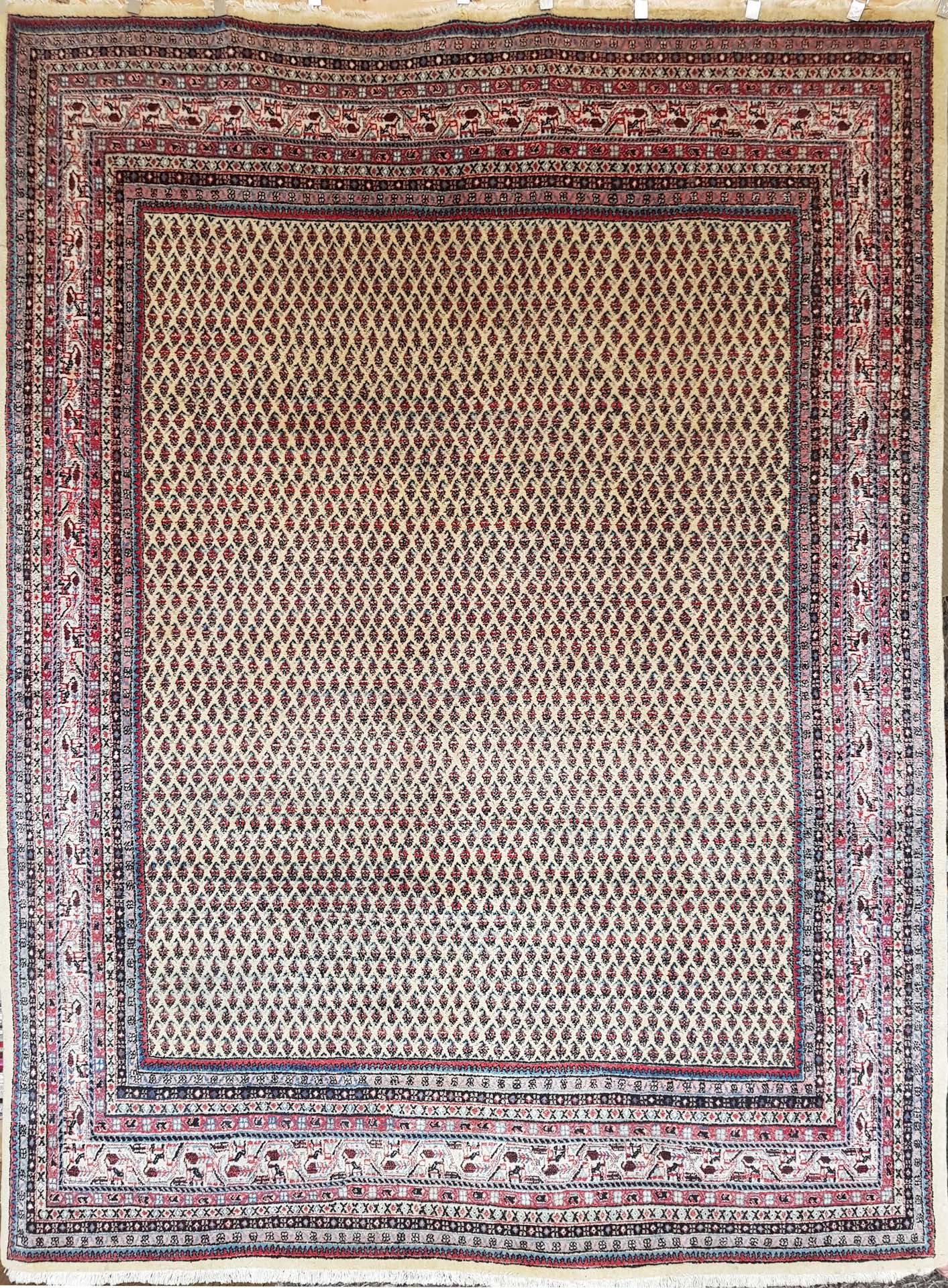 This hand-knotted Persian rug from Arak (formerly Sultanabad) reflects the region’s historic affinity for bold, structured design. Its all-over Boteh field—richly geometric and symmetrically arranged—creates a rhythmic, lattice-like flow that speaks to the repetition and symbolism rooted in Persian weaving traditions.