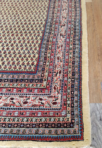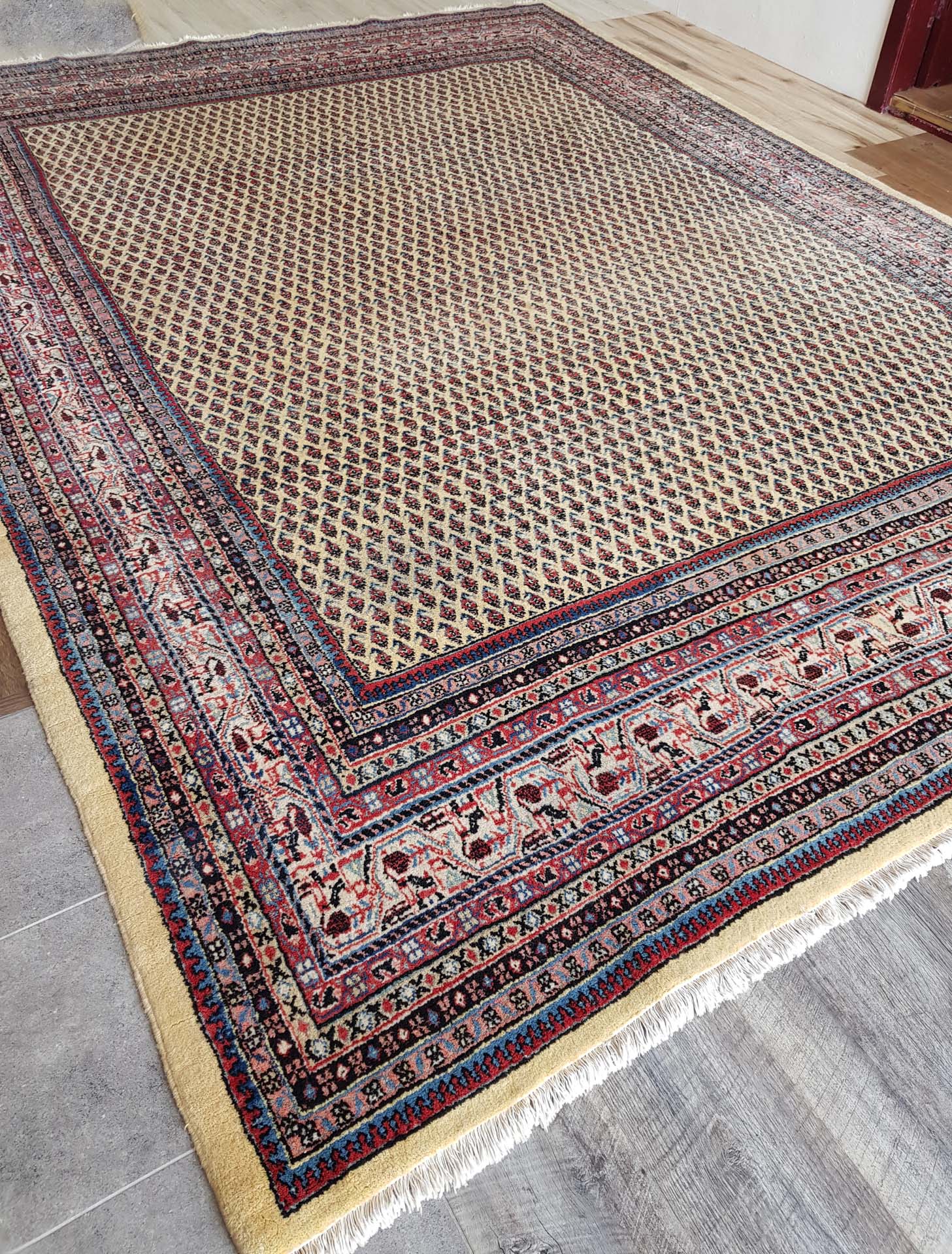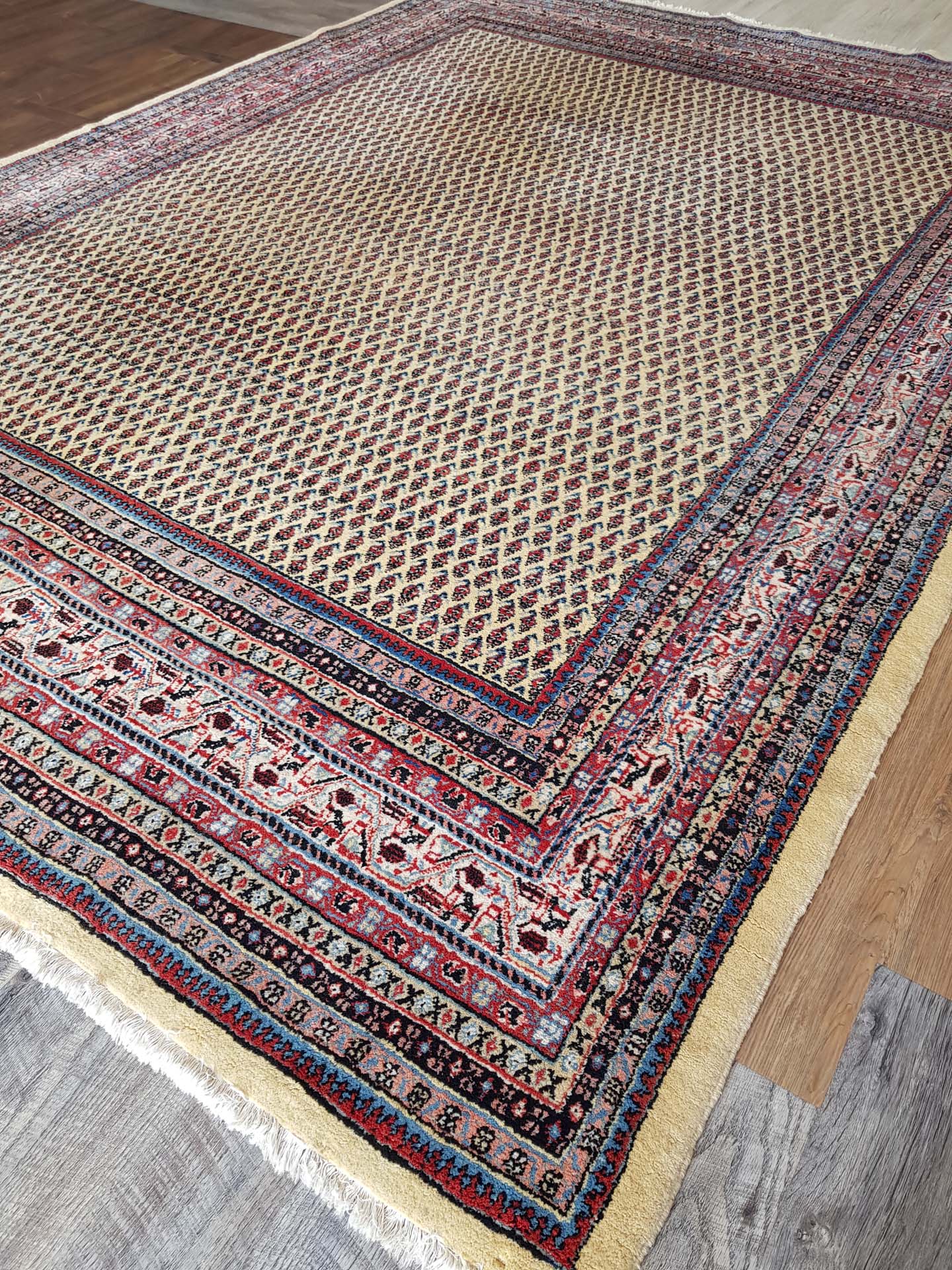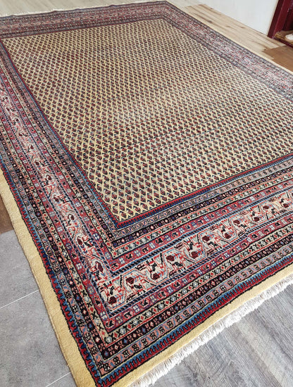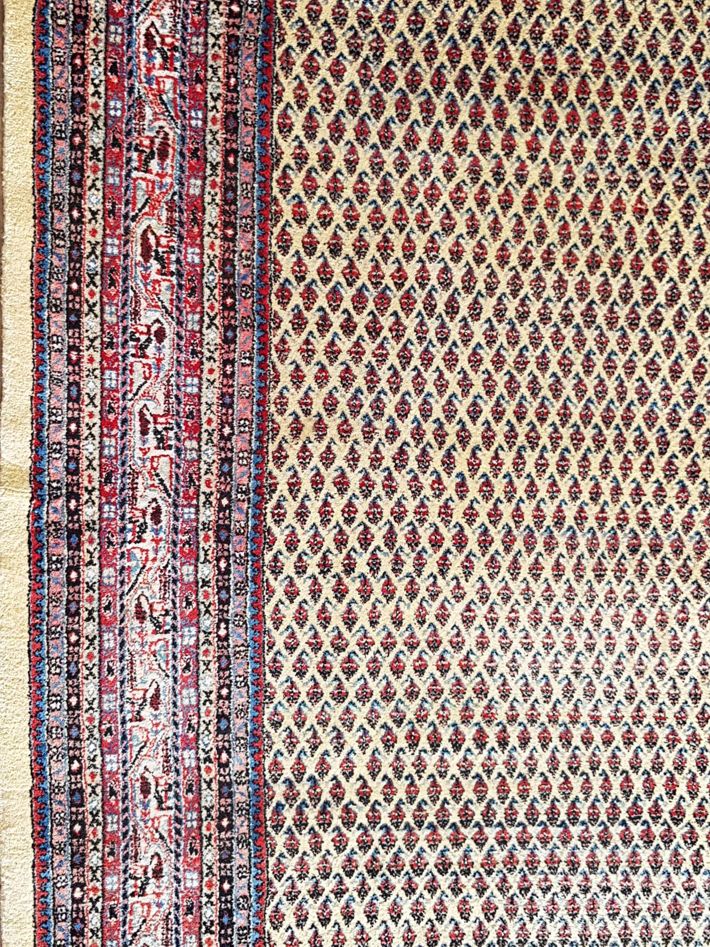 This hand-knotted Persian rug from Arak (formerly Sultanabad) reflects the region’s historic affinity for bold, structured design. Its all-over Boteh field—richly geometric and symmetrically arranged—creates a rhythmic, lattice-like flow that speaks to the repetition and symbolism rooted in Persian weaving traditions.
