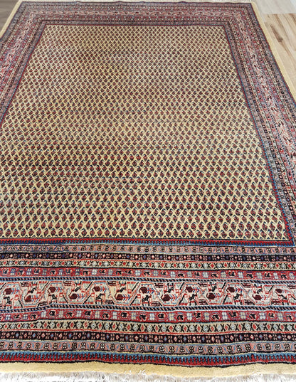 The cream field is layered with dark brown and red Boteh motifs, set within a palette of navy, brick red, and soft pastel accents. A striking main border, adorned with stylised animal figures—possibly camels—adds a narrative edge, framed by multiple guard bands that enhance the rug’s architectural clarity.