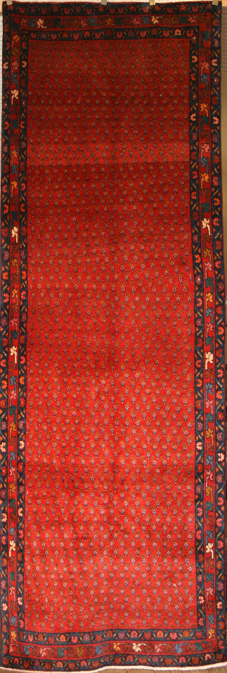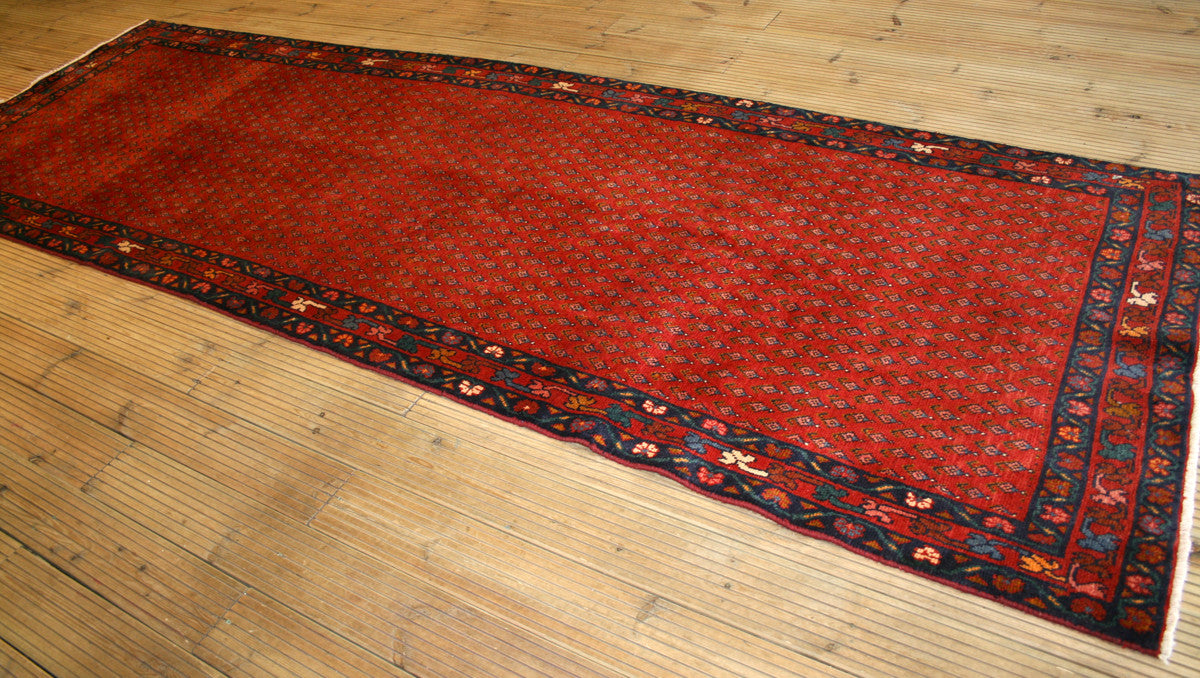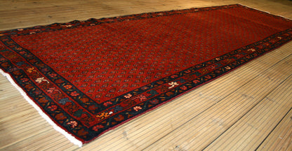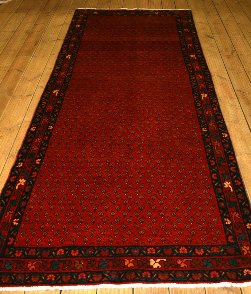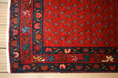 This hand-knotted Persian runner from Arak captures the disciplined beauty of tribal design, woven into a practical, enduring form. Its field is filled with small, repeating diamond motifs, tightly arranged in a staggered layout that creates a sense of rhythm and cohesion. Stylised animal figures and abstract floral elements animate the midnight blue border, offering a striking contrast to the crimson field.