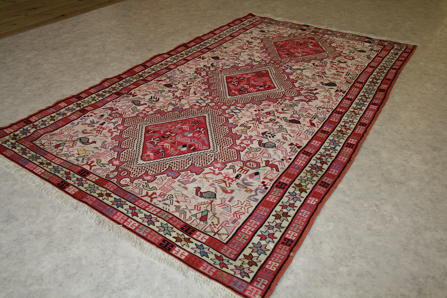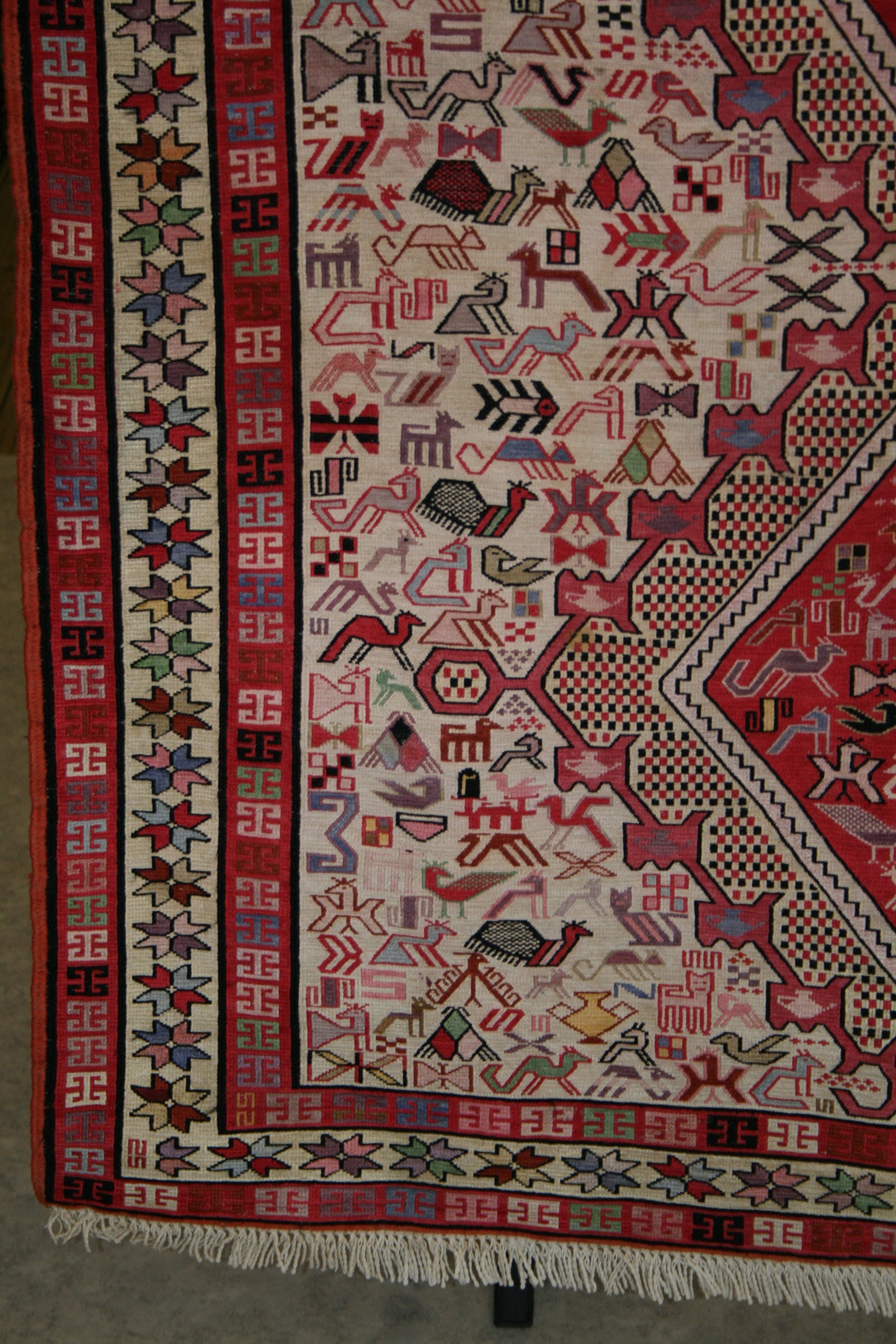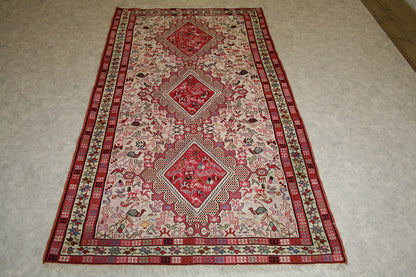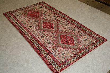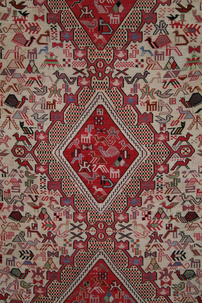 Handwoven in Azari, Iran, this Persian Soumak rug is a striking example of tribal craftsmanship, blending bold geometry with symbolic storytelling. Its repeat medallion layout features three large, diamond-shaped medallions filled with stylised animal motifs, tribal symbols, and geometric forms, all arranged in a mirrored, structured composition.