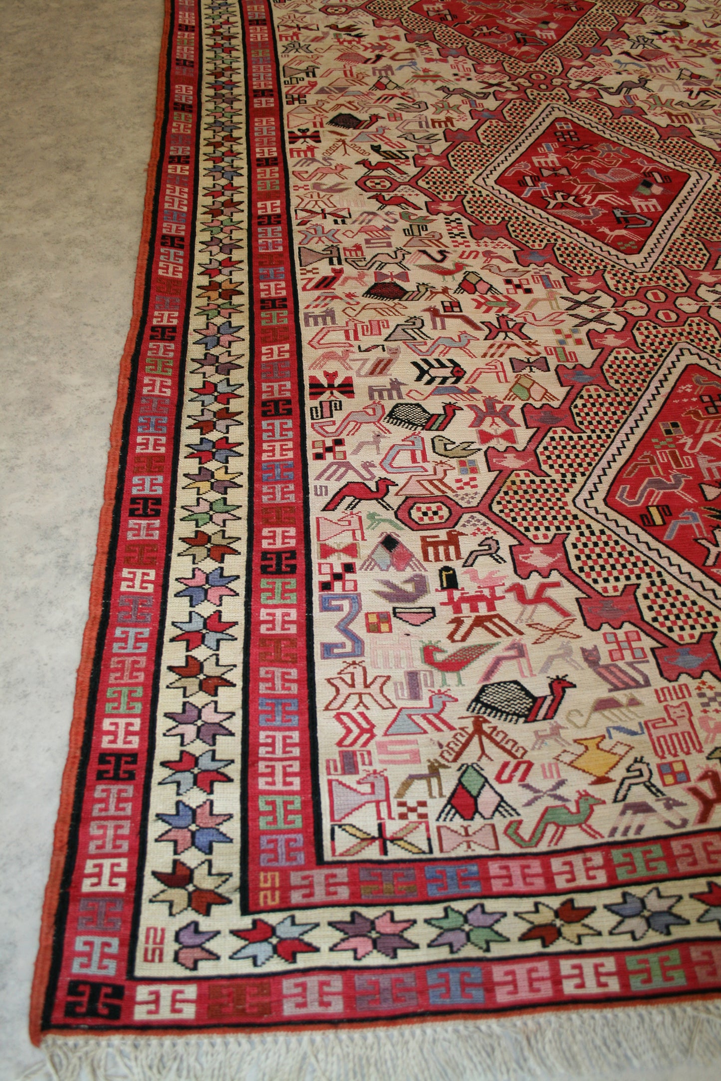 The ivory field creates a vivid contrast against the crimson medallions, with accents of sage green, sky blue, mauve, and black adding tonal richness. The border, adorned with multicoloured star motifs on a cream ground, is framed by red and black guard borders that enhance the rug’s rhythmic symmetry.