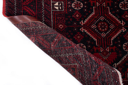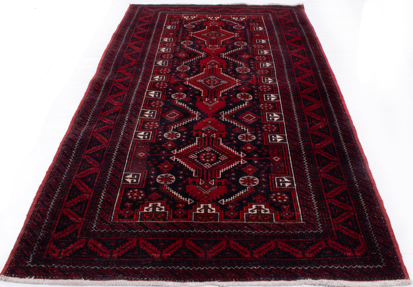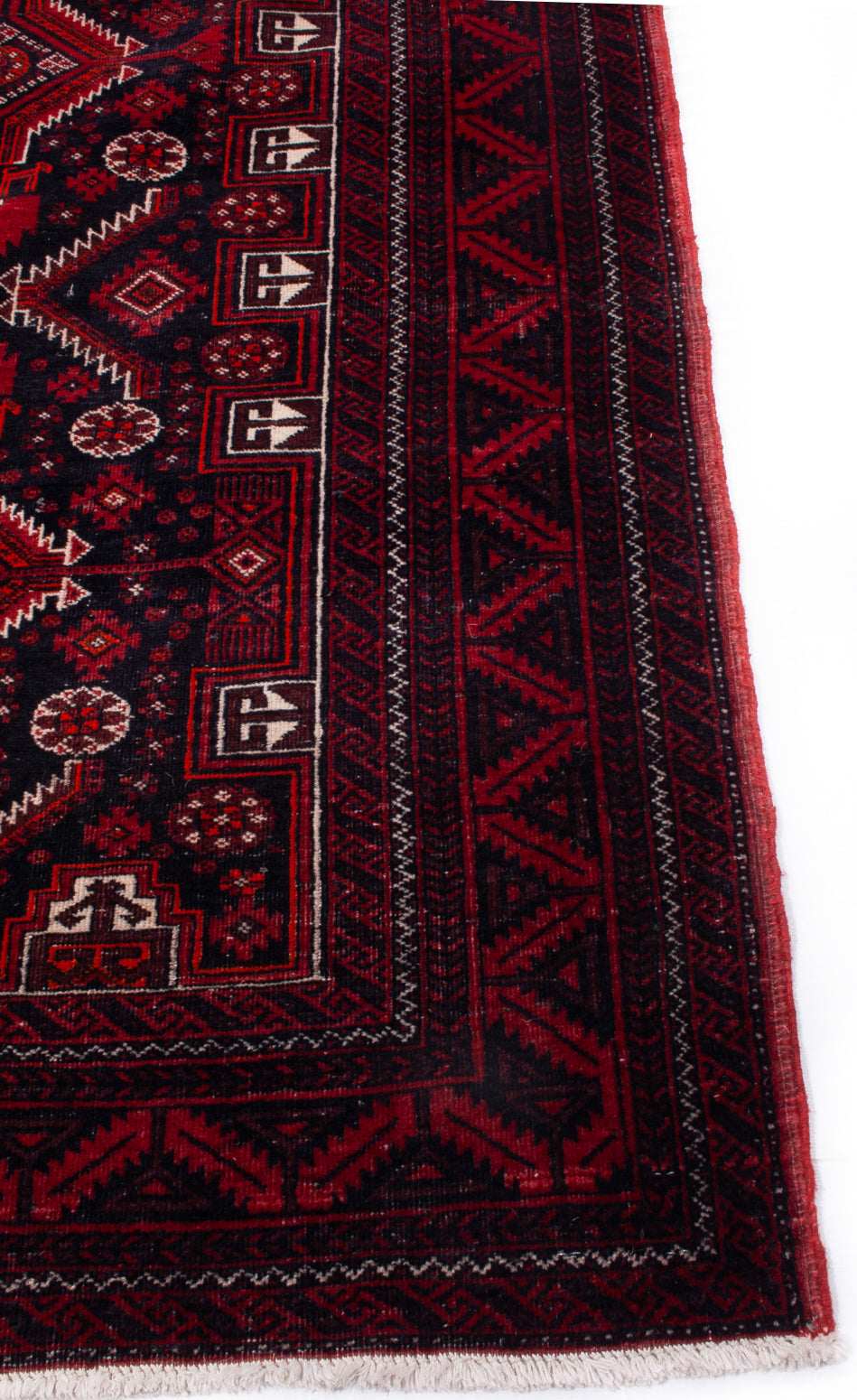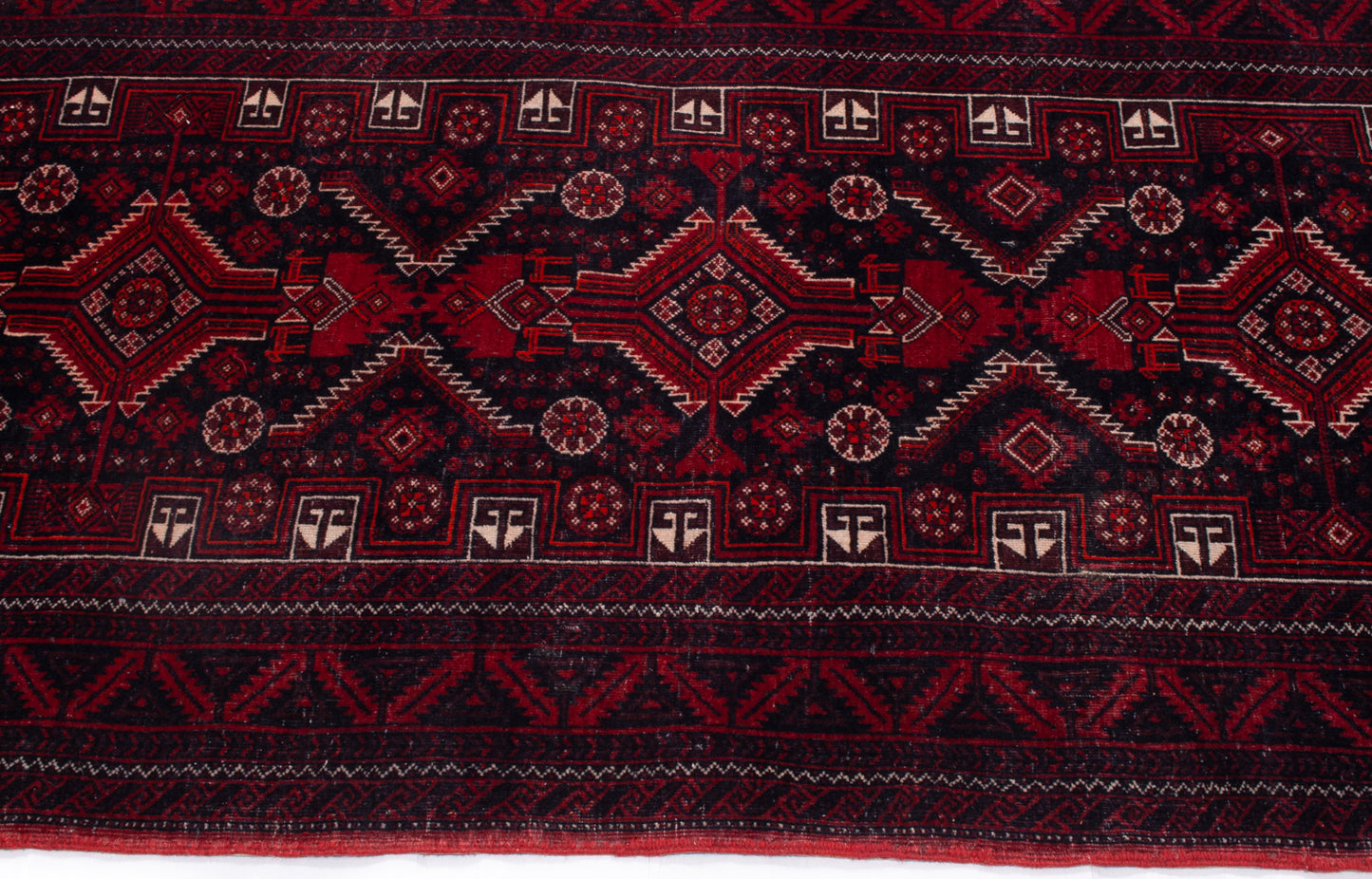 This Persian Baluch rug embodies the tribal artistry of the Baluch nomadic weavers, known for their bold geometric patterns and rich, contrasting colours. Woven in Iran, this piece features a repeat medallion design, with centrally aligned diamond motifs framed by angular forms, creating a striking sense of symmetry and movement. The deep red and black palette, accented with white and dark brown, enhances its vivid visual impact, making it a compelling addition to any space.