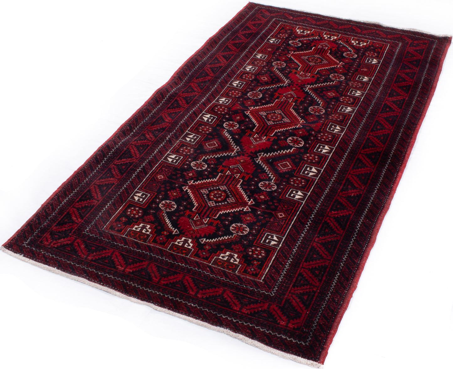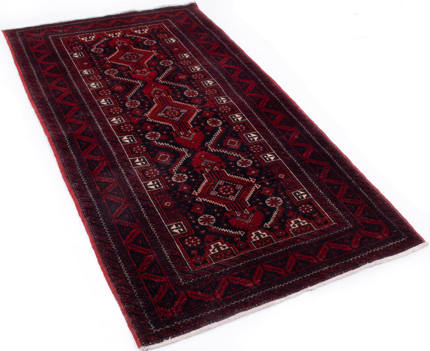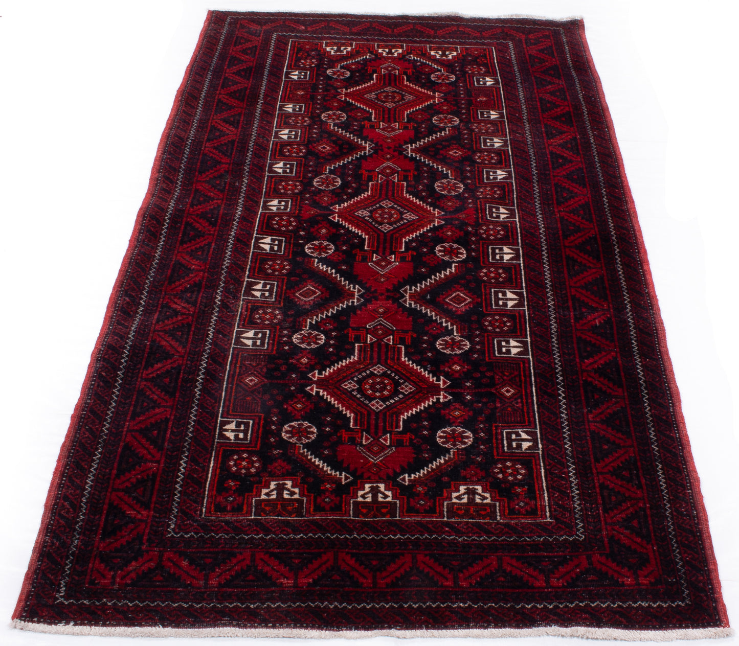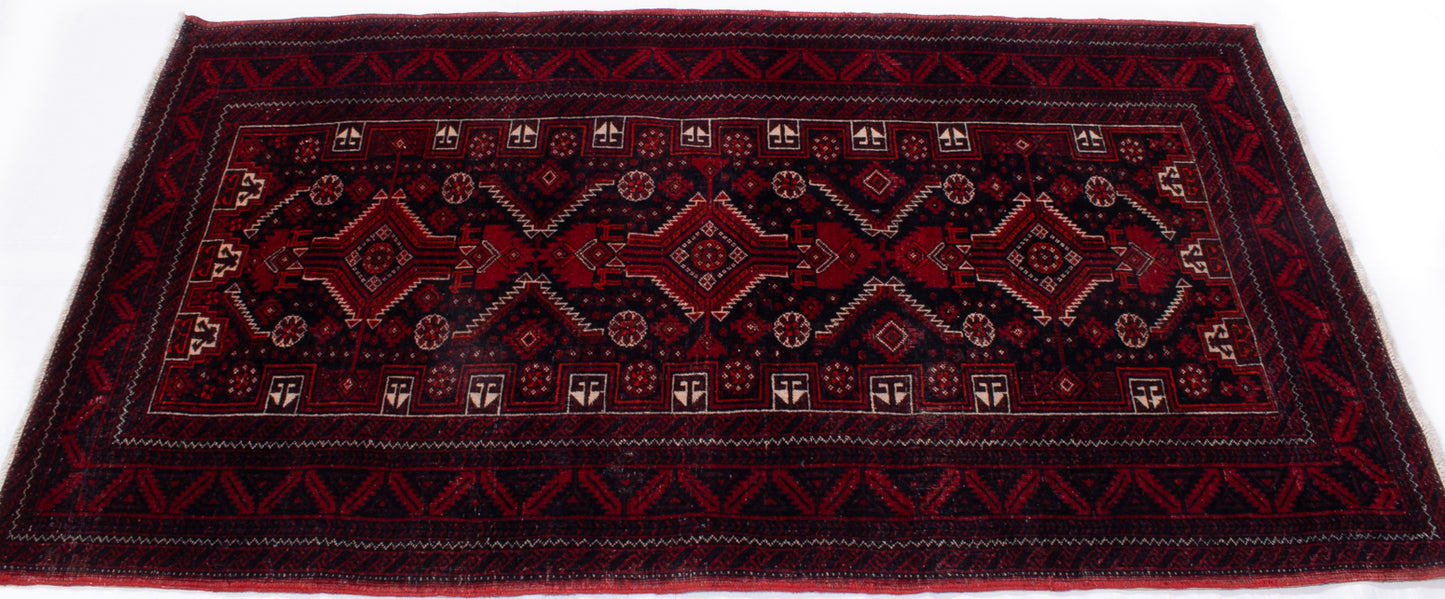 This Persian Baluch rug embodies the tribal artistry of the Baluch nomadic weavers, known for their bold geometric patterns and rich, contrasting colours. Woven in Iran, this piece features a repeat medallion design, with centrally aligned diamond motifs framed by angular forms, creating a striking sense of symmetry and movement. The deep red and black palette, accented with white and dark brown, enhances its vivid visual impact, making it a compelling addition to any space.