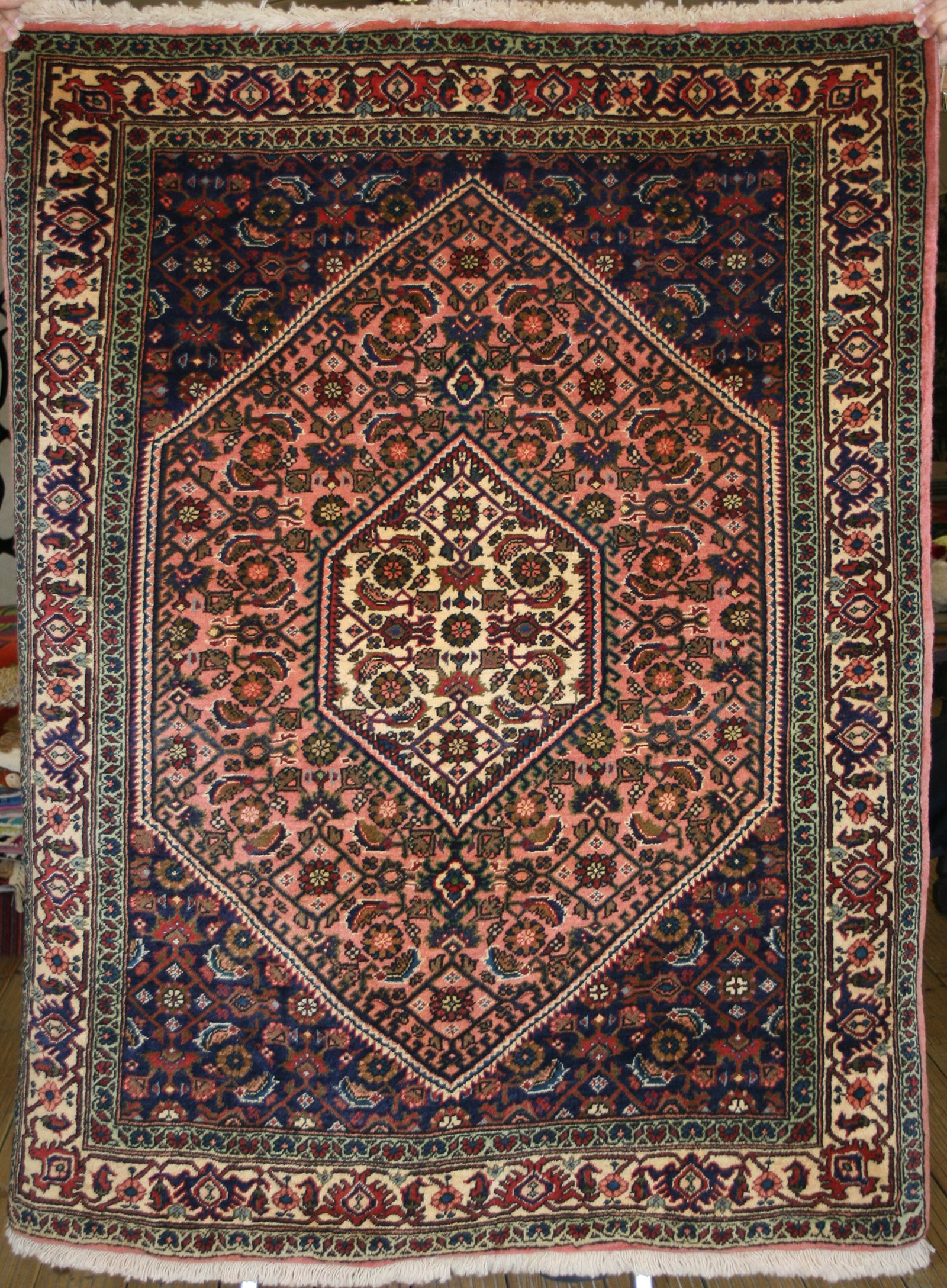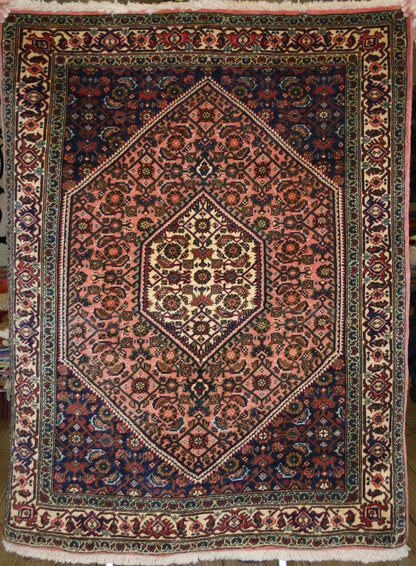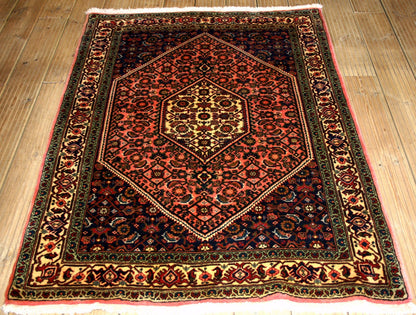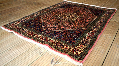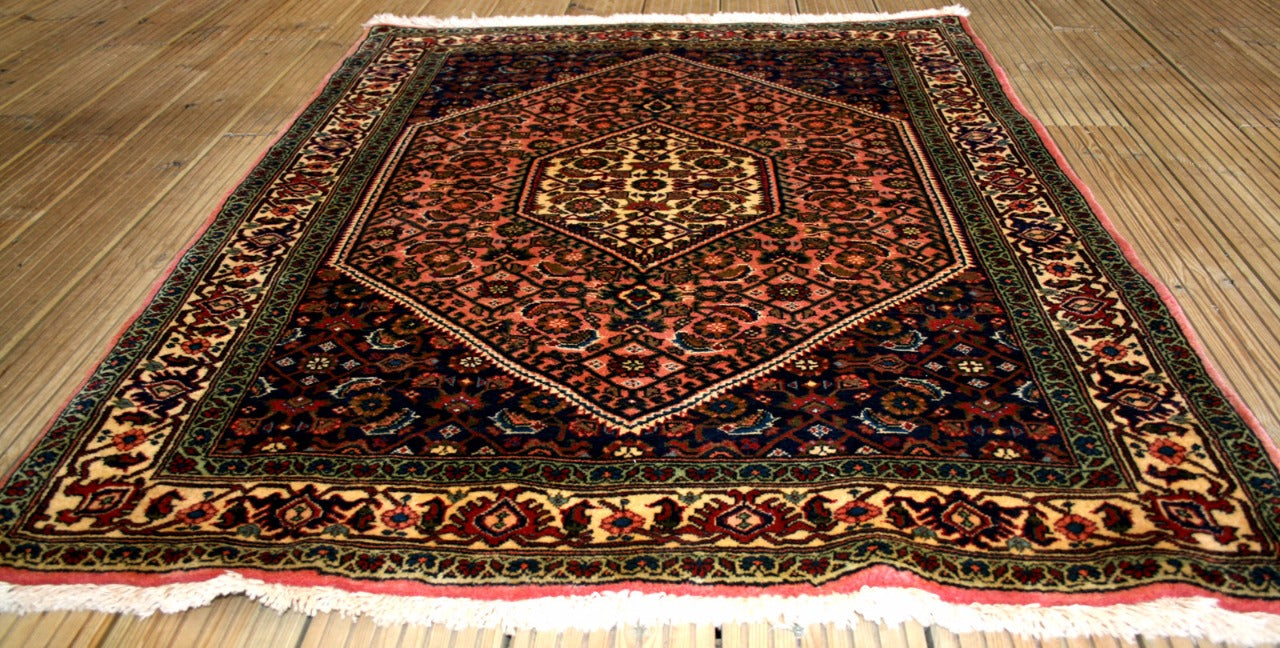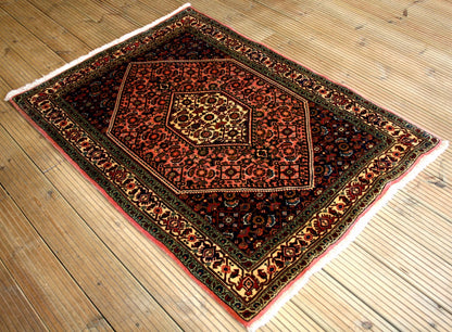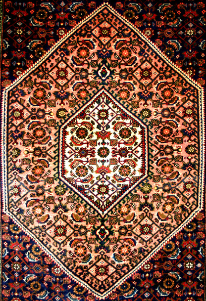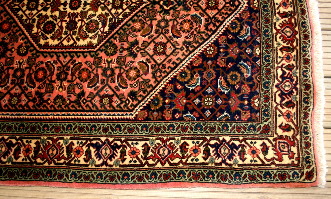 Hand-knotted in the historic town of Bijar, this Persian rug embodies the resilience and artistry for which Bijar weavings are renowned. Its hexagonal medallion sits boldly at the centre of a salmon-pink field, surrounded by rosettes, palmettes, and diamond motifs that balance geometric strength with floral grace.