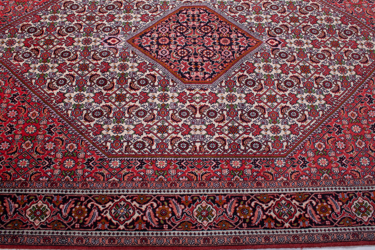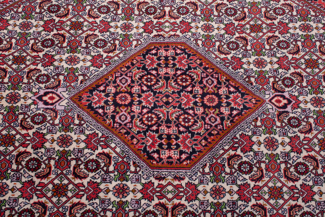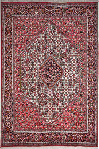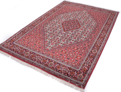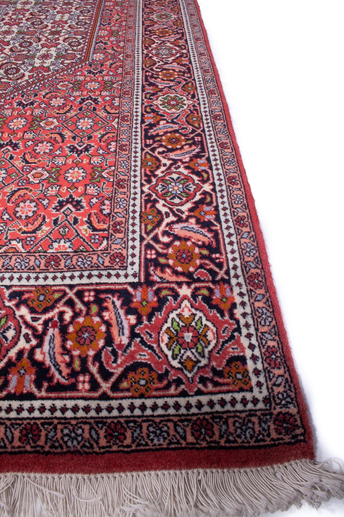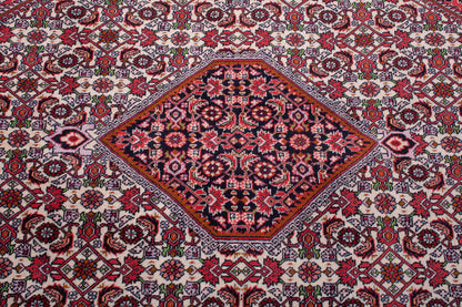 Hand-knotted in the legendary weaving town of Bijar, this Persian rug embodies durability and intricate design, earning its reputation as the “Iron Rug of Persia.” Its bold, diamond-shaped medallion rests within a field of Herati motifs and floral rosettes, framed by a rich interplay of crimson, ivory, and emerald tones.