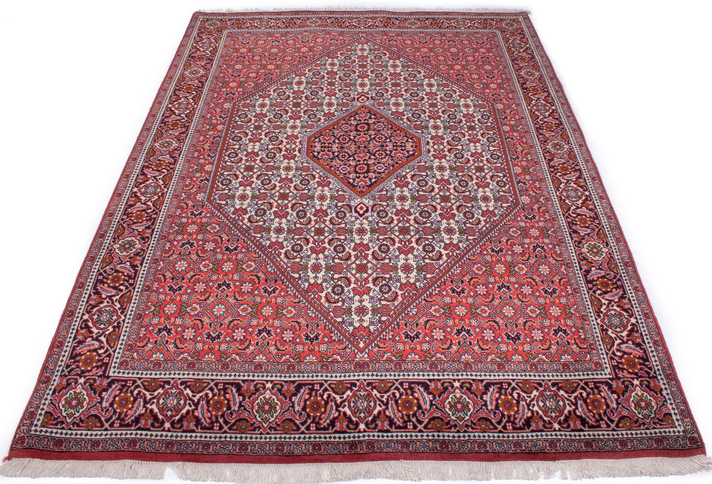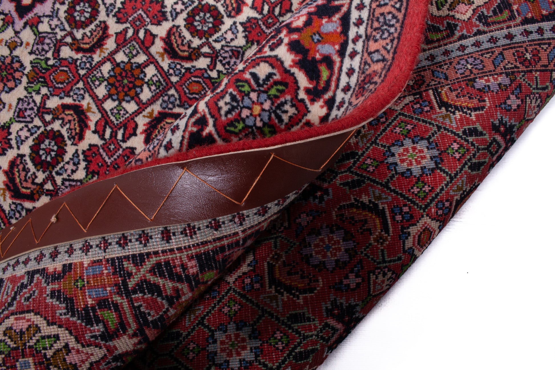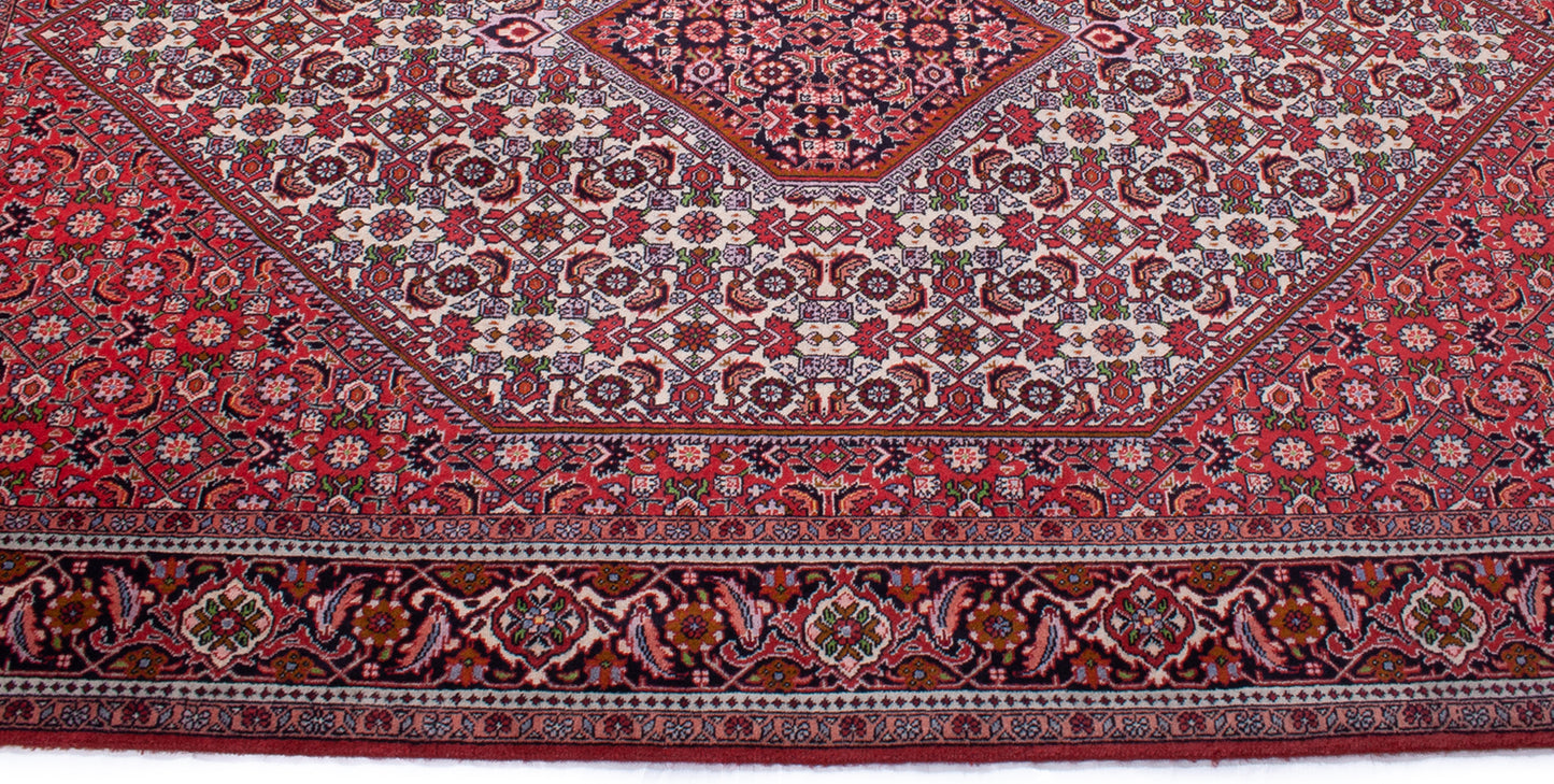 Hand-knotted in the legendary weaving town of Bijar, this Persian rug embodies durability and intricate design, earning its reputation as the “Iron Rug of Persia.” Its bold, diamond-shaped medallion rests within a field of Herati motifs and floral rosettes, framed by a rich interplay of crimson, ivory, and emerald tones.