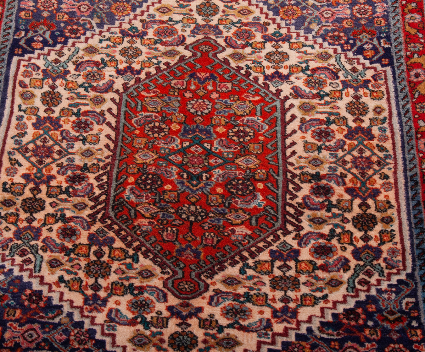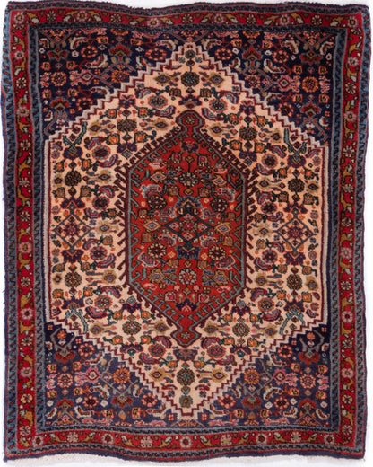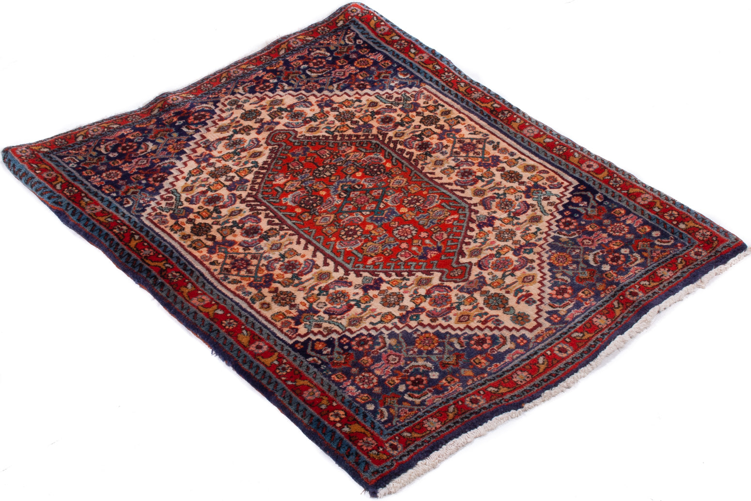 The design features a striking central medallion, set against a rich red field adorned with stylised floral and geometric motifs. The deep blue background enhances the contrast, with ivory and green accents adding depth and intricacy. The stepped, lobed medallion extends into the field, creating a dynamic interplay of symmetry and movement.
