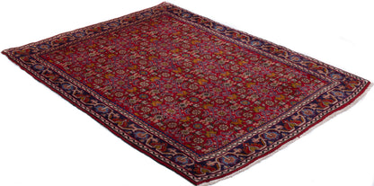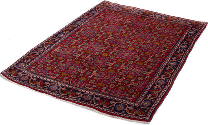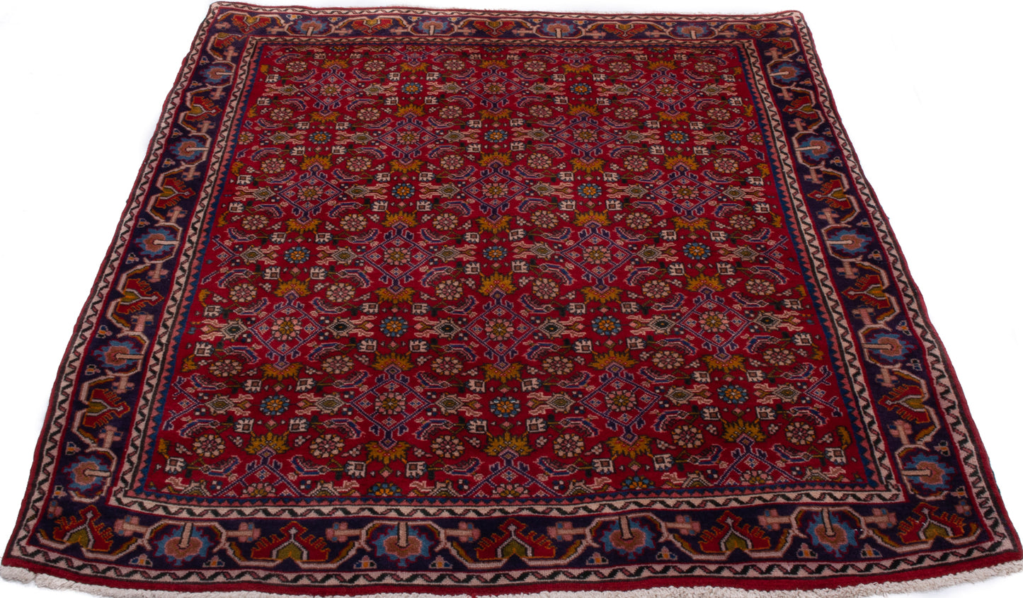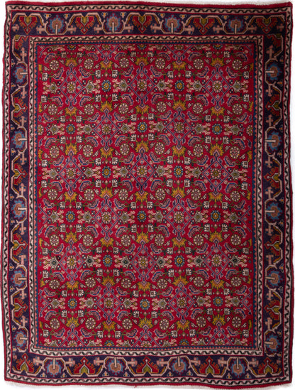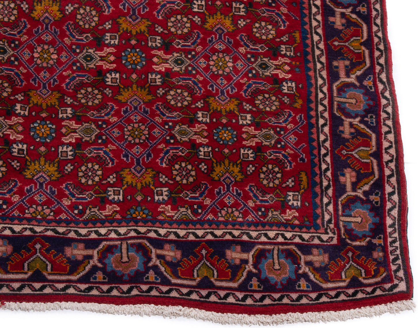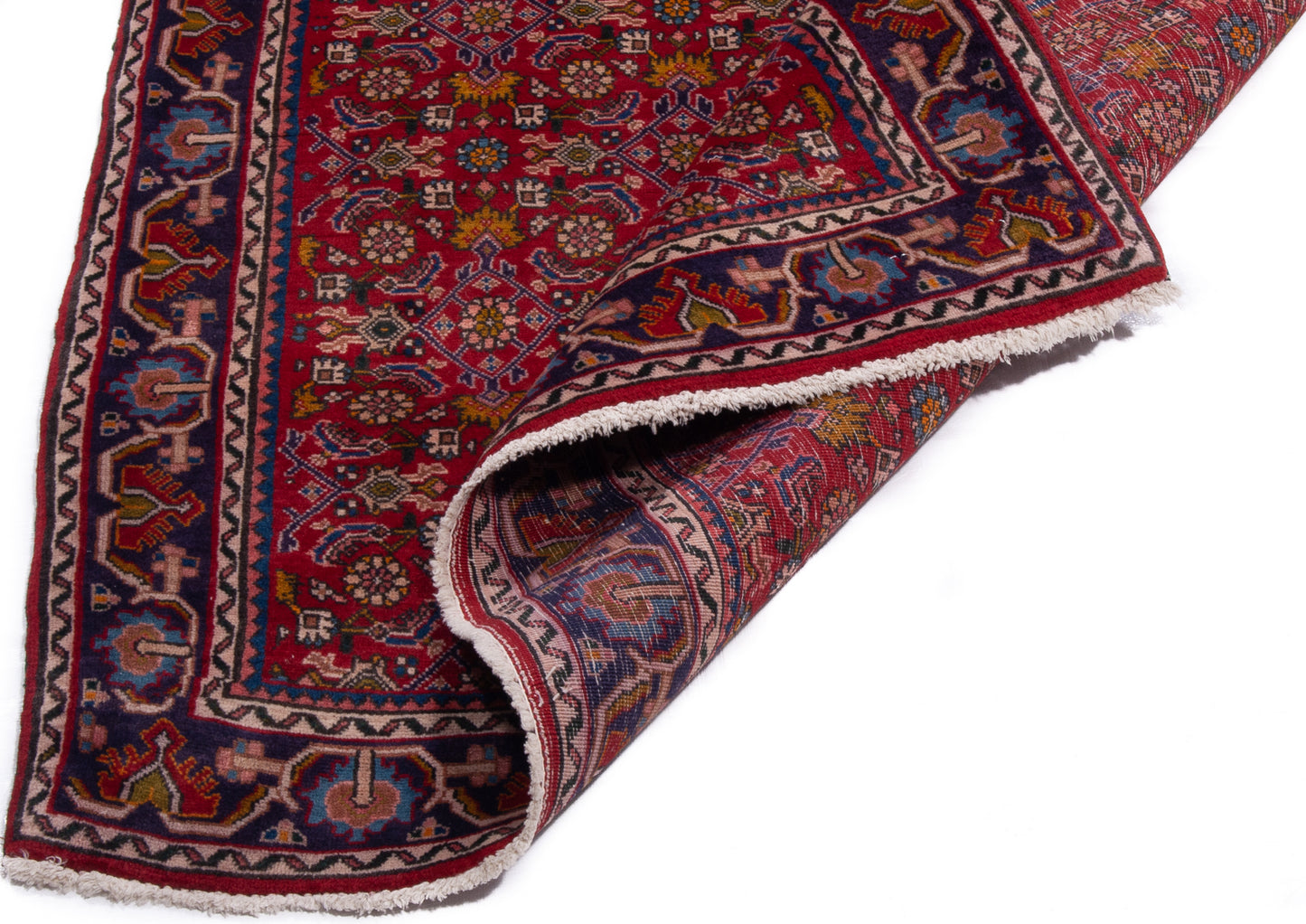 This traditional Persian Bijar Rug features an intricate all-over medallion design with a geometric pattern. Hand-knotted in Iran, it is crafted with a cotton foundation and wool pile in red, blue, and yellow colors. It is a rectangular shape, perfect for adding a touch of beauty to any home.
