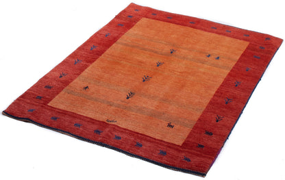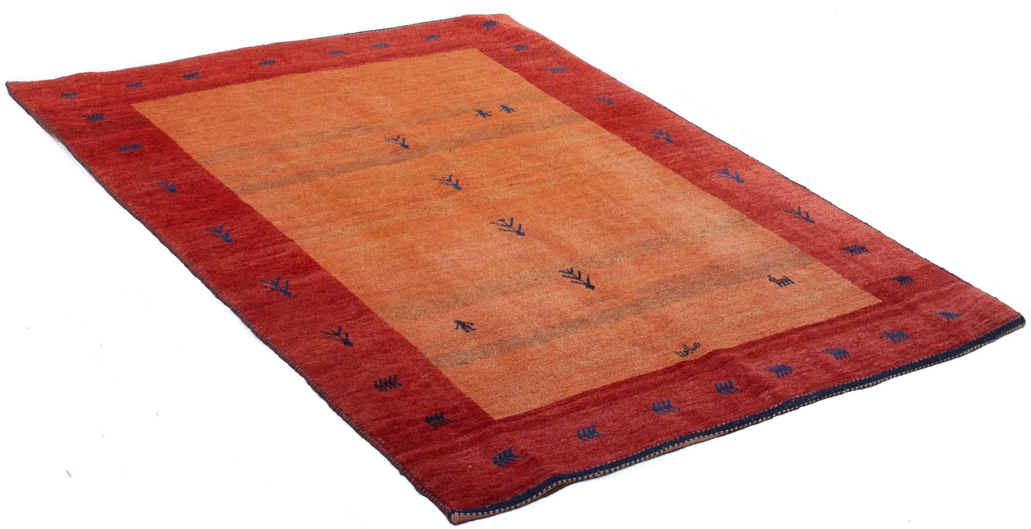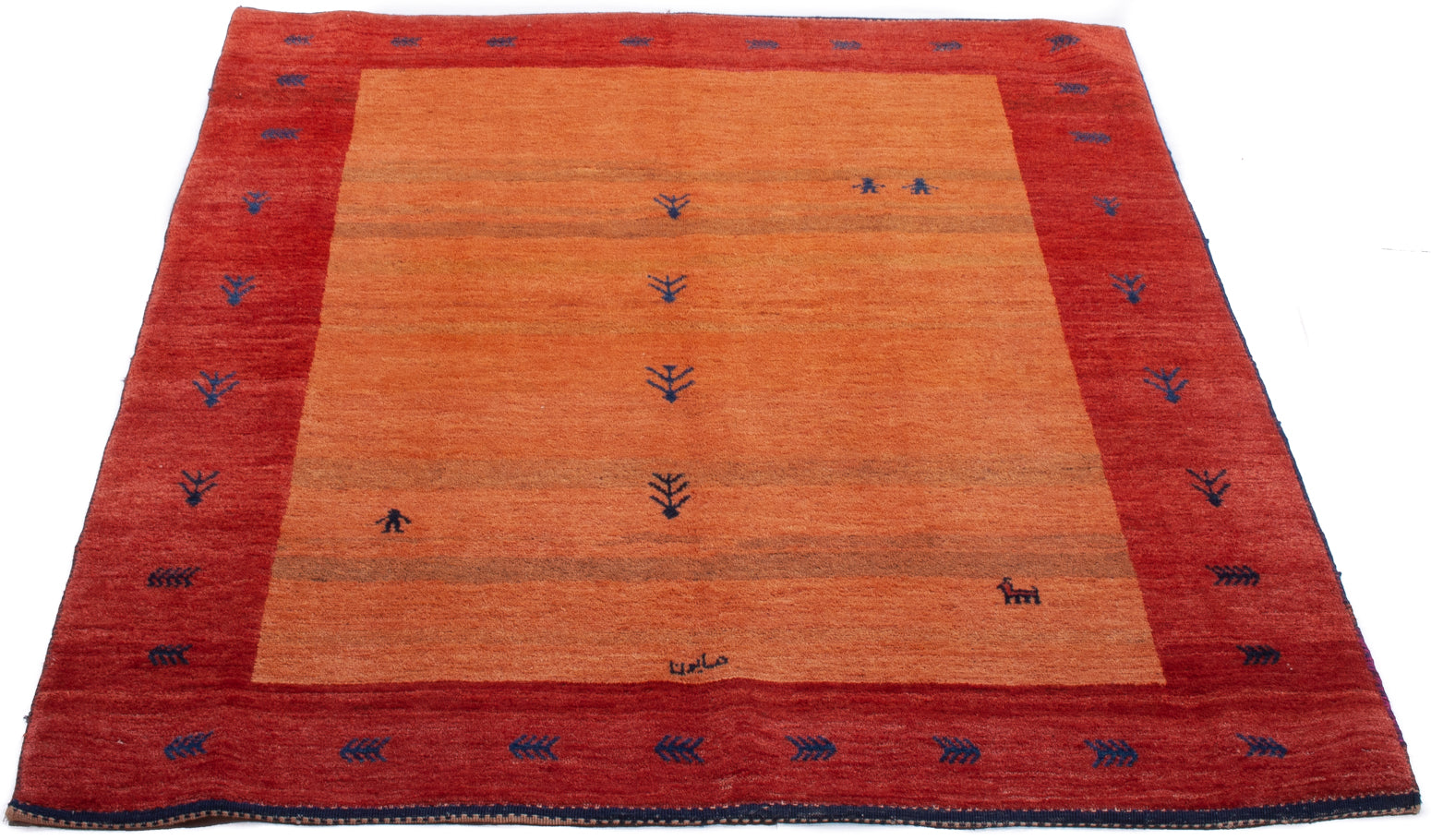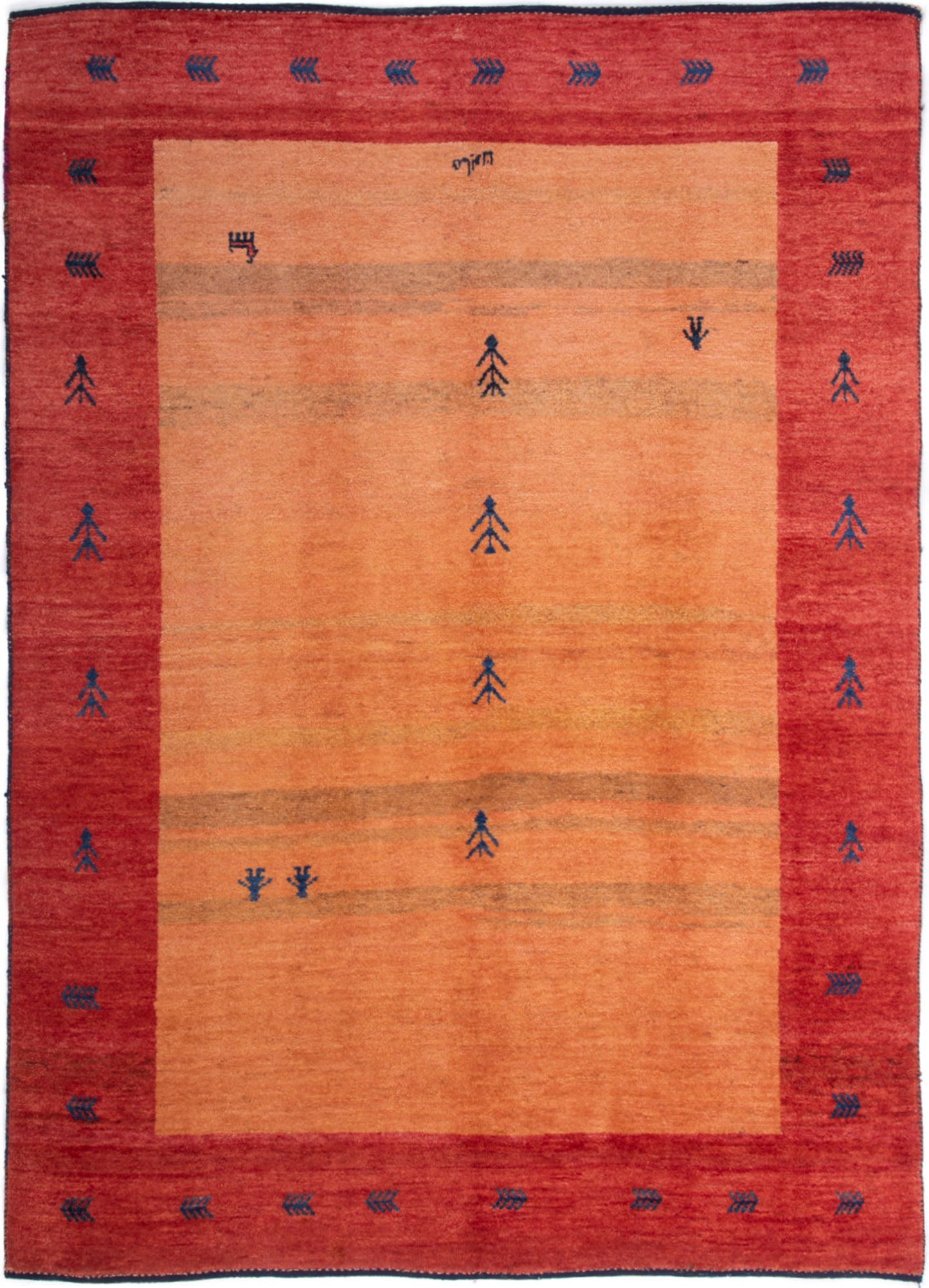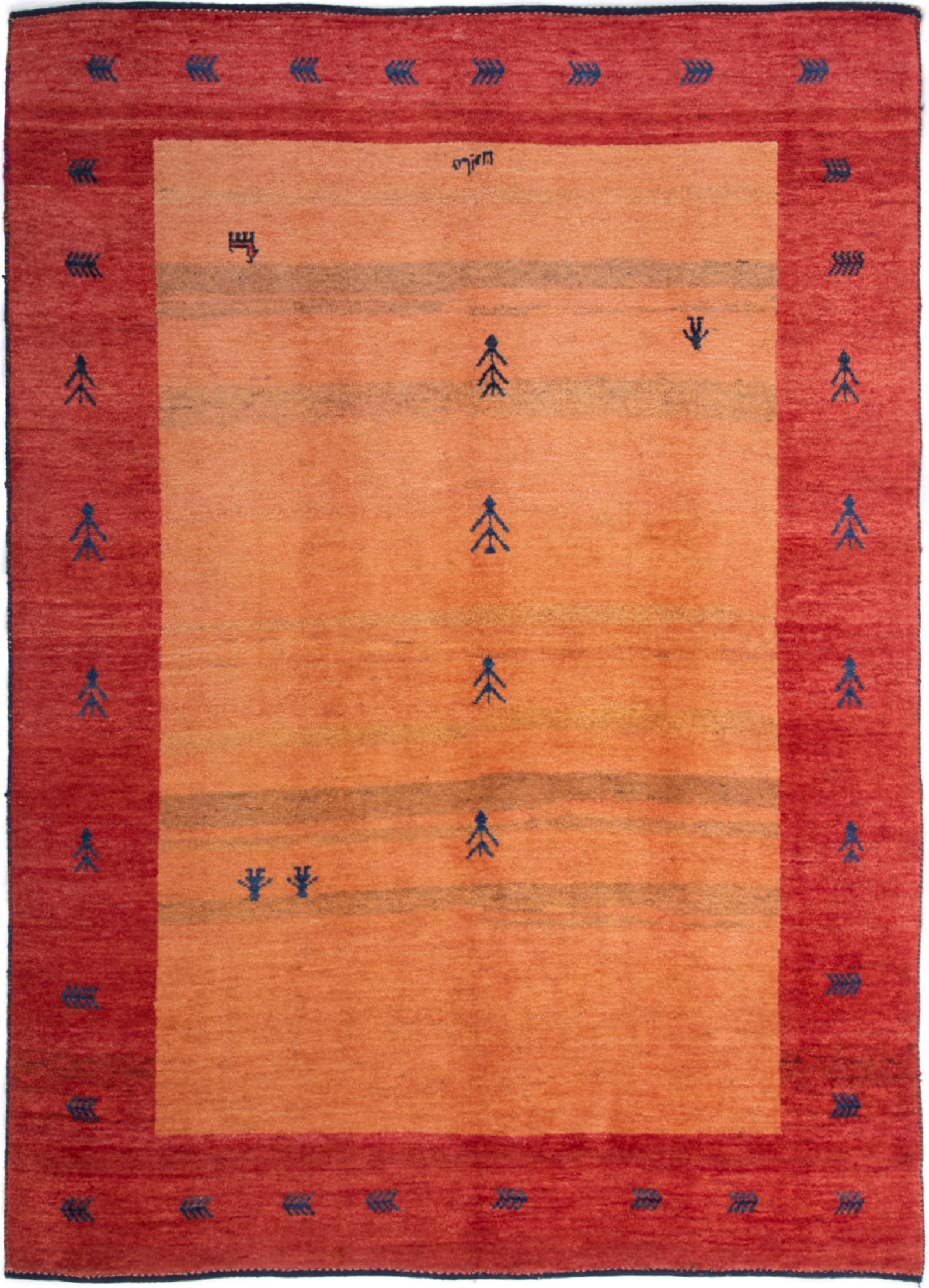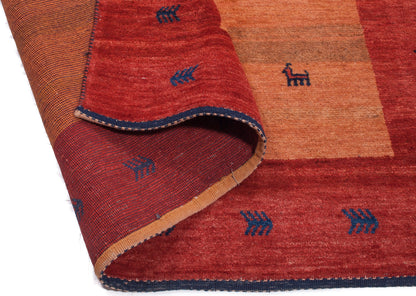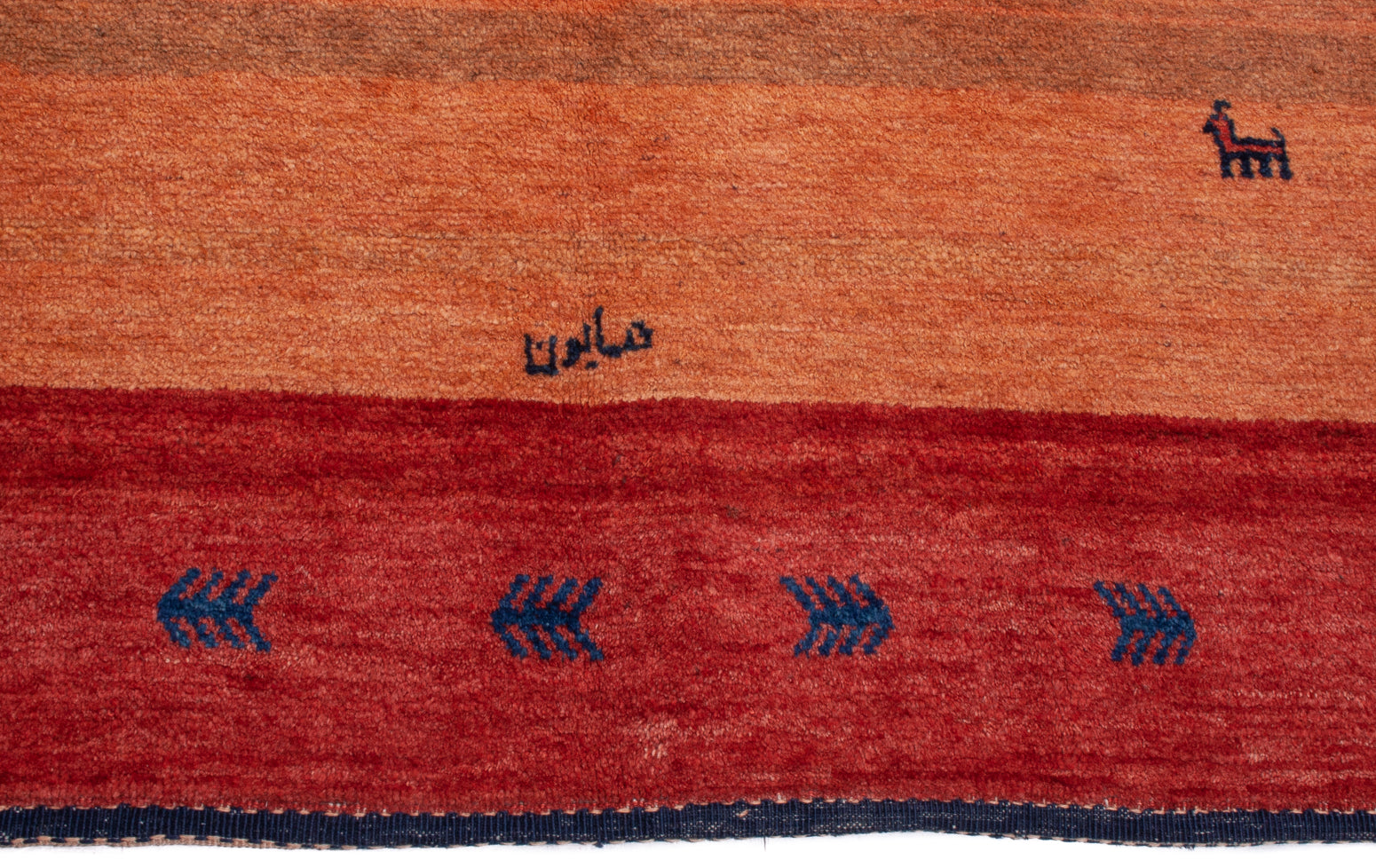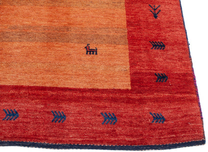 This authentic Persian Gabbeh Rug features a modern design in amber, blue, and terracotta colors, with an intricate 100% wool pile and wool foundation. Hand-knotted in Iran, its rectangular shape adds a beautiful accent to any home. Get the beautiful look and feel of quality craftsmanship with this stunning rug.