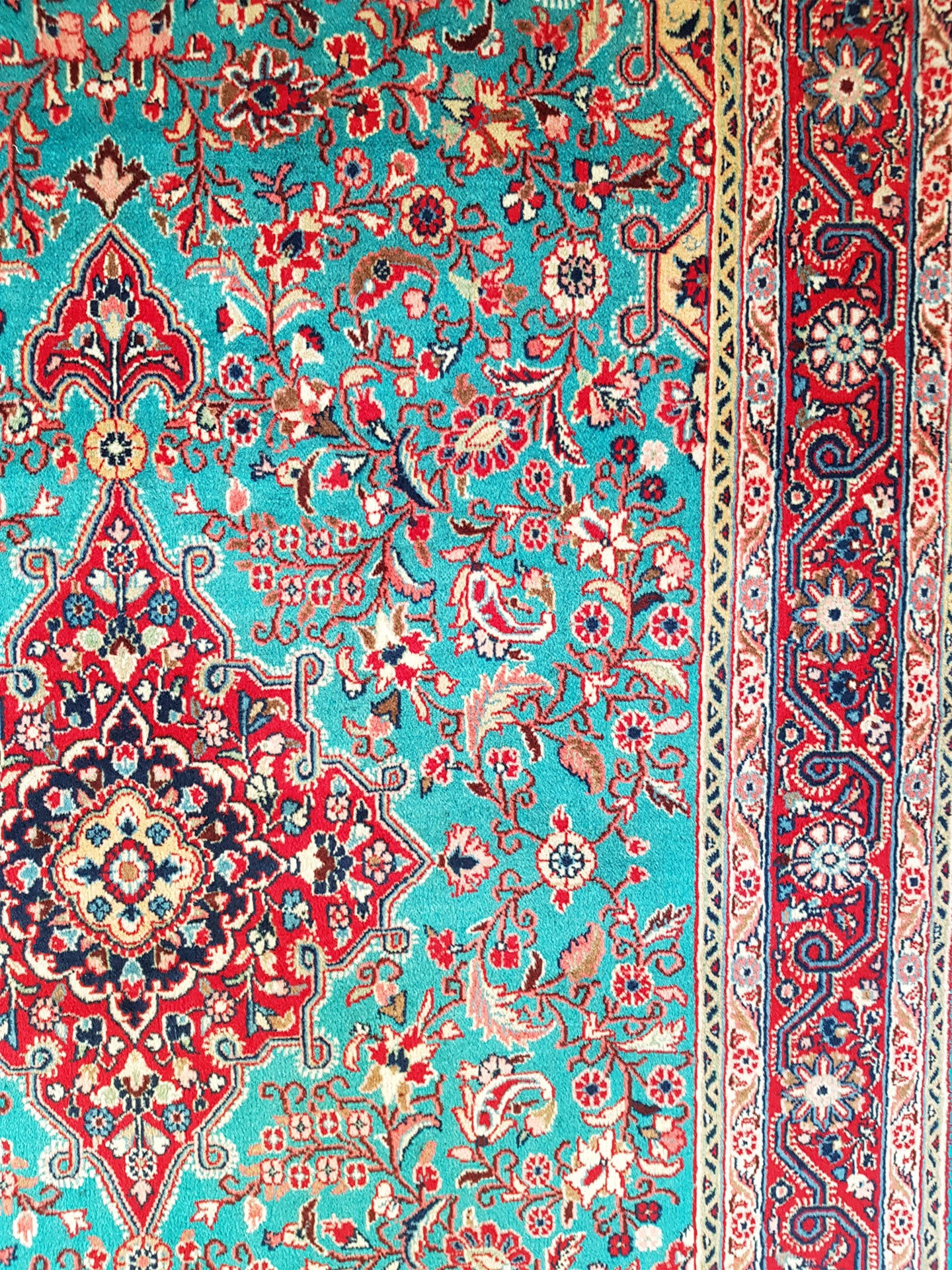 Hand-knotted in Hamadan, Iran, this Persian rug embodies the bold elegance of village weaving. Its geometric medallion sits proudly on a turquoise field, framed by scrolling vines, palmettes, and rosettes that flow symmetrically across the surface. Ivory spandrels and soft pink accents add depth to the vibrant palette, while the crimson border—rich with floral motifs—provides a striking contrast.
