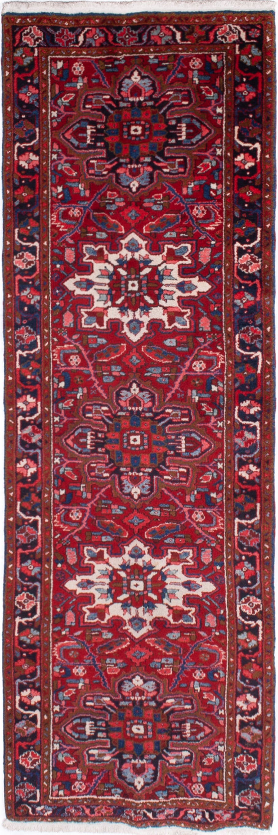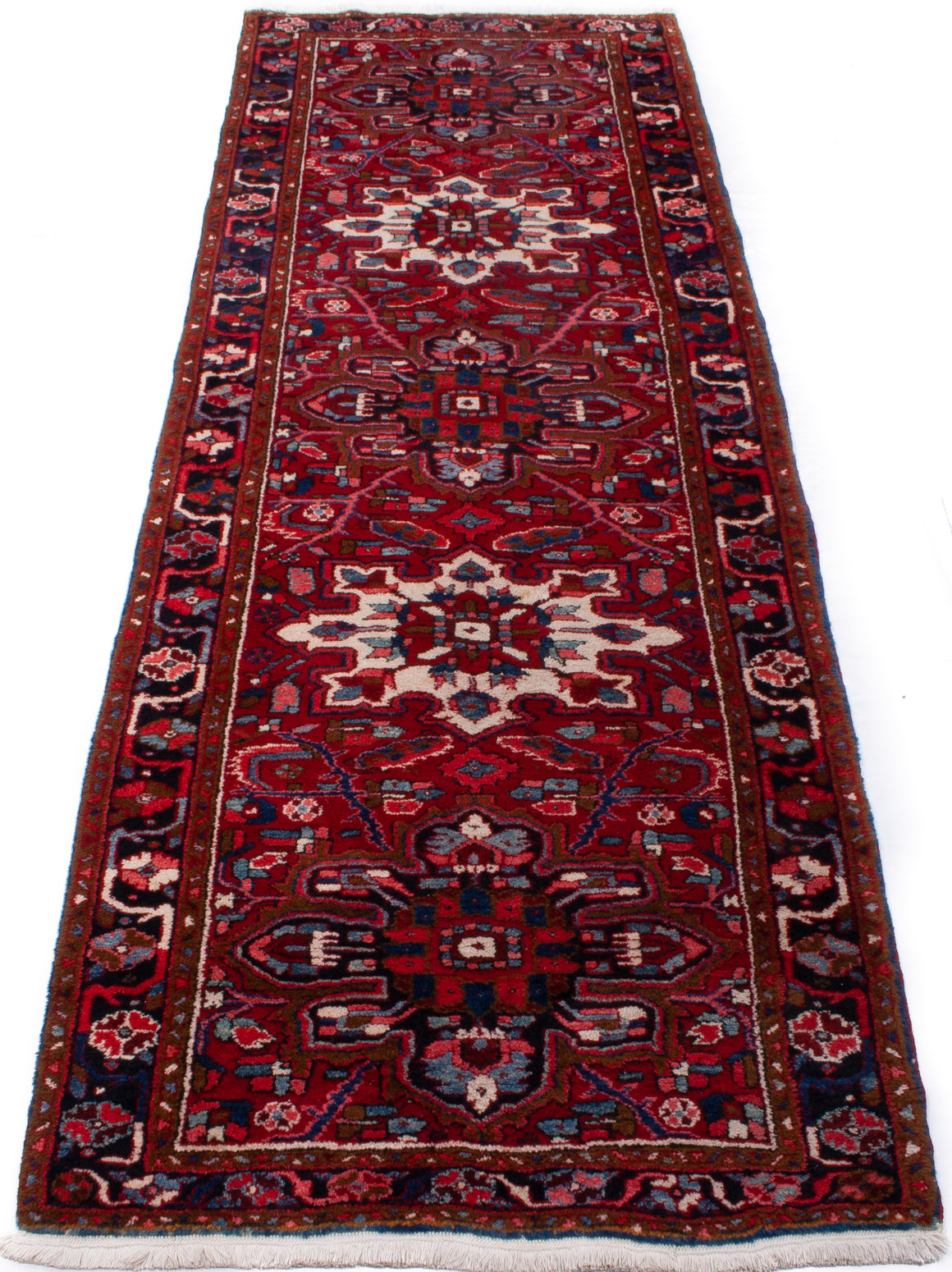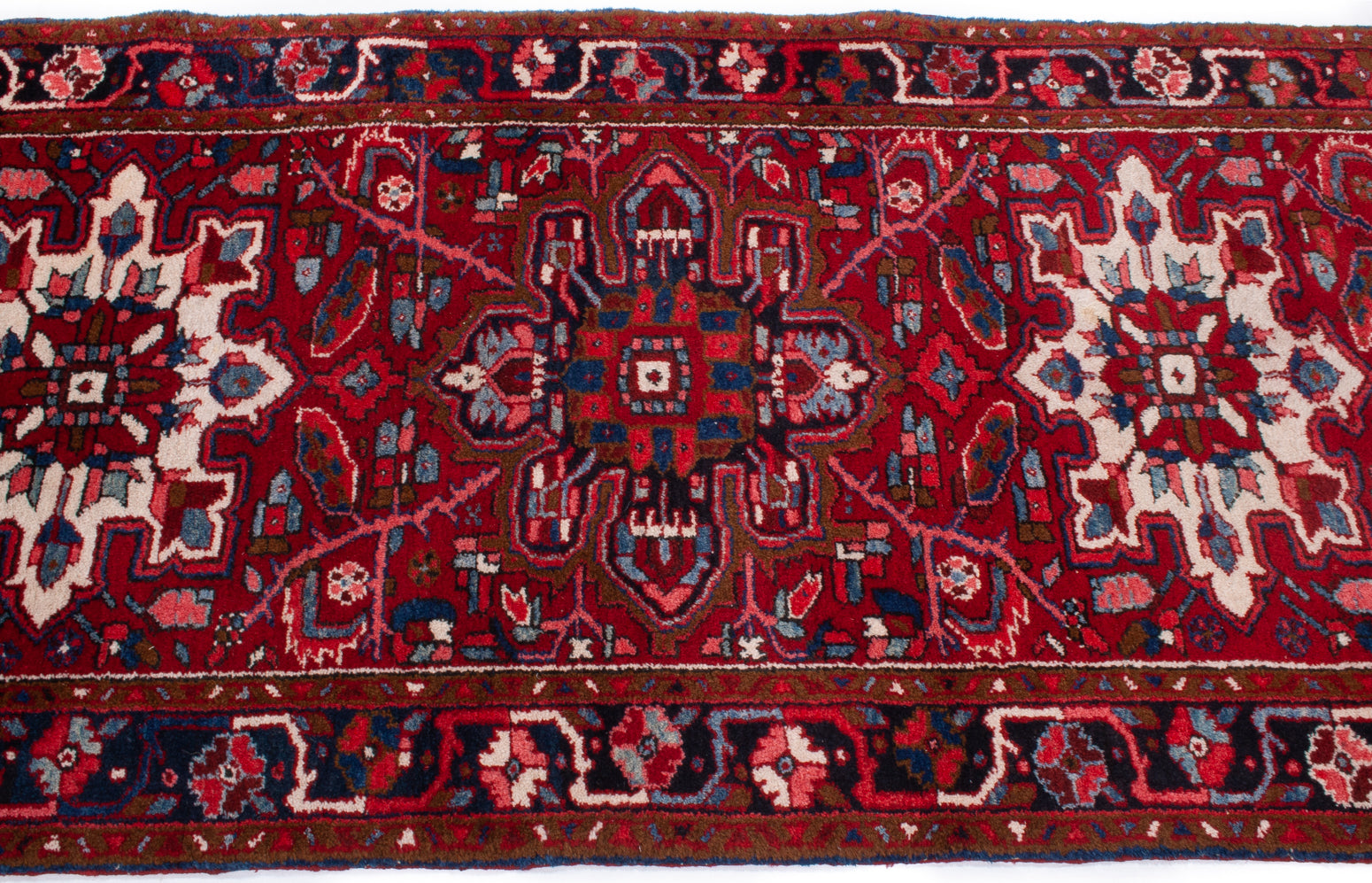 Hand-knotted in Heriz, Iran, this Persian runner embodies the bold geometry and enduring craftsmanship for which Heriz rugs are celebrated. A series of octagonal medallions, enriched with stylised floral elements, march along the crimson field in a strikingly symmetrical, repeat-medallion layout. Ivory and navy accents lend clarity to the design, while soft pink and light blue tones add subtle variation.