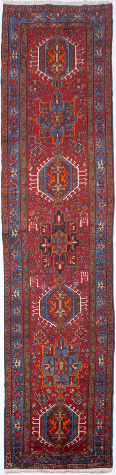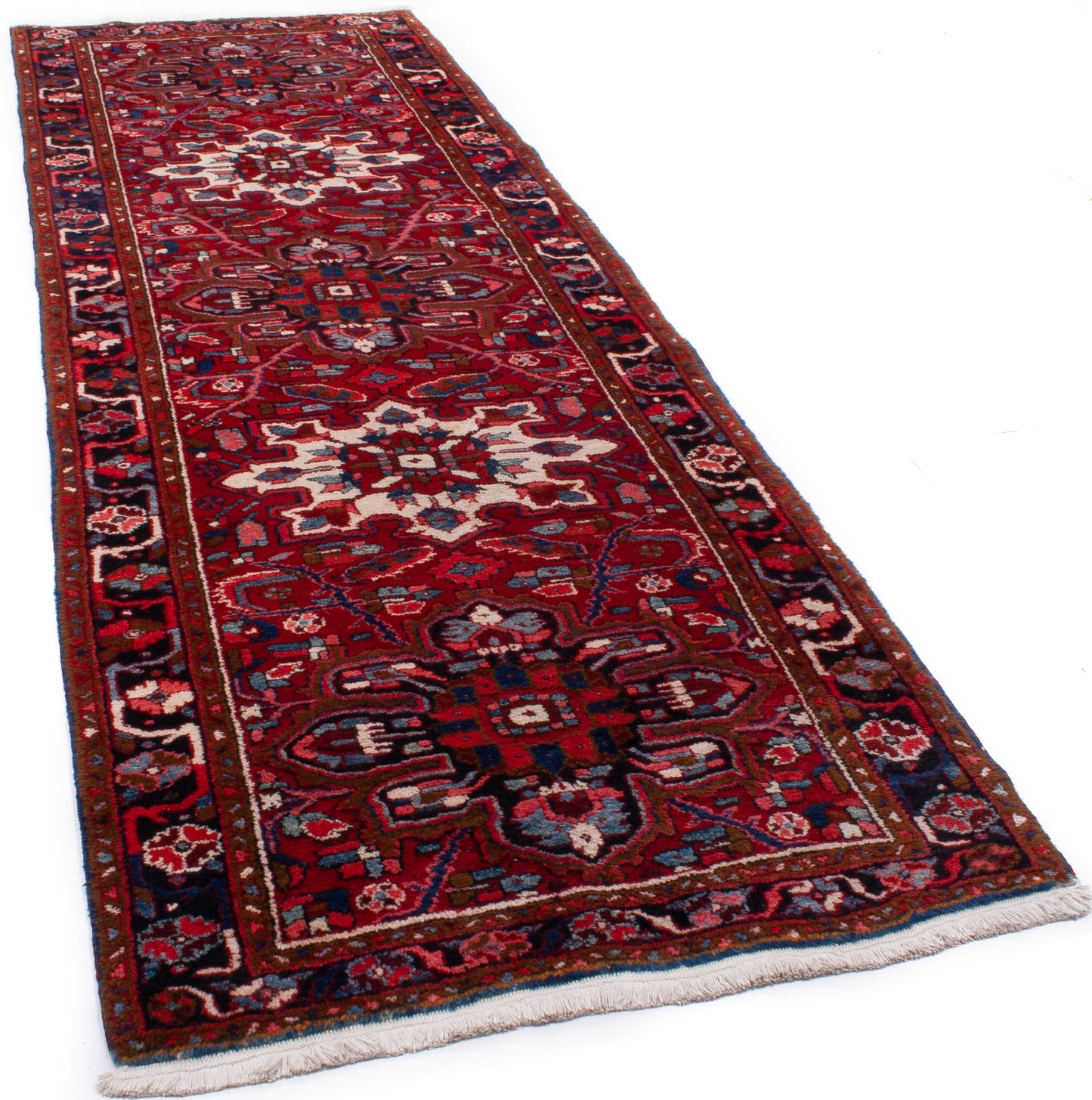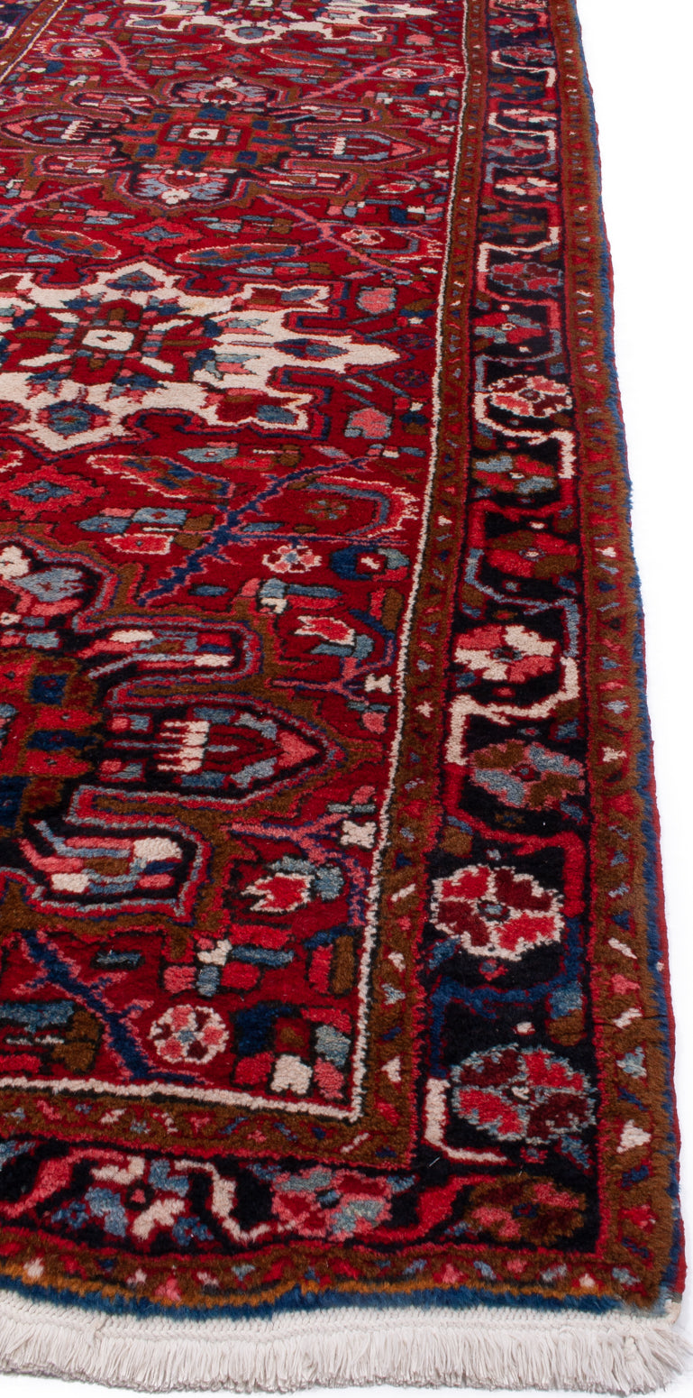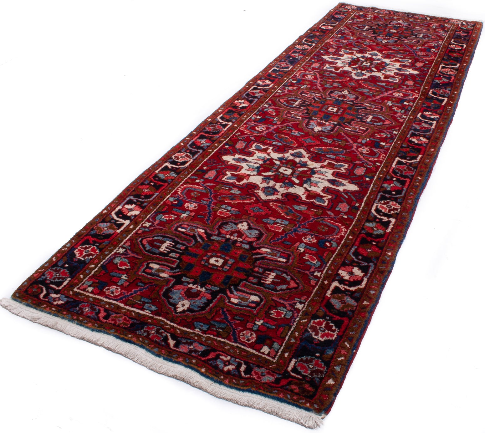 Hand-knotted in Heriz, Iran, this Persian runner embodies the bold geometry and enduring craftsmanship for which Heriz rugs are celebrated. A series of octagonal medallions, enriched with stylised floral elements, march along the crimson field in a strikingly symmetrical, repeat-medallion layout. Ivory and navy accents lend clarity to the design, while soft pink and light blue tones add subtle variation.