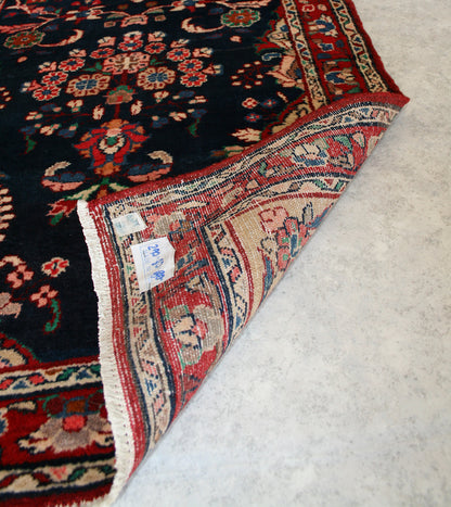 Upon observing the rug, one is immediately drawn to its intricate design featuring a captivating central medallion, surrounded by symmetrical floral motifs. The deep navy background serves as a striking canvas for the vibrant red, ivory, and touches of green that compose the ornate patterns. The border, adorned with a harmonious blend of floral and geometric elements, frames the piece beautifully, adding to its overall allure. The motifs, reminiscent of the Herati pattern, are a nod to the historical and cultural significance of Persian artistry, symbolising abundance and prosperity.