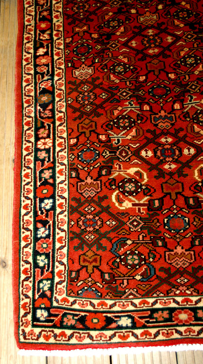 Hand-knotted in Hussainabad, Iran, this Persian runner embodies the bold intricacy of village weaving. Its all-over geometric design features octagrams, stylised floral forms, and diamond motifs, arranged in a mirrored, repeat medallion layout that creates a striking sense of rhythm and symmetry.