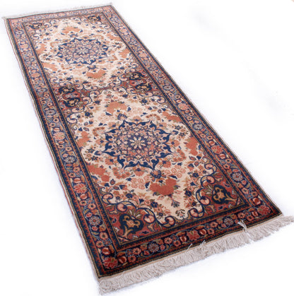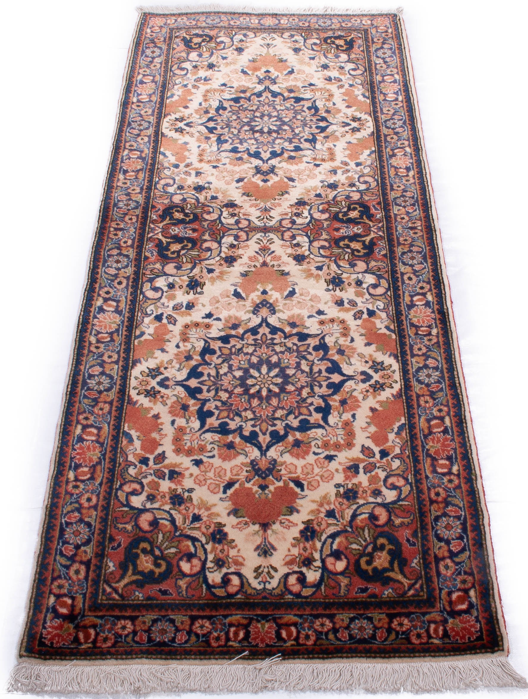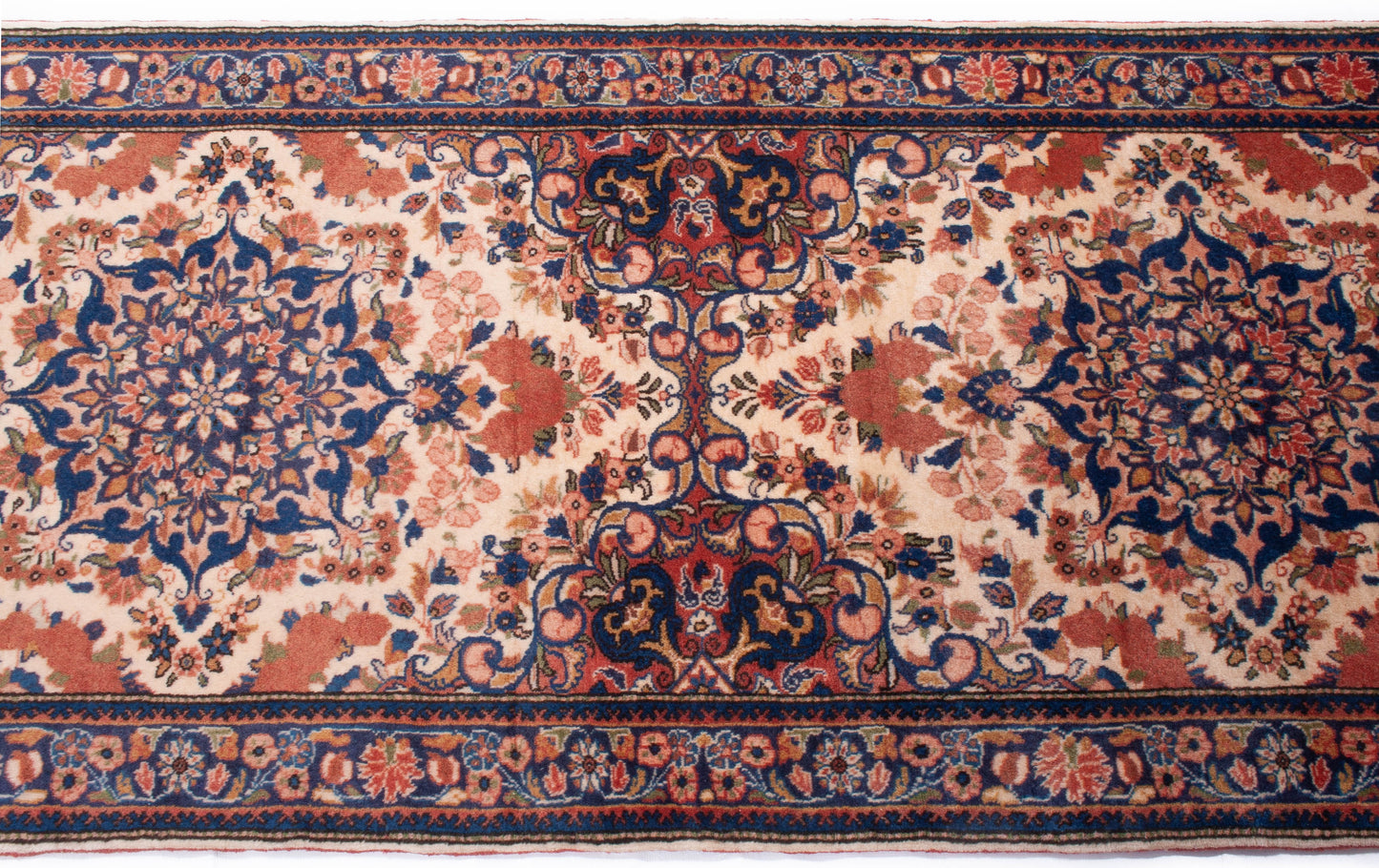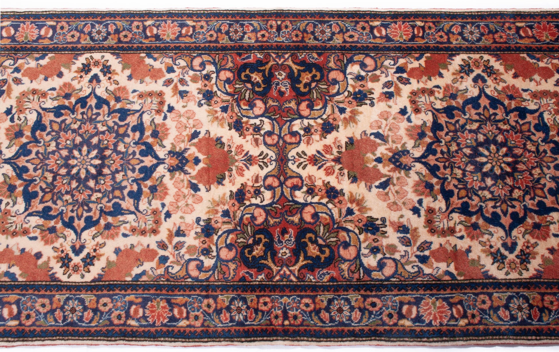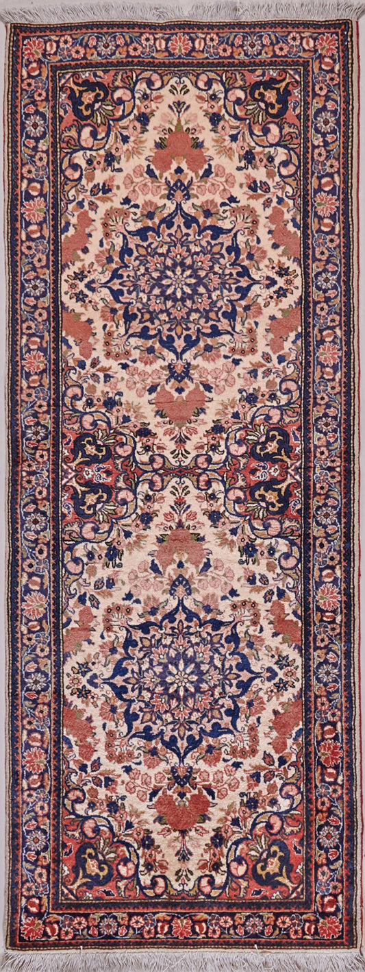 Hand-knotted in Jozan, Iran, this Persian runner reflects the enduring elegance of classical design. Its repeat medallion layout, anchored by geometric floral medallions, is enriched with Shah Abbasi motifs, palmettes, and rosettes—woven in a mirrored, flowing arrangement that speaks to the region’s refined aesthetic.