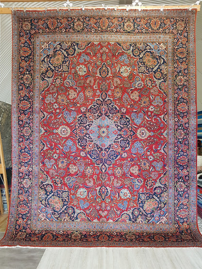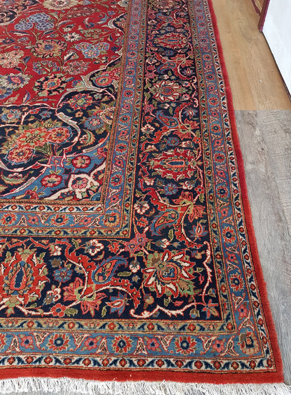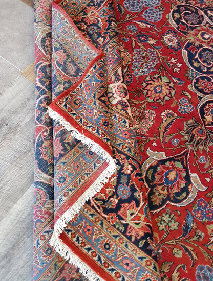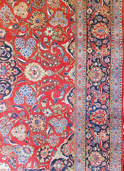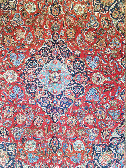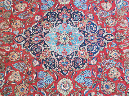 Hand-knotted in the historic city of Kashan, this Persian rug embodies the elegance and precision that have defined its weaving tradition for centuries. At its heart lies a lobed central medallion (Toranj), set against a rich red field and surrounded by flowing floral motifs, Shah Abbasi palmettes, and rosettes that echo across the spandrels and into the border.