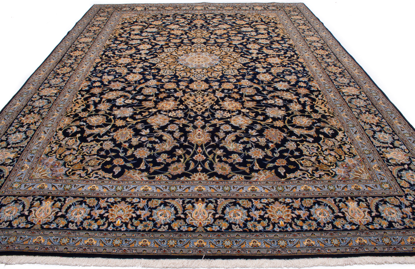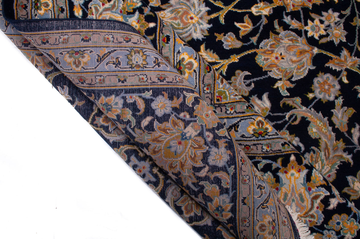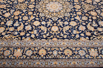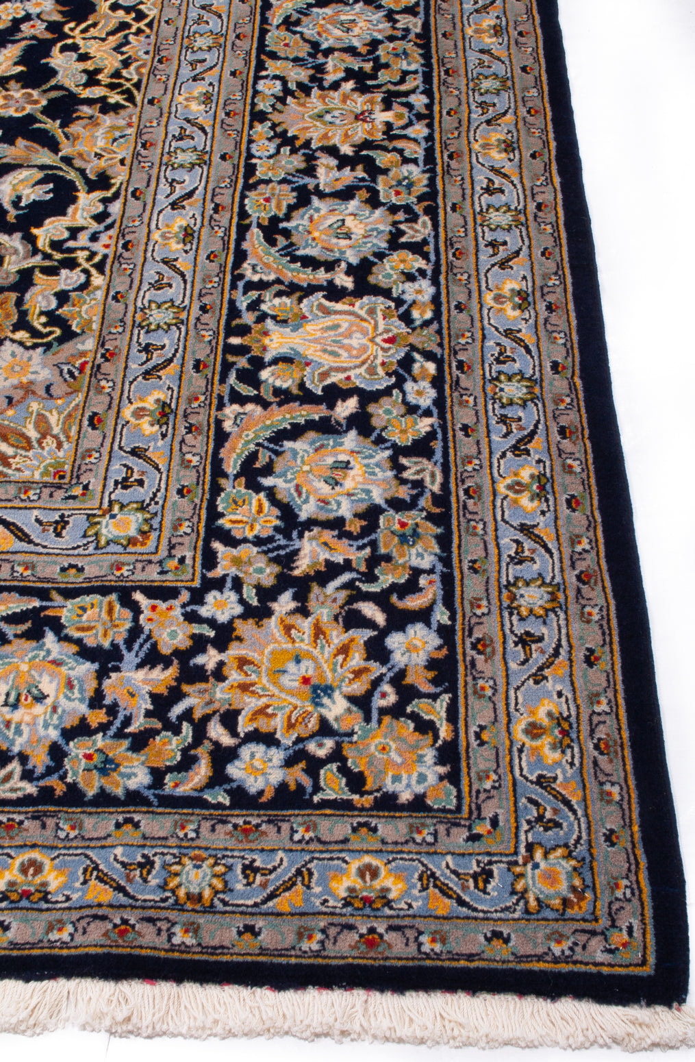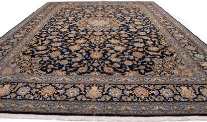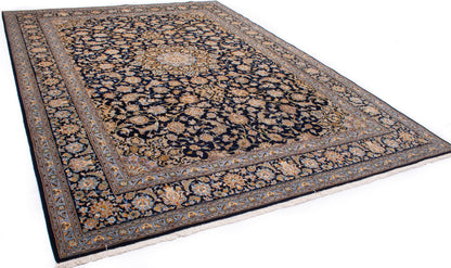 Hand-knotted in Kashan, Iran, this Persian rug exemplifies the elegance of classical design. At its heart lies a floral medallion, framed by Shah Abbasi motifs, palmettes, and rosettes that flow symmetrically across the midnight blue field. The ivory, golden beige, and soft grey tones create a striking contrast against the deep ground, while accents of peach and sage green add subtle richness.