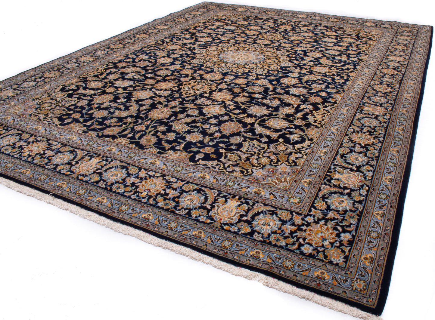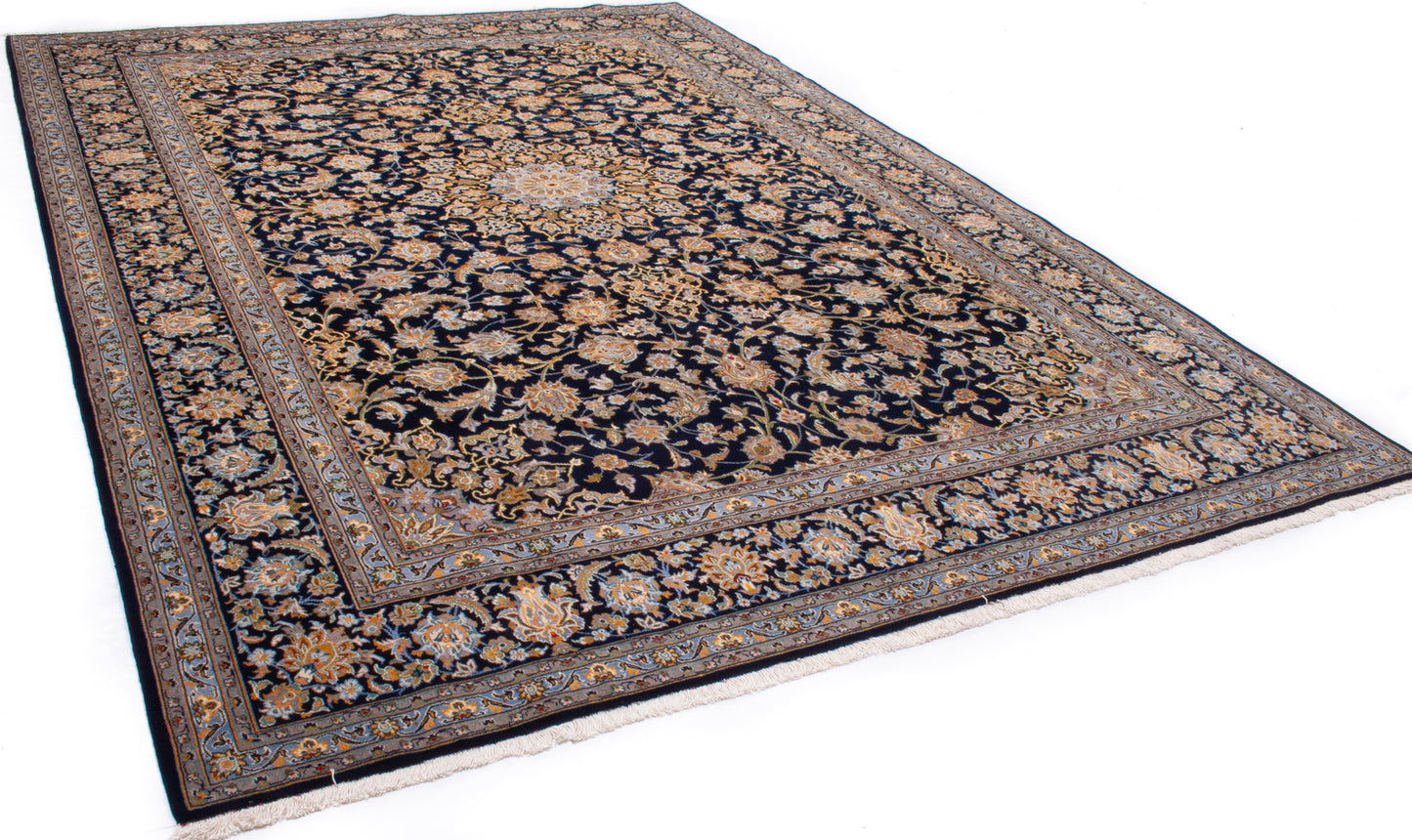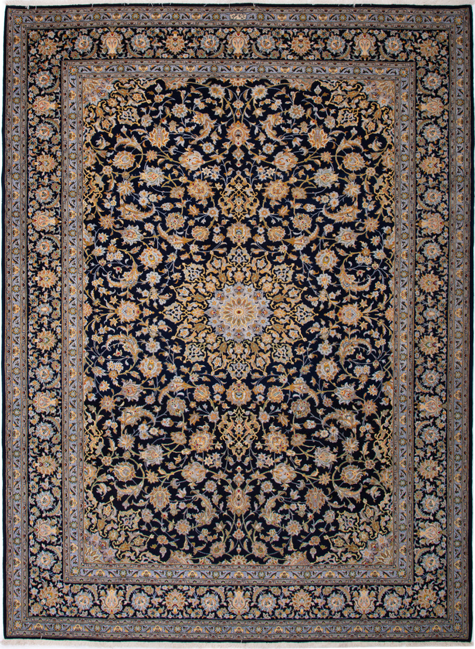 Hand-knotted in Kashan, Iran, this Persian rug exemplifies the elegance of classical design. At its heart lies a floral medallion, framed by Shah Abbasi motifs, palmettes, and rosettes that flow symmetrically across the midnight blue field. The ivory, golden beige, and soft grey tones create a striking contrast against the deep ground, while accents of peach and sage green add subtle richness.