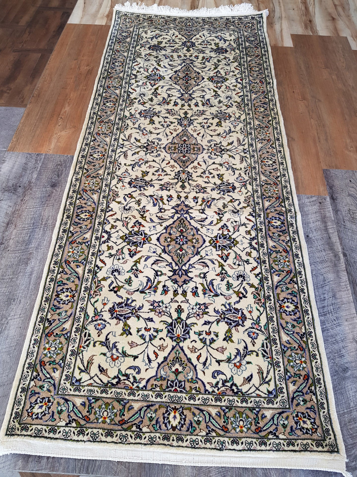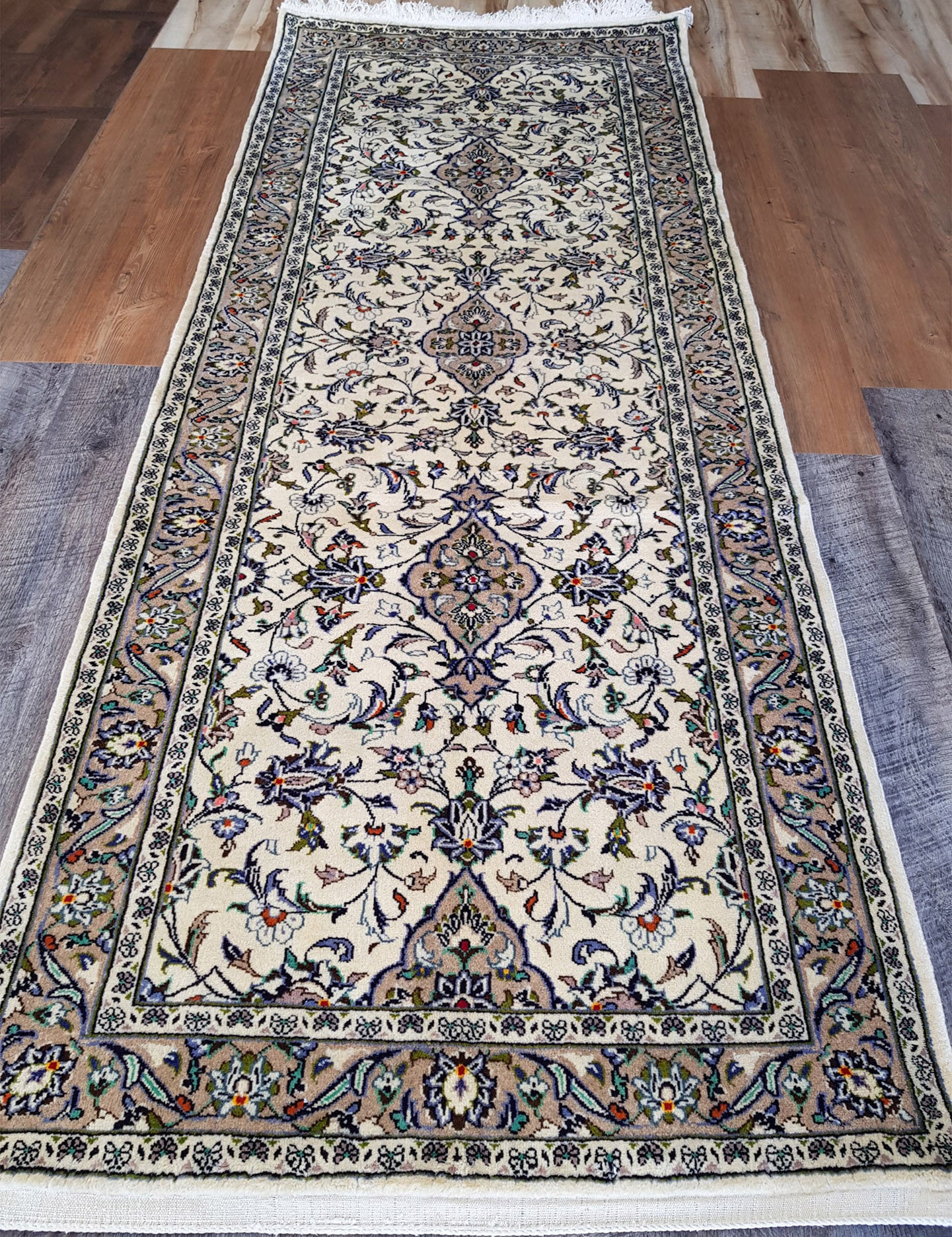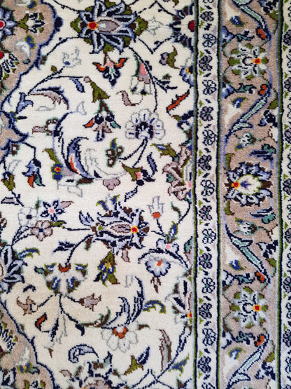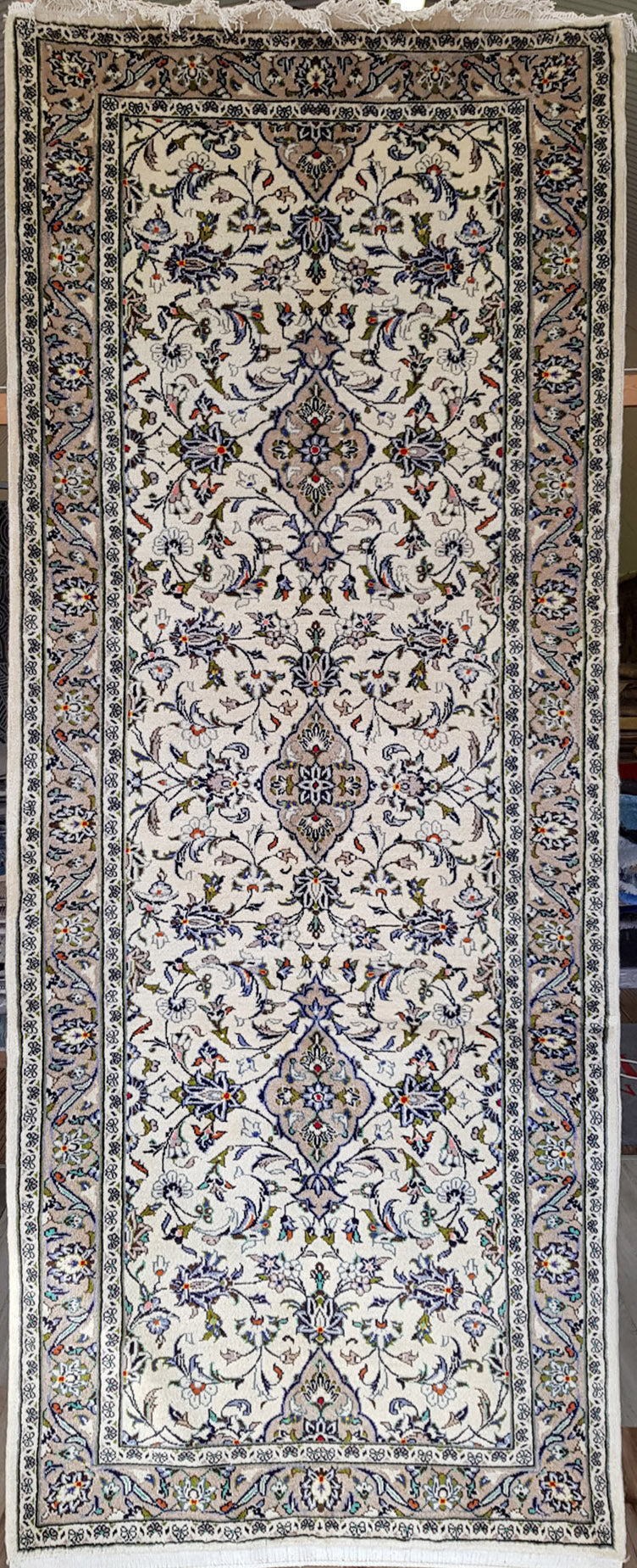Hand-knotted in Kashan, one of Persia’s most esteemed weaving centres, this runner embodies the grace and symmetry that define classical Persian design. A series of nested, lobed medallions sits at its heart, surrounded by palmettes, rosettes, and scrolling vines that flow across the ivory field in a balanced, floral arrangement.